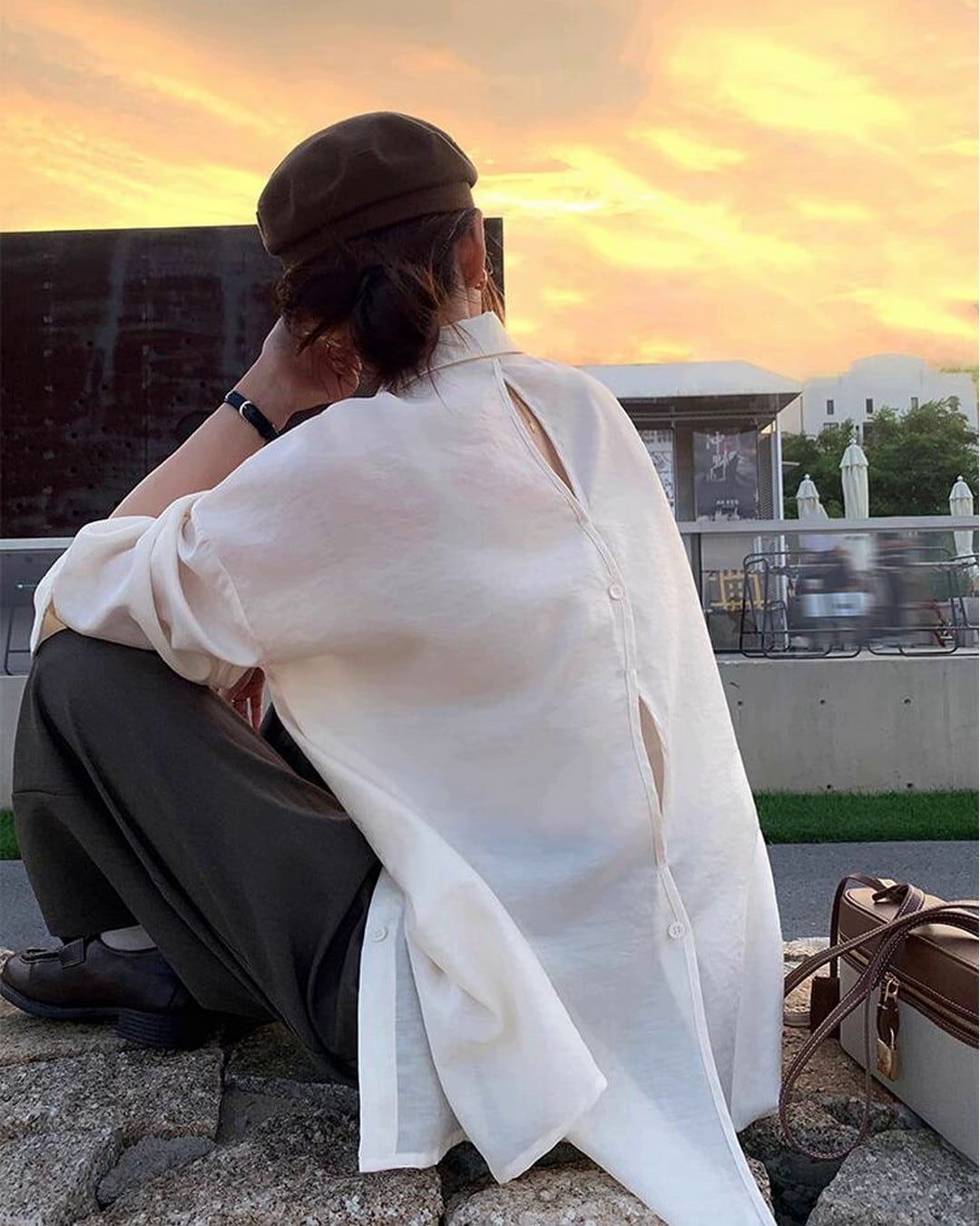 後ろ姿にこだわったデザインが際立つ一着。背中部分にあしらわれたウェーブデザインが、シンプルながらも個性的な印象を与えます。カジュアルでもフォーマルでも対応可能な一着なので、さまざまなシーンで活躍します。