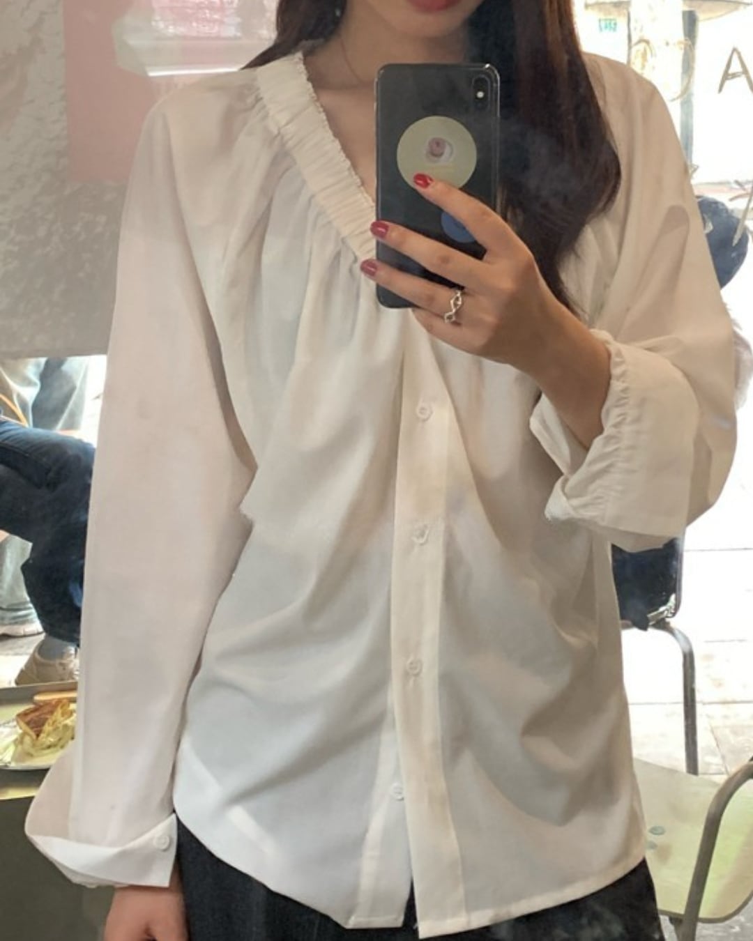 リラックス感のあるVネックデザインにギャザーが施され、女性らしさを引き立てます。カジュアルからビジネスシーンまで幅広く活躍する、シンプルながらもお洒落なシャツ。 シンプルなコーディネートでも一際目を引くデザインで、あなたのスタイルに華を添えること間違いなしのアイテムです。