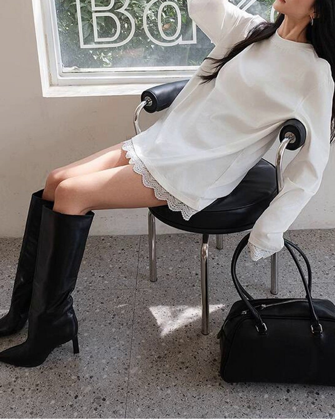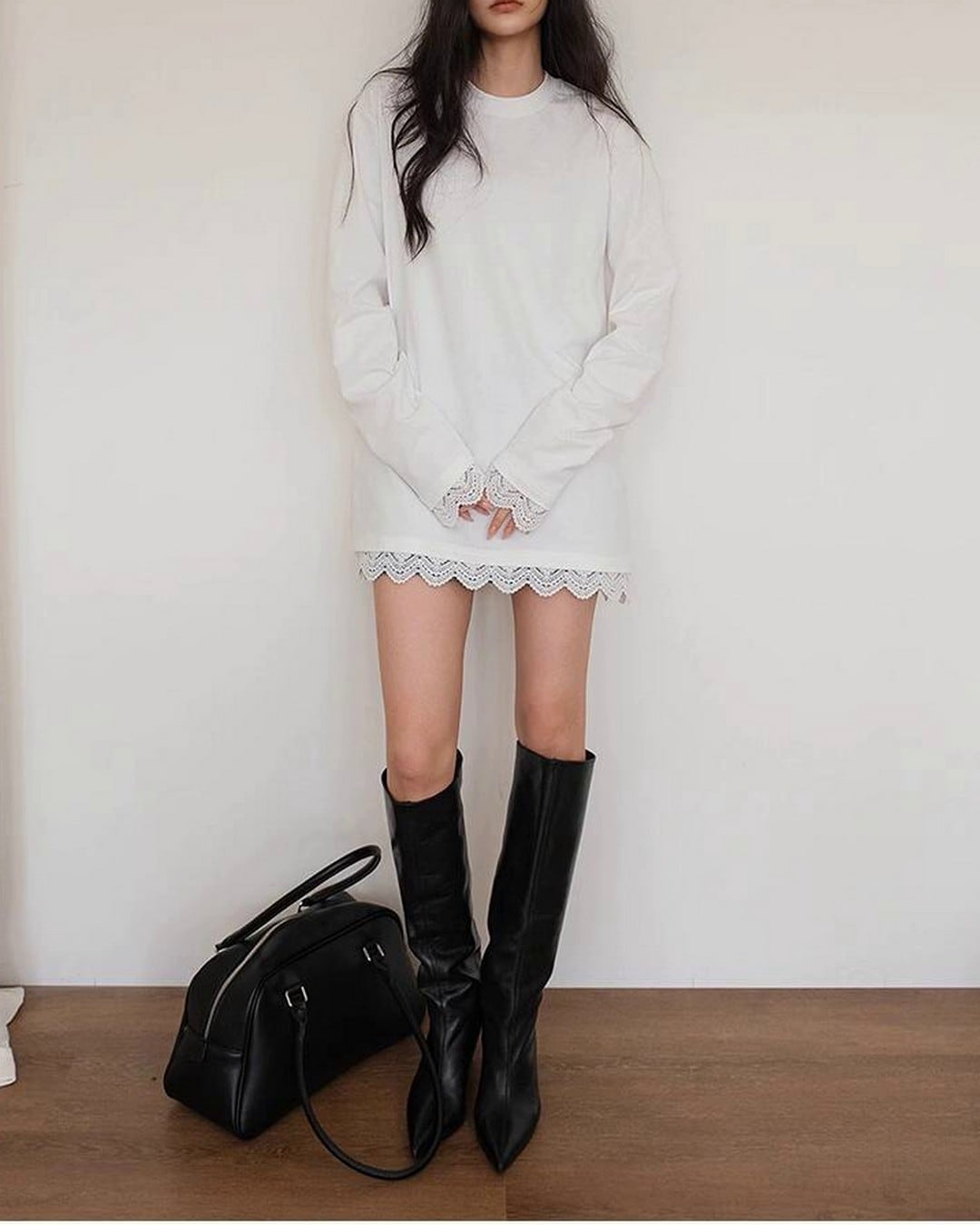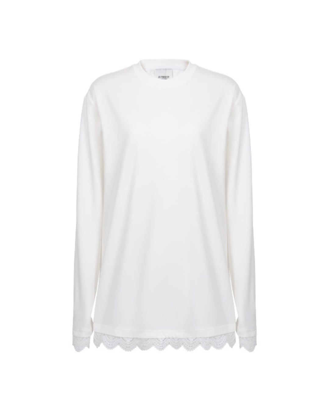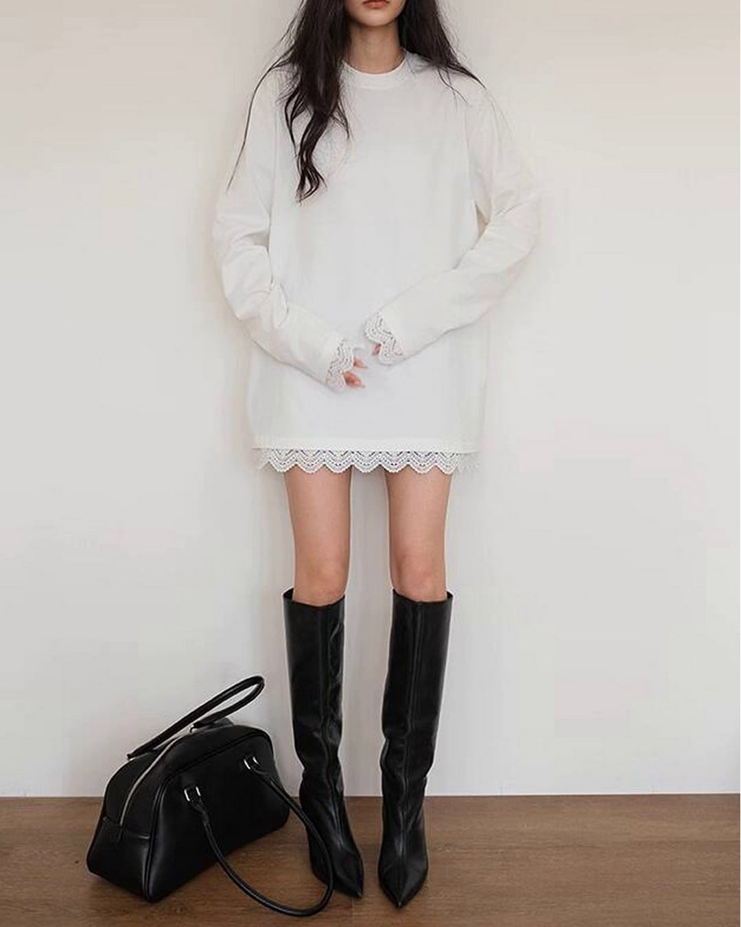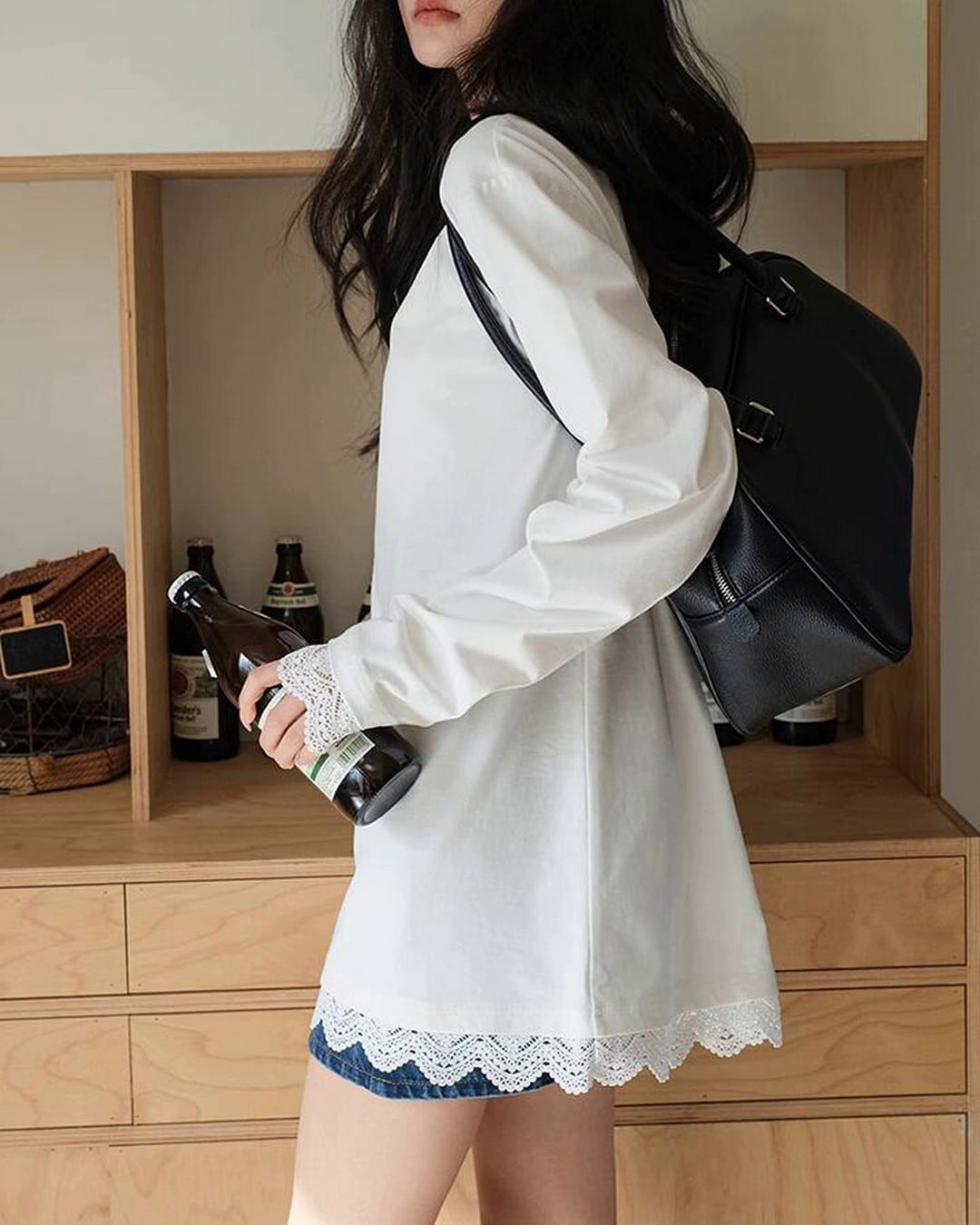 華やかさと上品さを兼ね備えたレースヘムロングトップス。繊細なレースが裾に施されており、女性らしさを引き立てるアイテムとして、カジュアルにもドレッシーにも合わせやすいのが魅力です。
