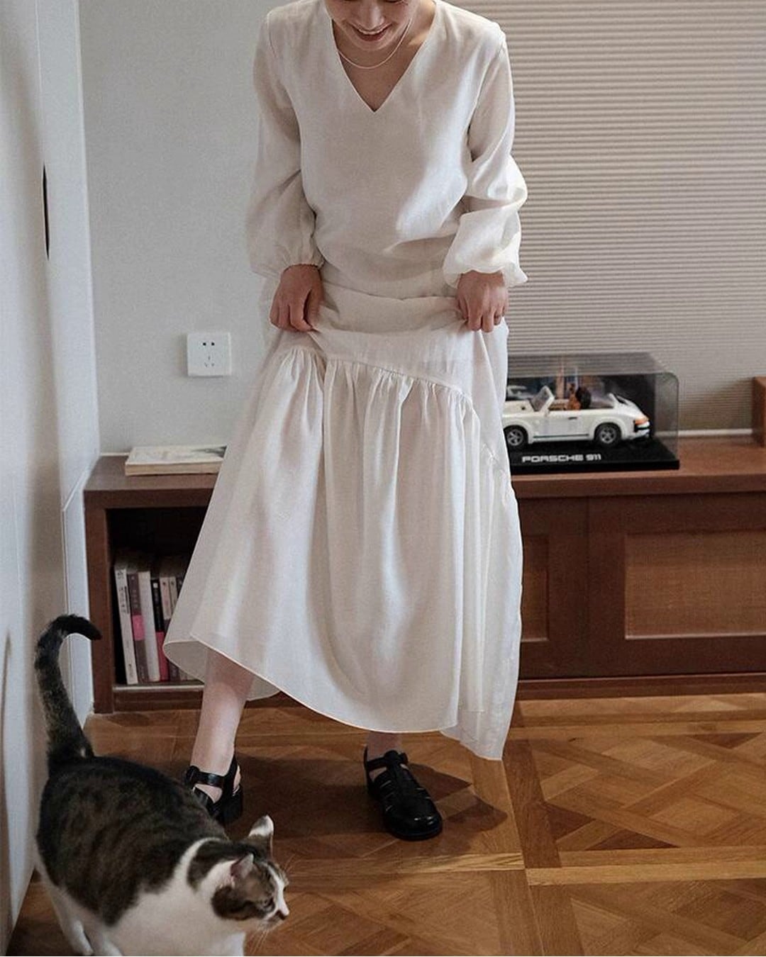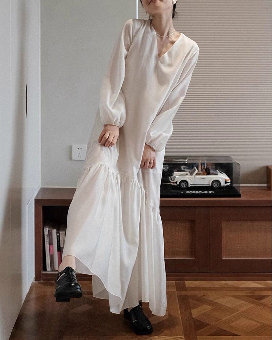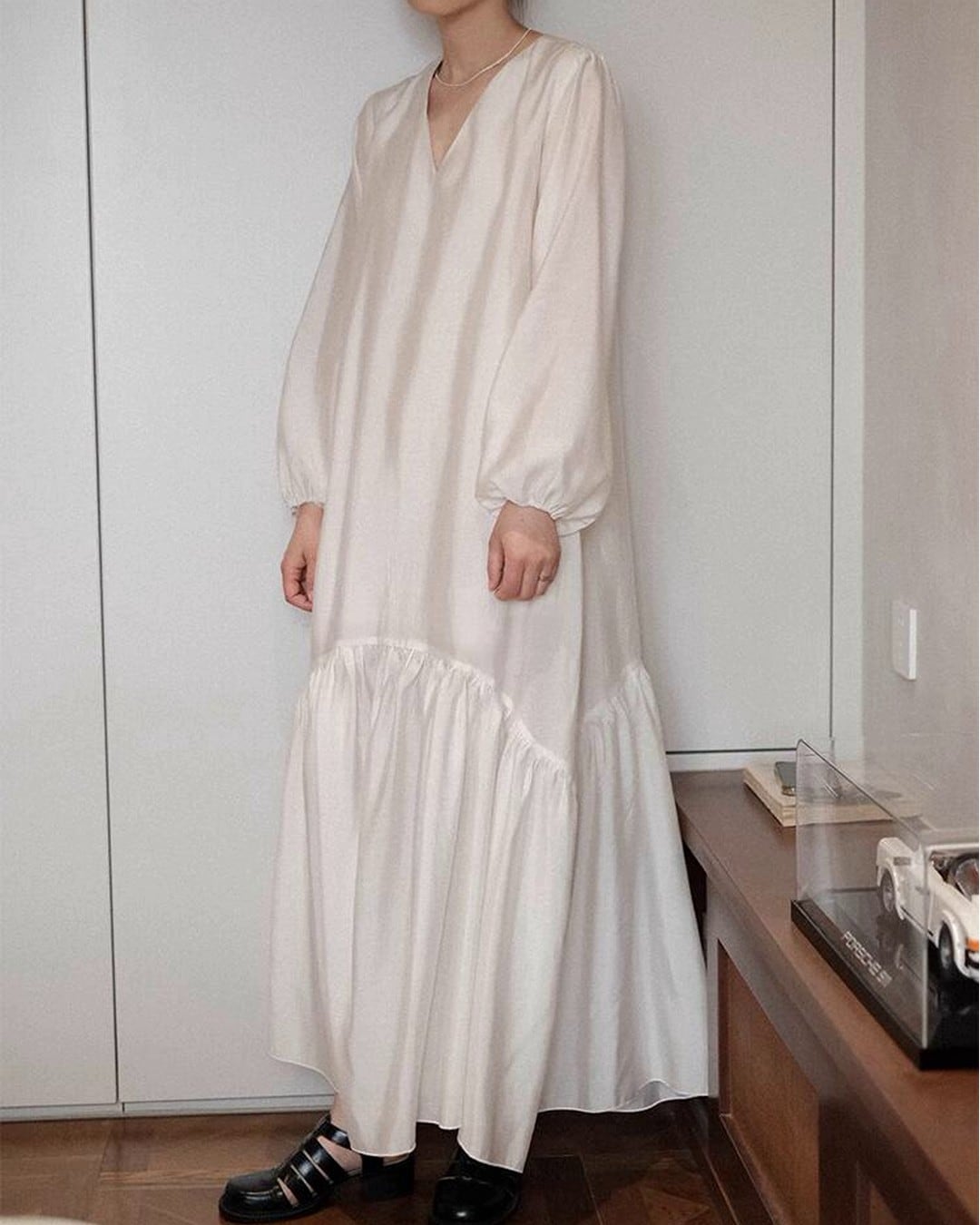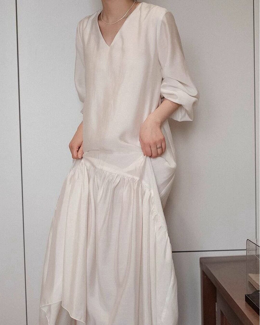ゆったりとしたシルエットが魅力の一着です。Vネックデザインが首元を美しく演出し、エレガントさをプラス。ティアードのフレアが動くたびに優雅な印象を与えます。普段使いにはもちろん、特別な日のお出かけにもヘビーローテーション間違いなしのアイテムです。