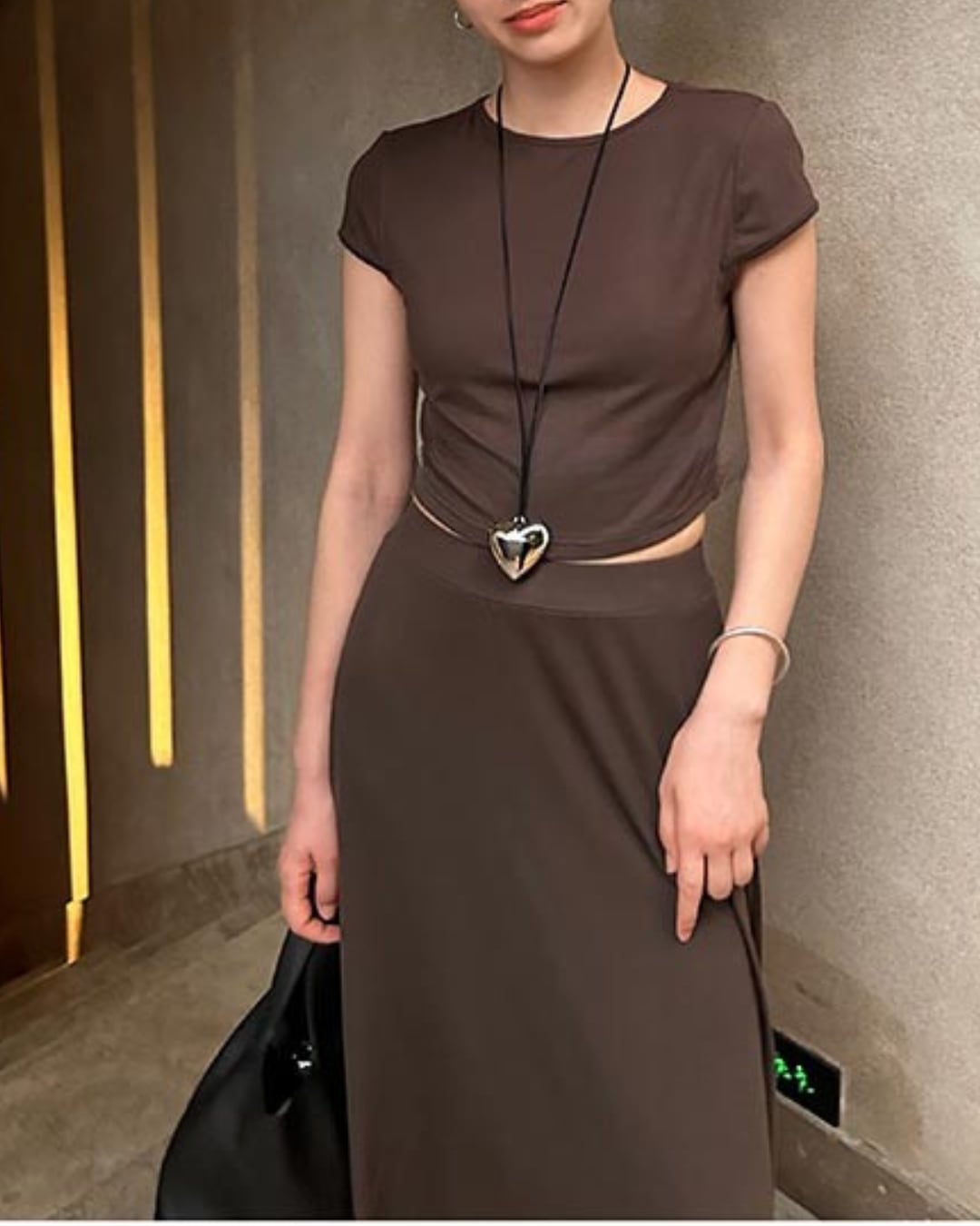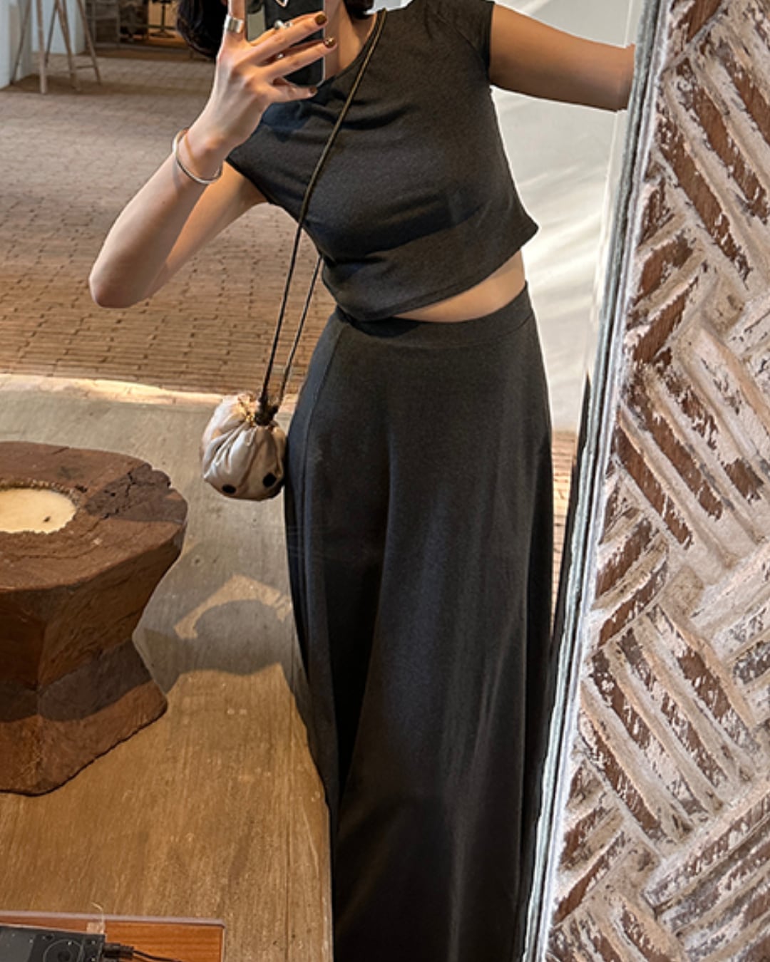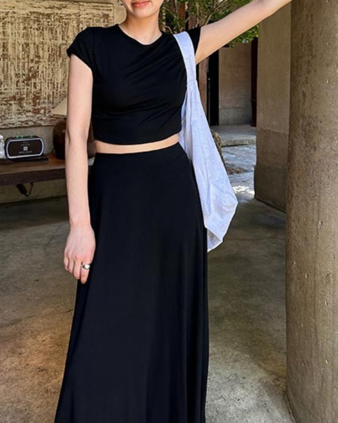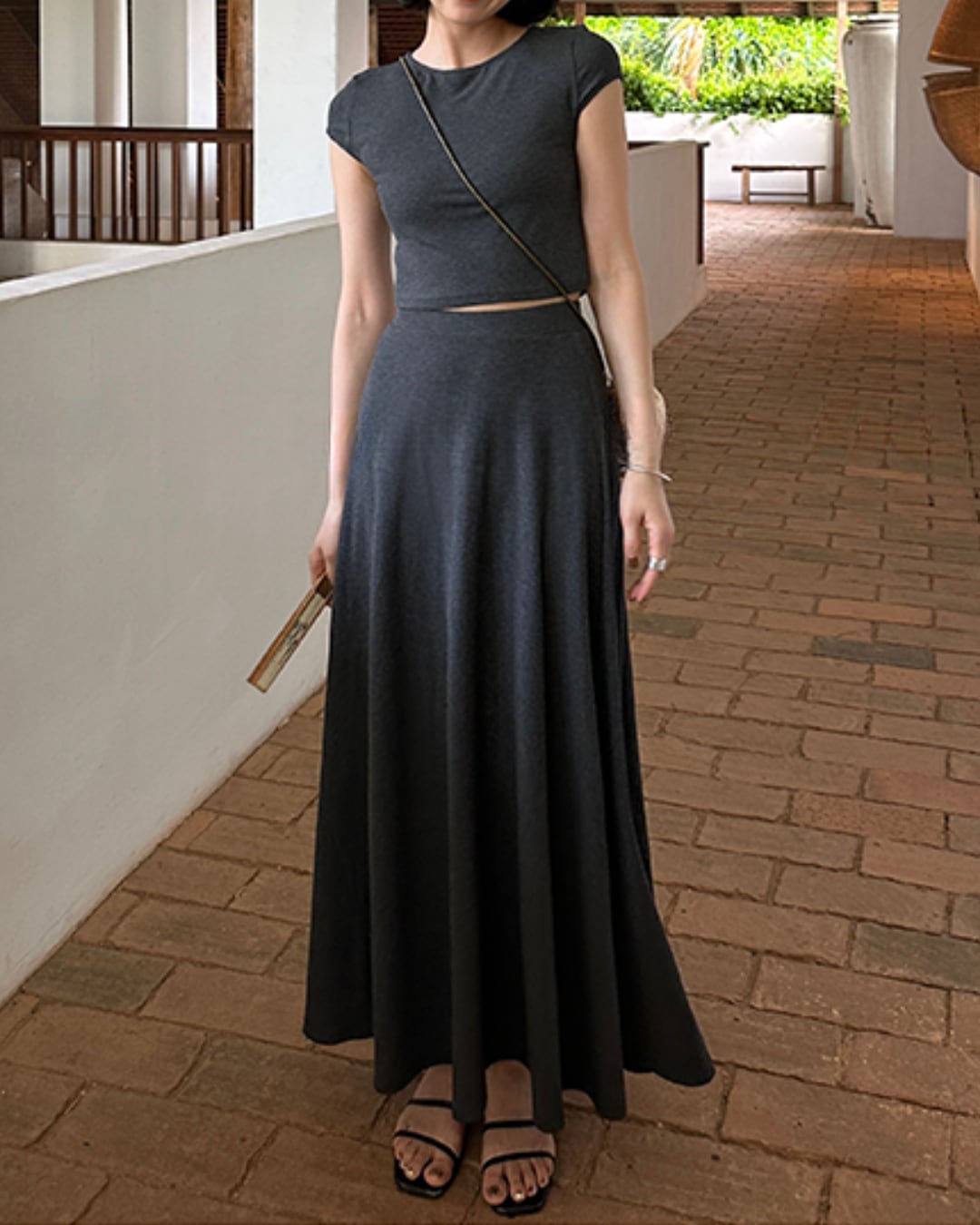 センスを感じさせる半袖トップスとAラインスカートのセットアップ。シンプルなデザインでありながら、着るだけでスタイルが決まるのが魅力のアイテムです。