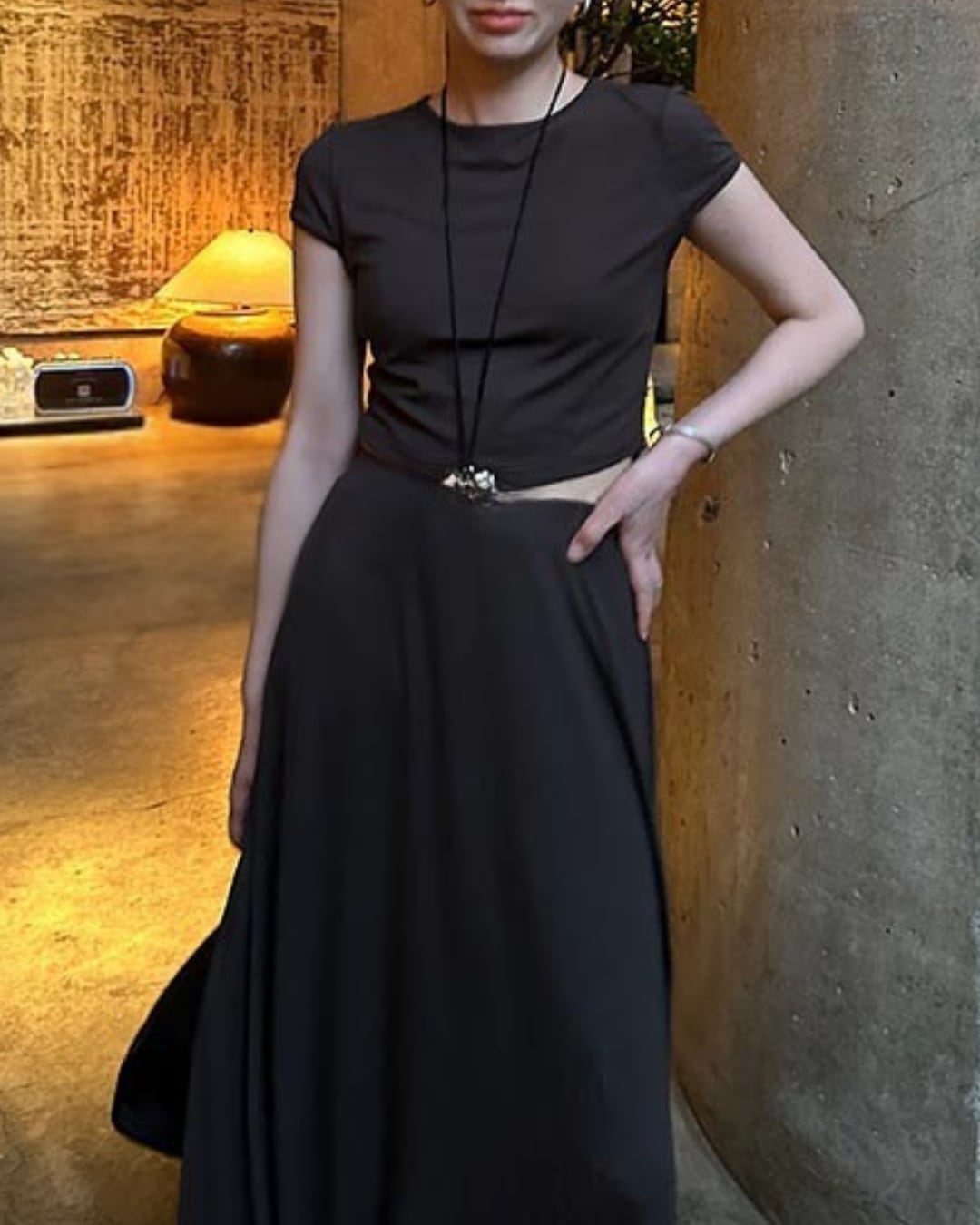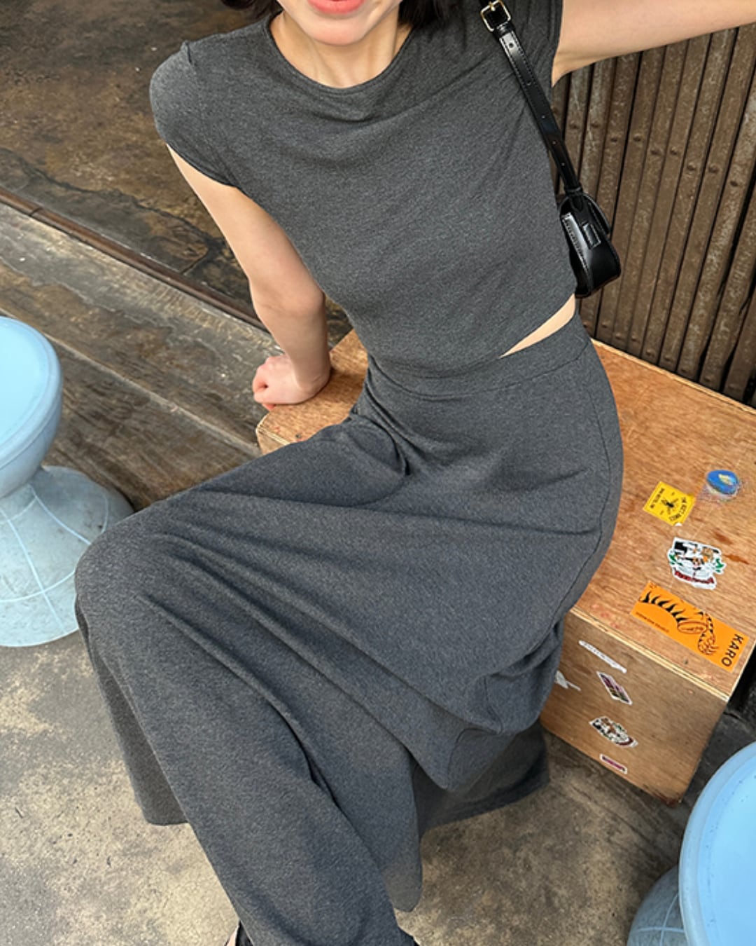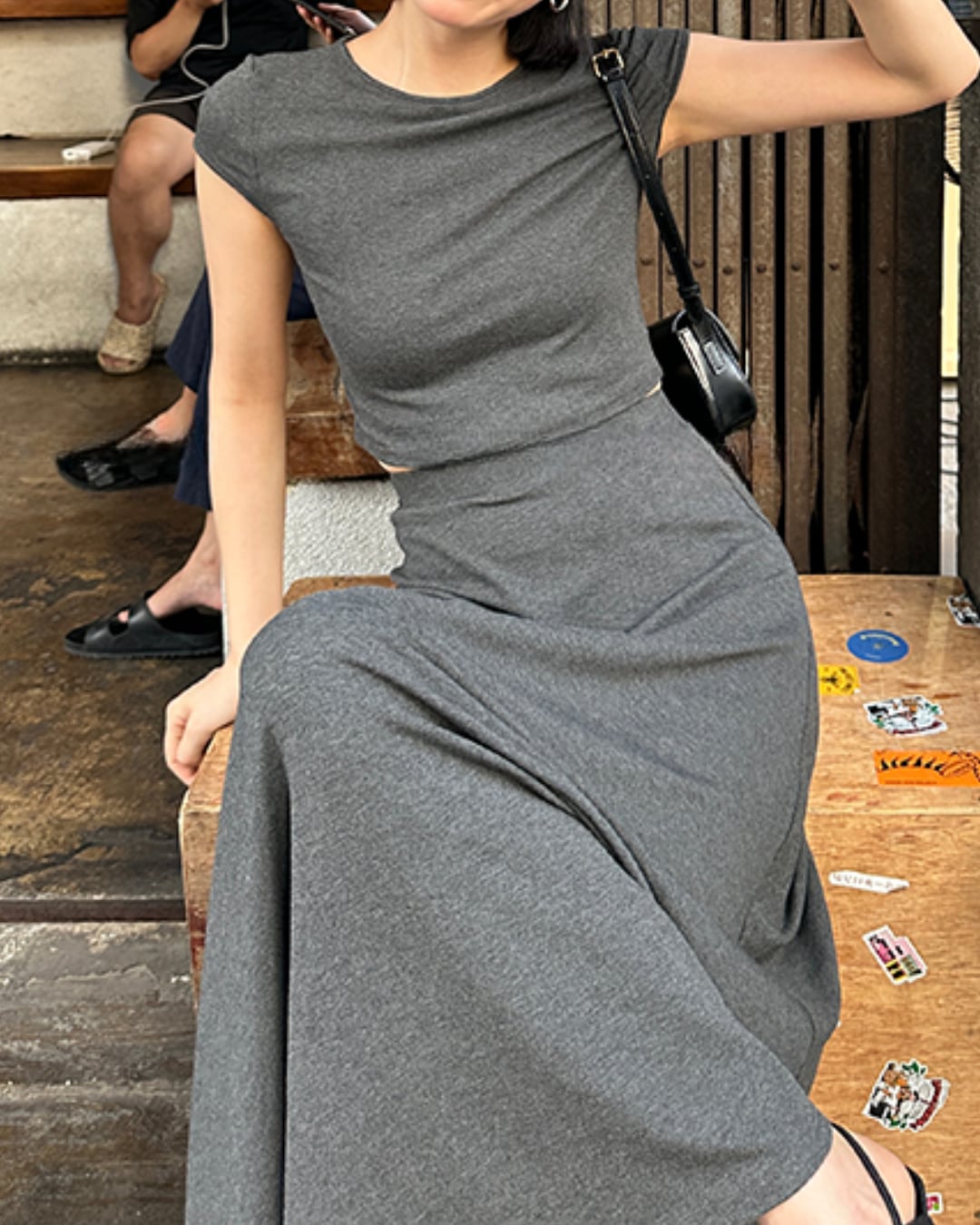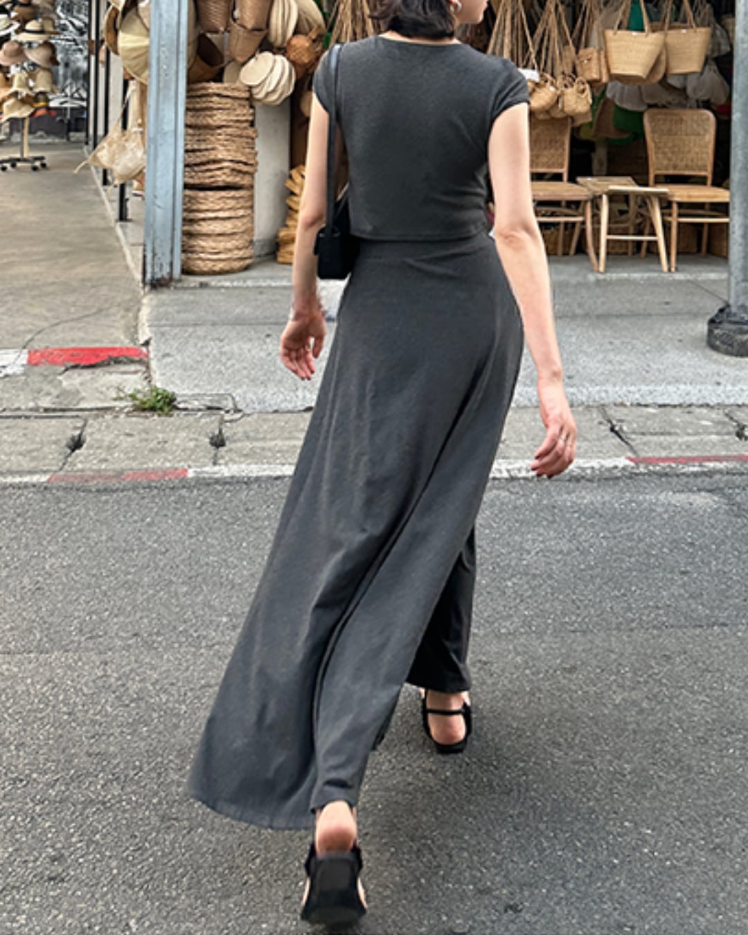 センスを感じさせる半袖トップスとAラインスカートのセットアップ。シンプルなデザインでありながら、着るだけでスタイルが決まるのが魅力のアイテムです。