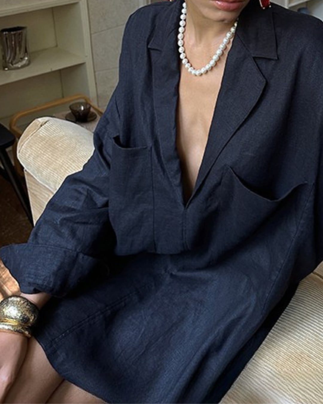 カジュアルからキレイめまで幅広くコーディネート可能。アームホールが広めで、リラックスした着心地を実現。前開きのVネックデザインが顔周りをスッキリさせ、どなたでもおしゃれに着こなせます。
