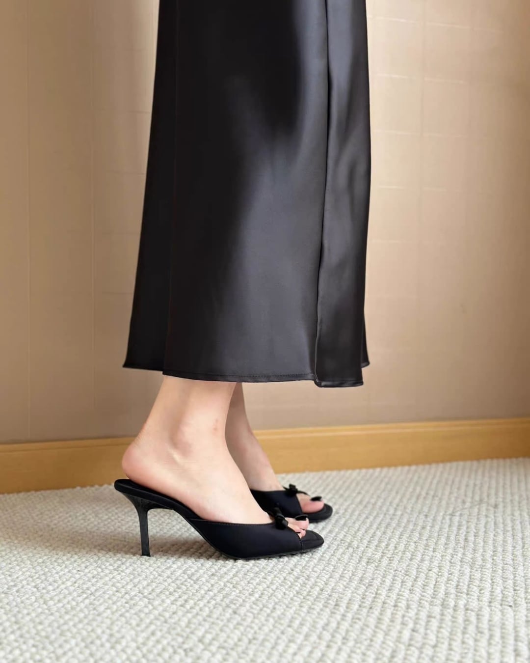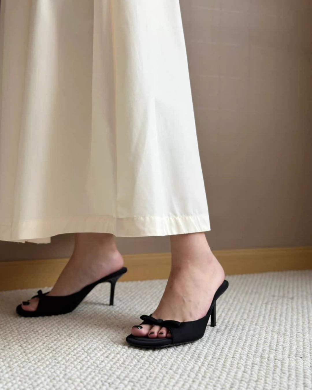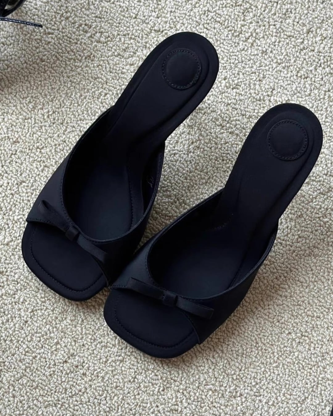 リボンが可愛らしさを引き立てるオープントゥミュール。華やかなリボンデザインが足元を彩り、カジュアルな装いにも特別感をプラスします。オープントゥスタイルで、涼しげな印象を与えつつ、履き心地も抜群です。シンプルなデザインの中に大人の女性らしさが光る一足です。
