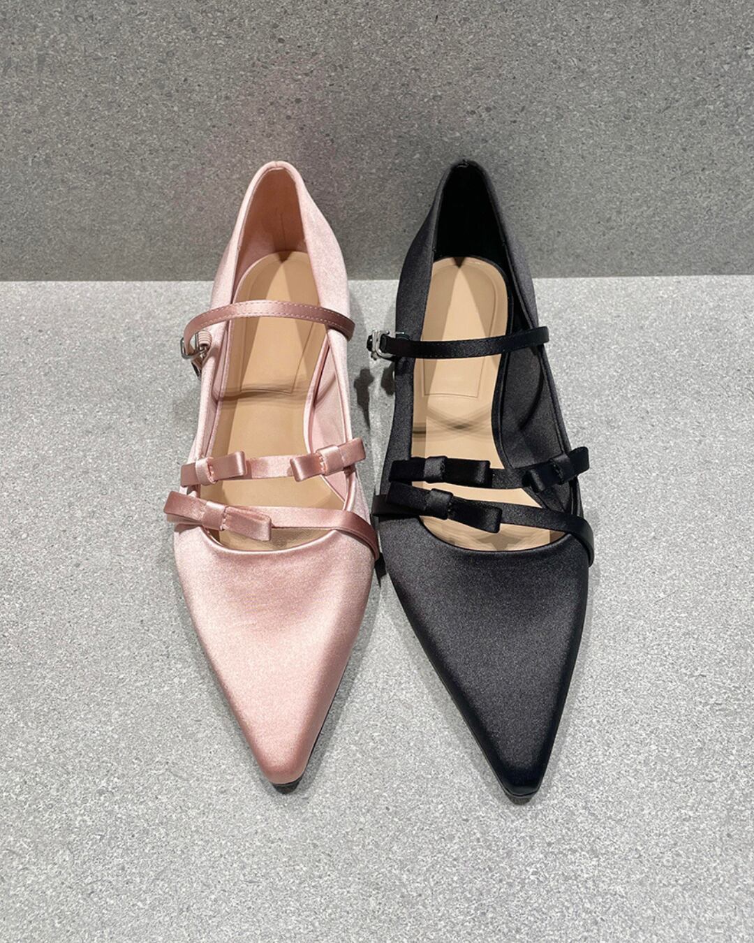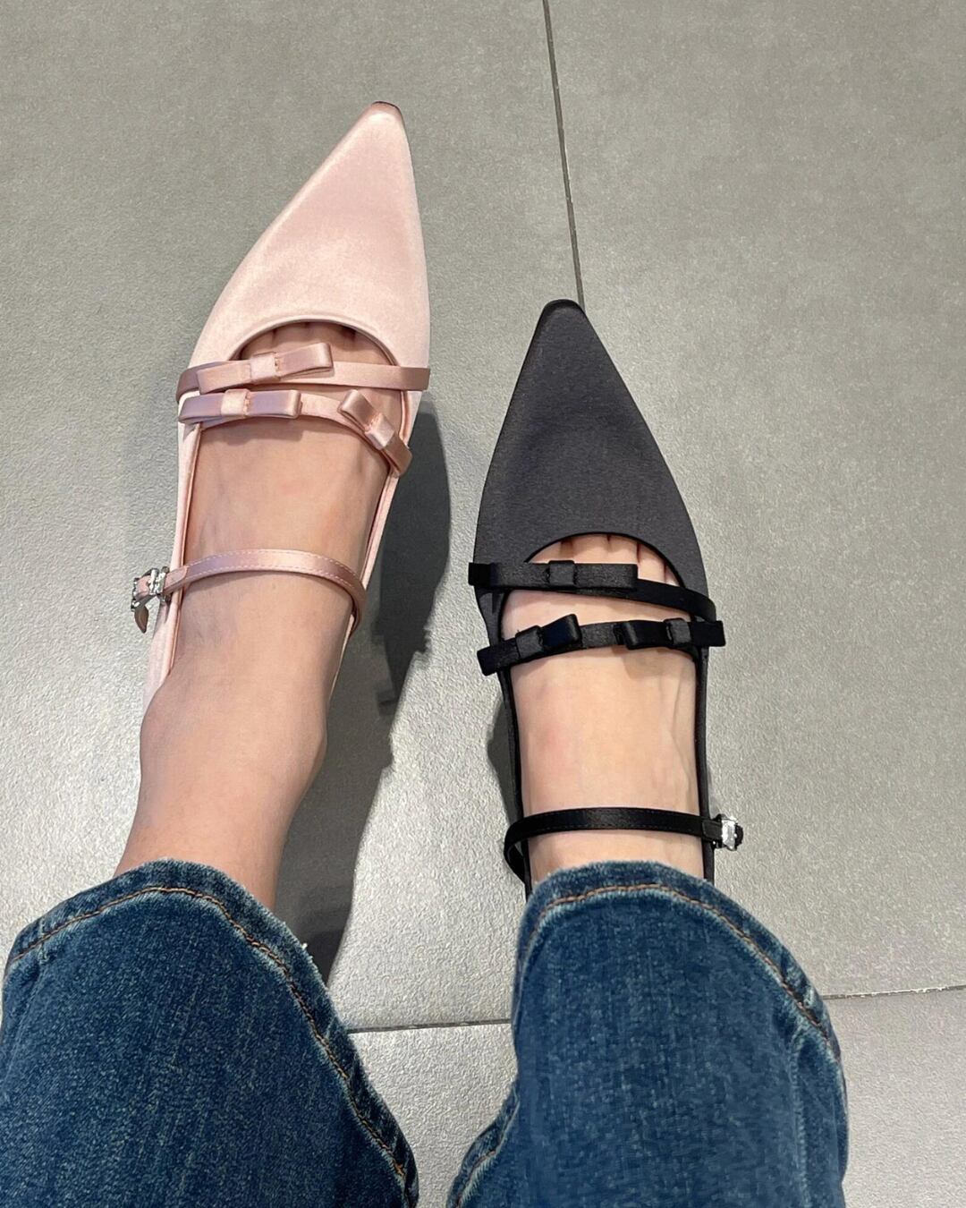 上品さと可愛らしさを兼ね備えたダブルリボンスフラットシューズ。洗練されたデザインが魅力で、リボンのディテールが足元を華やかに演出します。フラットなソールで快適な履き心地を提供し、普段使いからお出かけまで幅広く活躍する一足です。
