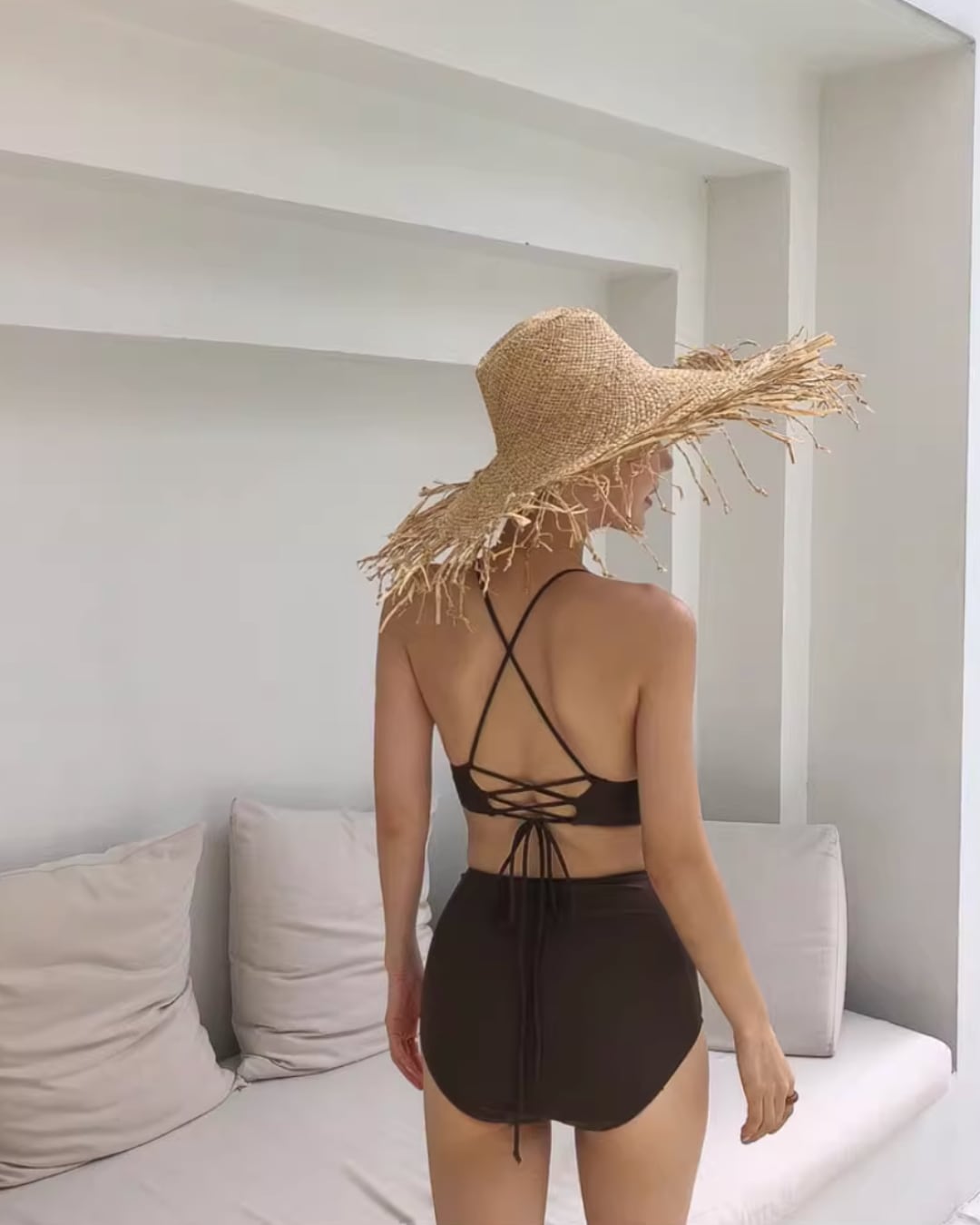 ナチュラルな雰囲気が魅力のハイウエストビキニセット。Vネックデザインがデコルテを美しく見せ、スタイルアップ効果抜群。ハイウエストボトムでお腹周りをカバーしつつ、脚長効果も期待できます。シンプルながらも洗練されたデザインで、リゾートやビーチで大活躍!