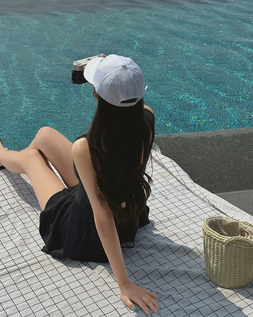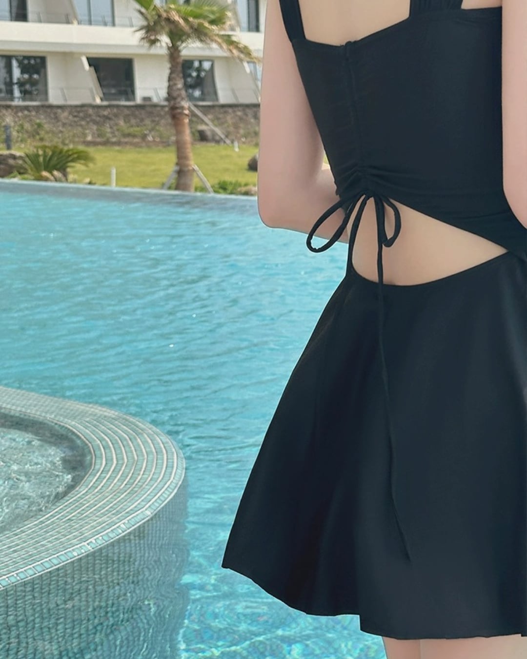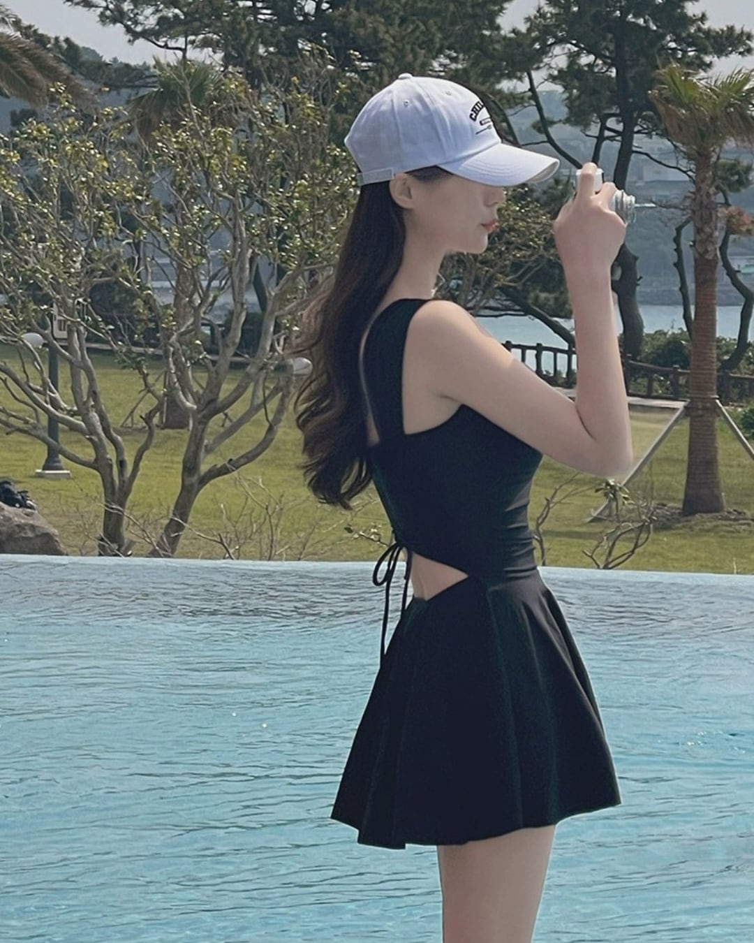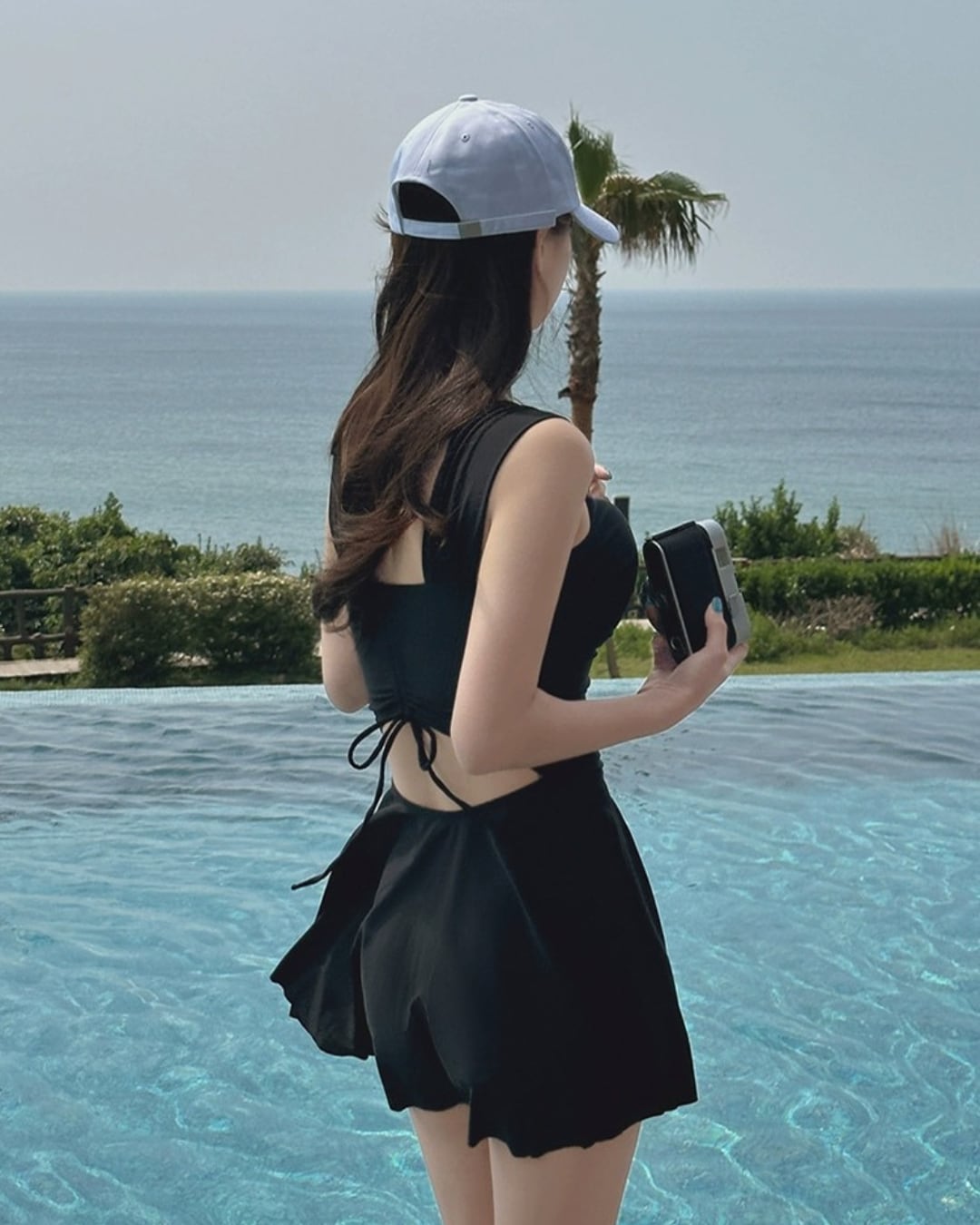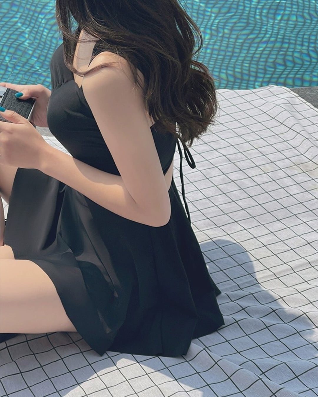 #ワンピース水着 #スカート風 #ギャザーデザイン #体型カバー #ブラックコーデ