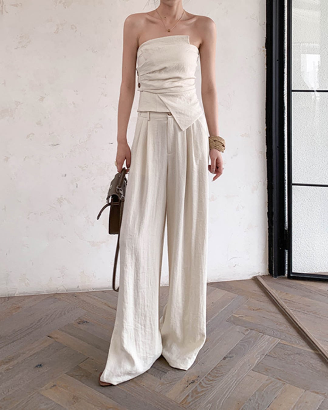 立体的なドレープデザインが目を惹く、洗練された印象のセットアップ。トップスは肩のラインを美しく引き立てるチューブデザインで、フェミニンさと抜け感を演出。ボトムはワイドシルエットでリラックス感がありながらも、きちんと感を残した一着。自然な風合いのリネン混素材が夏の装いにぴったりで、着るだけでこなれたスタイリングが完成します。