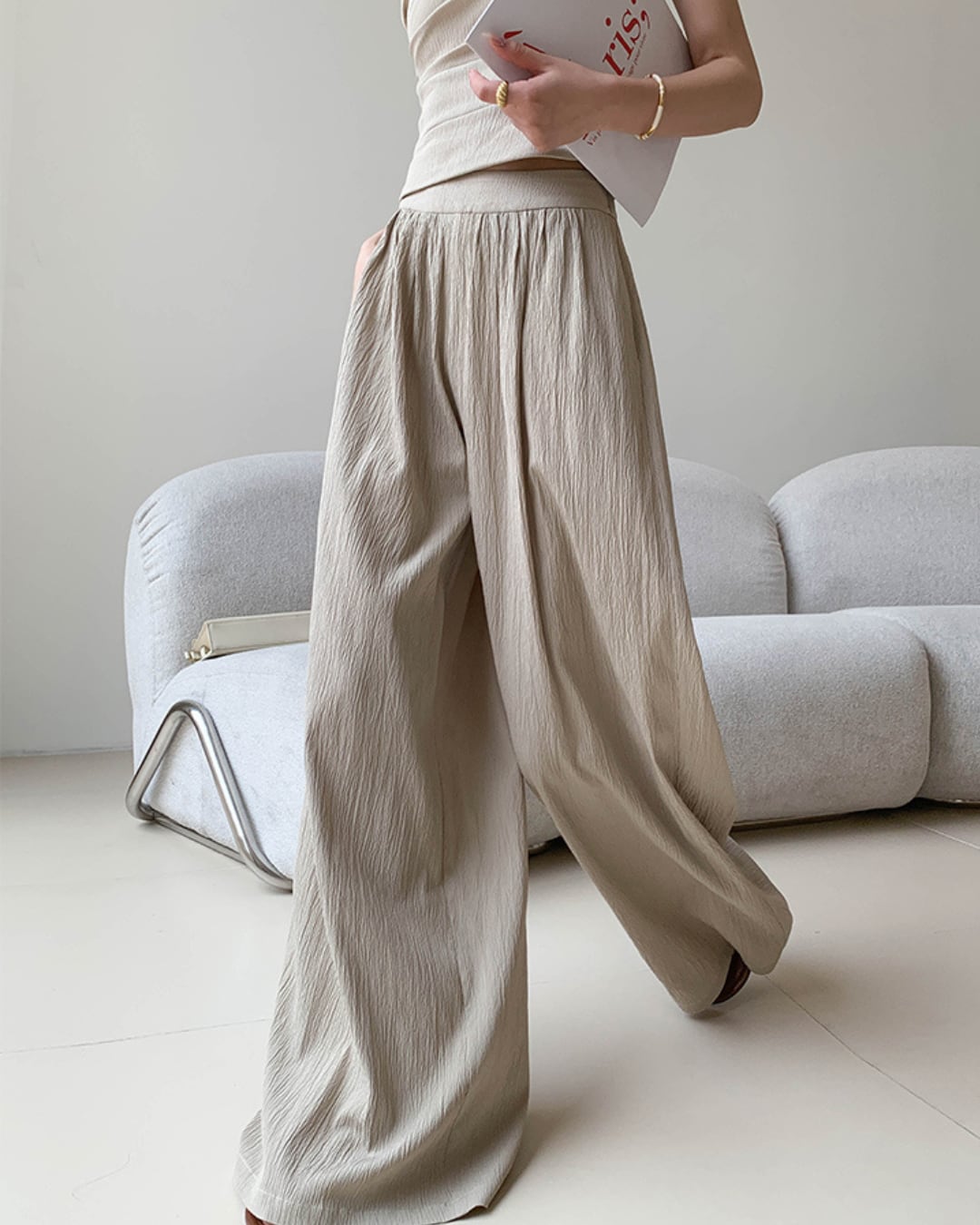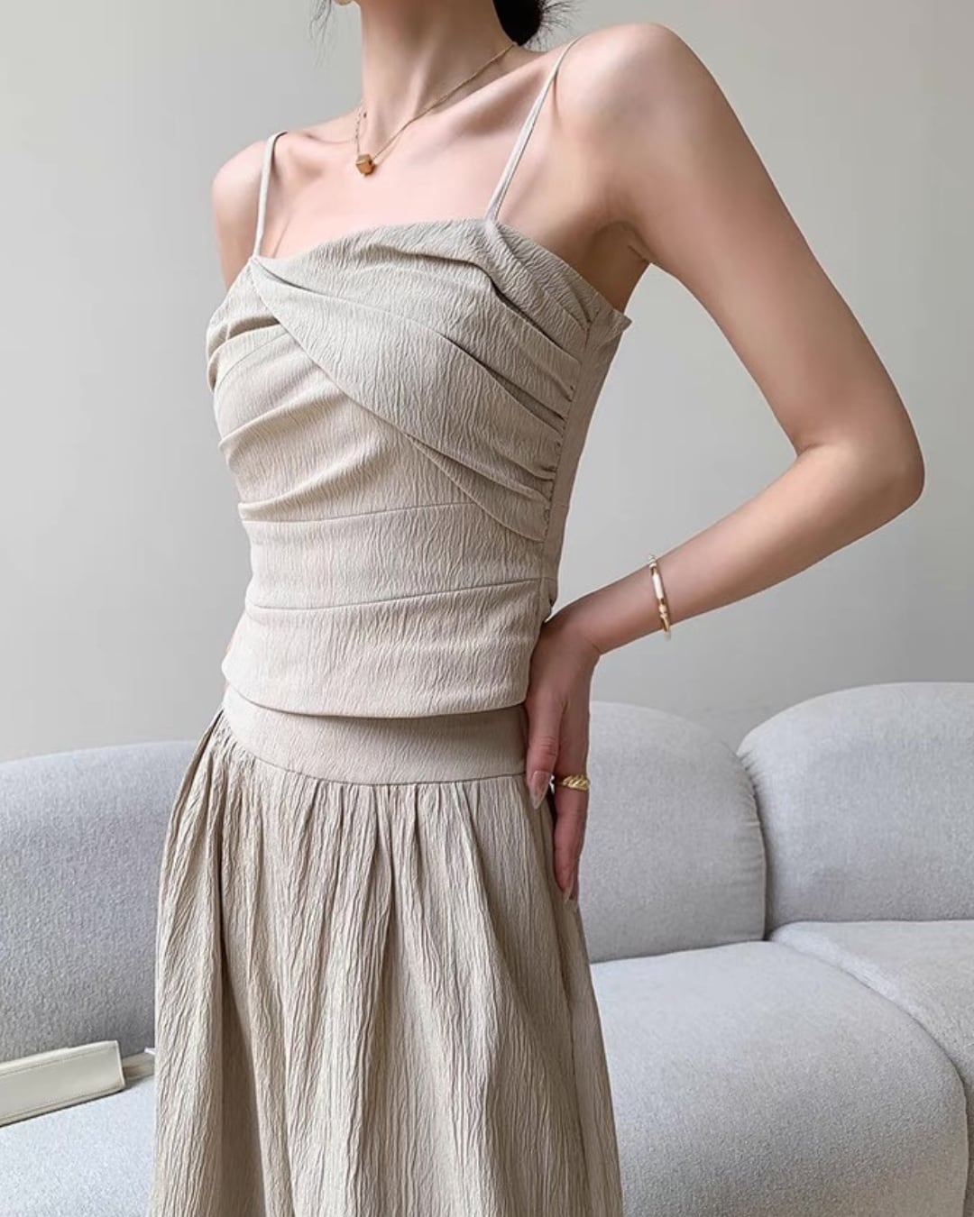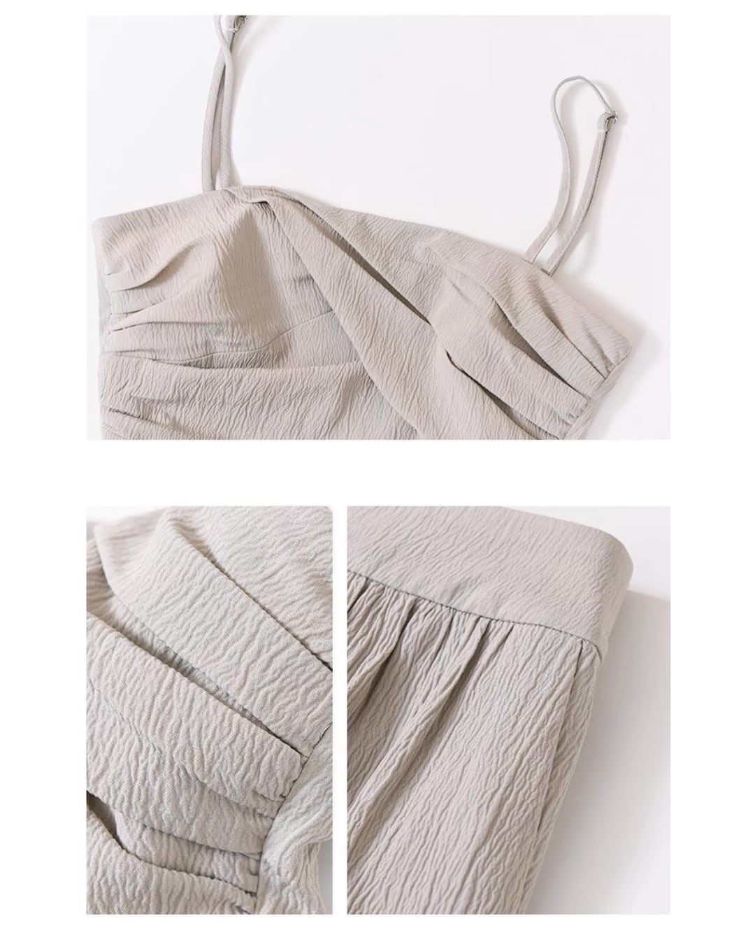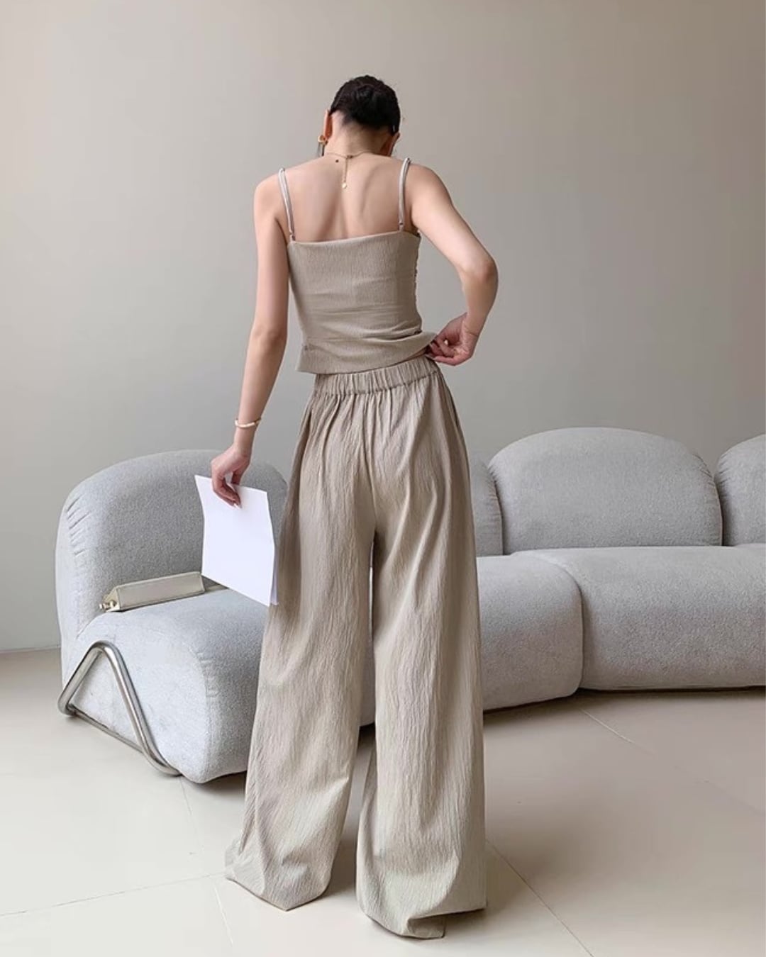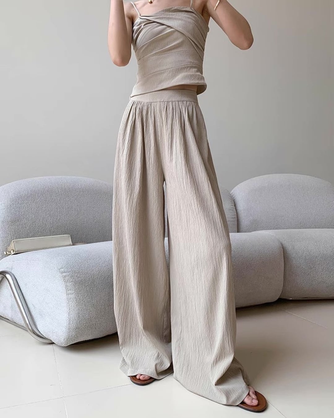美しいドレープが印象的なキャミソールと、落ち感のあるワイドパンツがセットになった大人のニュアンスコーデ。軽やかで涼しげな100%レーヨン素材を使用し、柔らかい肌触りと上品な光沢感が魅力。女性らしい立体的なシルエットが際立つデザインで、デイリーからリゾートスタイルまで幅広く活躍します。