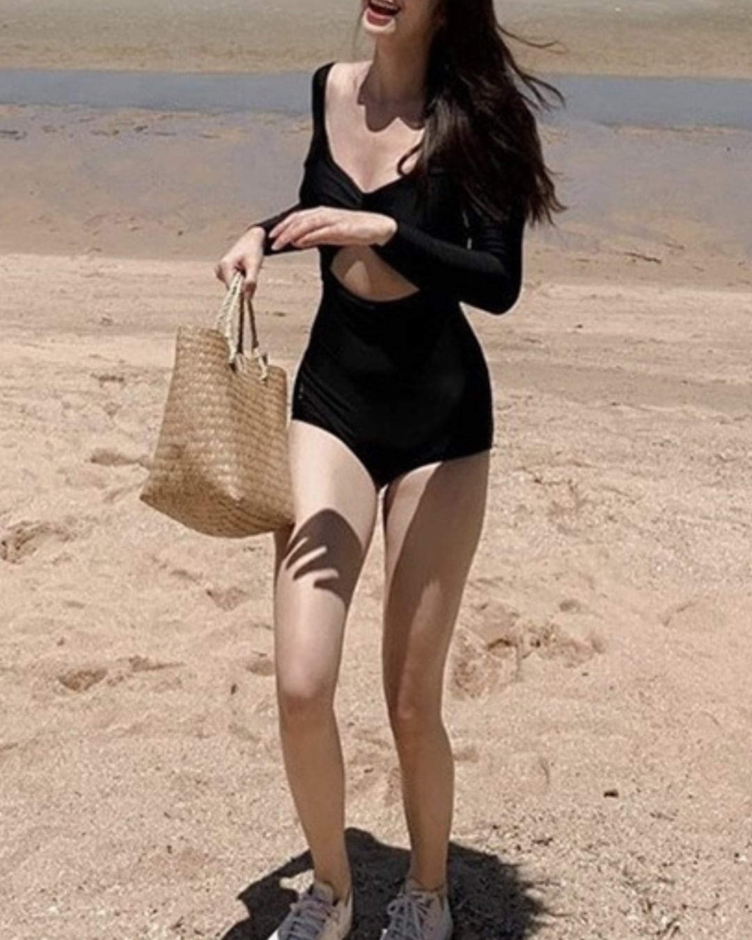 セクシーなカットアウトと深めのVネックで大人の魅力を引き出す、ブラックカラーの長袖ワンピース水着。日焼け対策にもなる長袖デザインながら、抜け感のあるスタイルでスタイルアップも叶います。リゾート、プールで視線を集めること間違いなしの1着です。