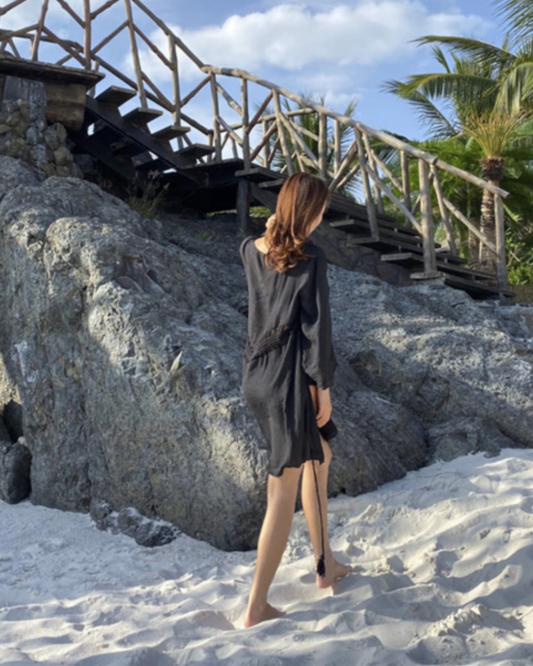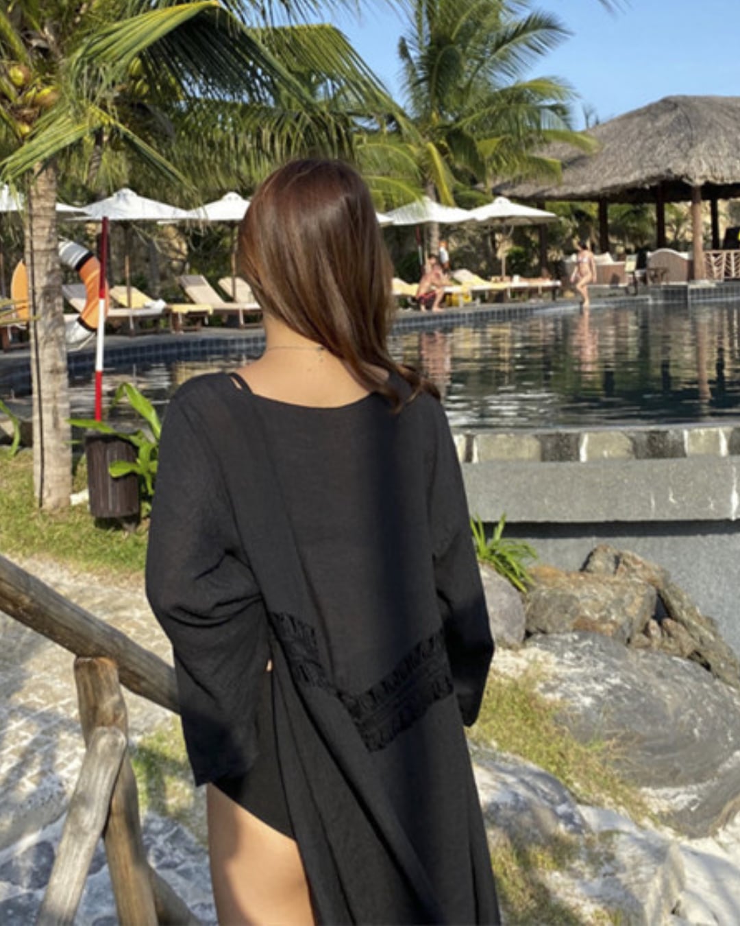 背中の透かし編みがポイントの、ナチュラルな抜け感が魅力のビーチカバーアップ。ゆったりした袖と軽やかな生地感で、リゾートやプールサイドでさらりと羽織れる一着です。軽量で風通しもよく、紫外線対策や水着の上からのレイヤードにぴったり。