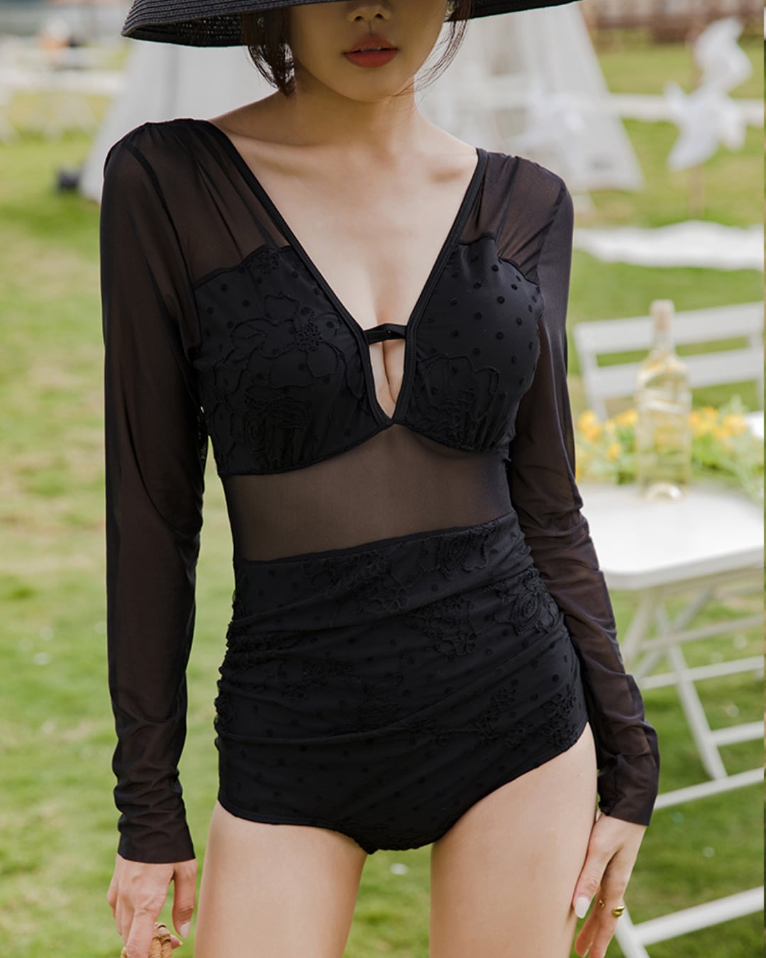 #長袖水着 #体型カバー #ドット柄 #シアー切り替え #カップ付き #ワンピース水着 #ブラック水着 #温泉水着 #韓国風 #スタイルアップ