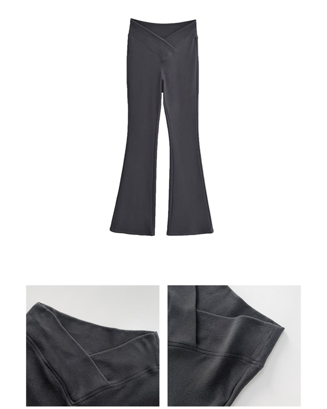 ウエストのクロスデザインがアクセントになったリラックスパンツ。程よくフィットするスリムなラインと脚のラインを綺麗に見せてくれるフレアシルエットで、美脚効果も抜群。柔らかく伸縮性のある素材で、ルームウェアやワンマイルウェアにもぴったりな快適な穿き心地が魅力です。スタイルアップしつつ、リラックス感も両立できる万能パンツ。