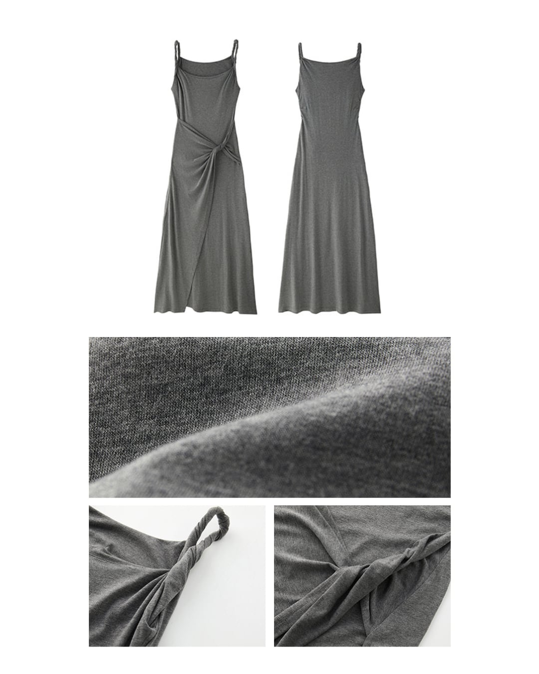 ナイトシーンにも映えるシックなグレーのキャミワンピース。ツイストされたフロントデザインがボディラインを美しく引き立て、大人の女性らしさを演出します。程よくフィットするシルエットと落ち感のある素材で、ストリートカジュアルから都会的なスタイルまで幅広く活躍。カラ―キャップやスニーカーを合わせたミックスコーデもおすすめ。