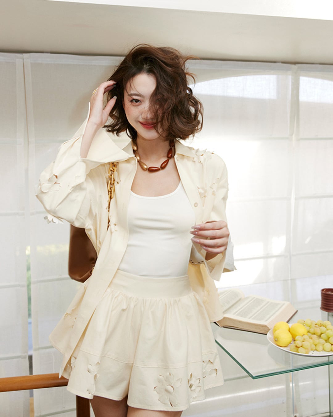 柔らかなアイボリートーンに花模様のカットワークが映える、シャツとショートパンツのセットアップ。立体感のある刺繍風デザインが上品さを添えつつ、抜け感も演出。シャツはルーズなシルエットで抜け感のある大人カジュアルに、ショートパンツはスカート風に広がるシルエットで女性らしさをプラス。セットアップで着るのはもちろん、別々でも着回しの効く万能アイテムです。