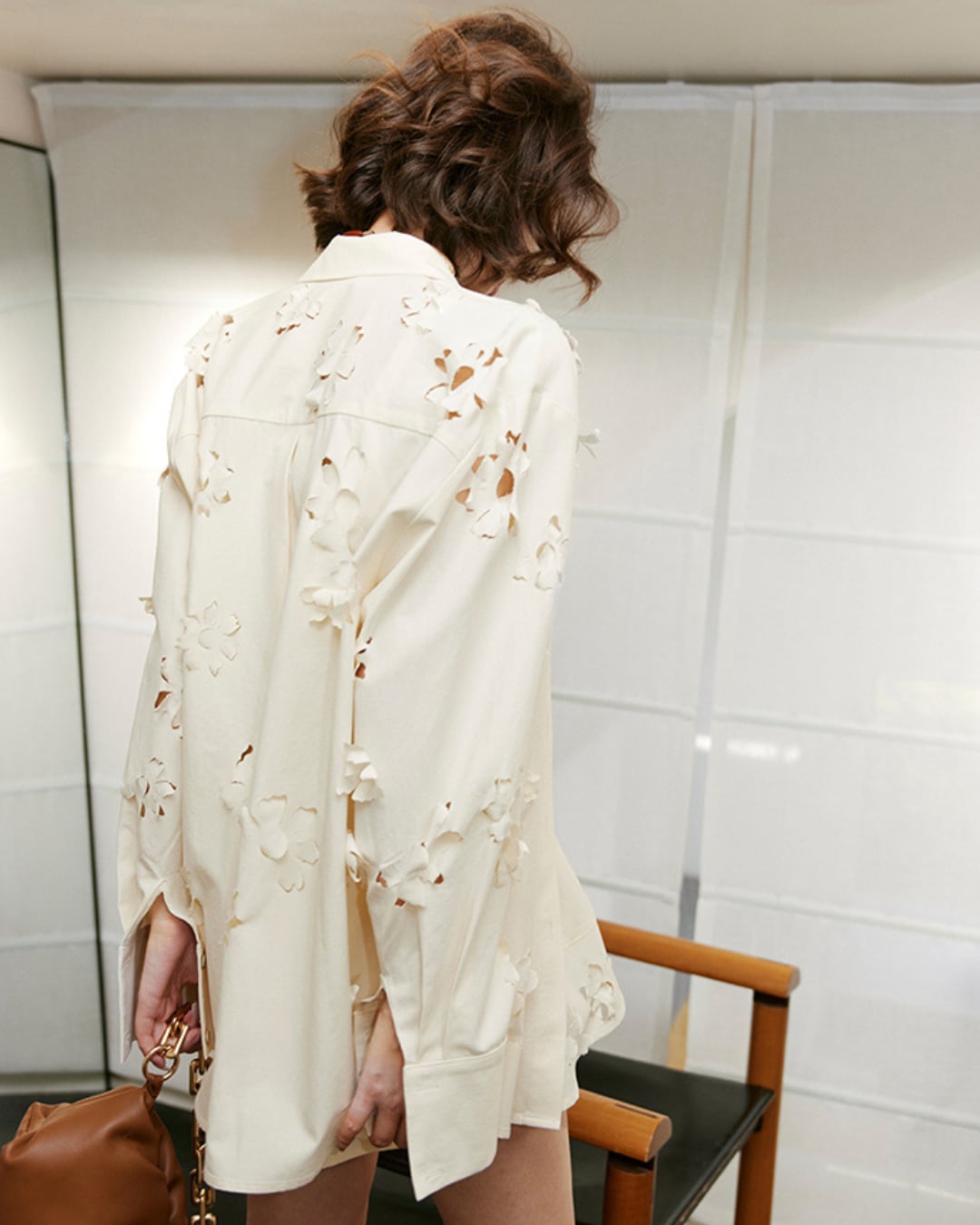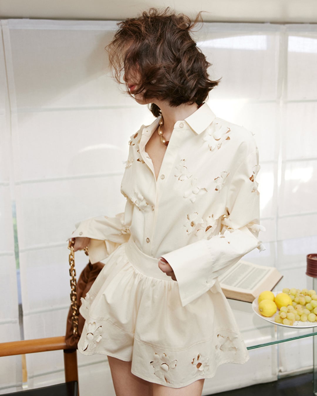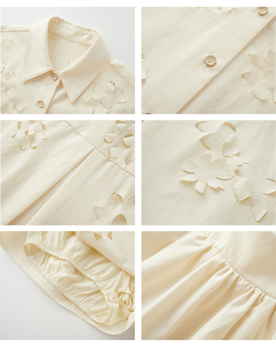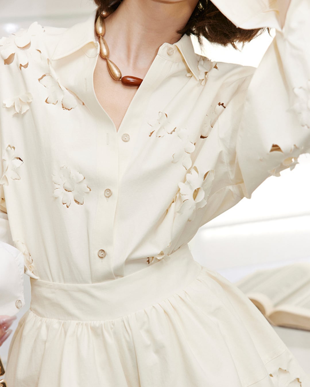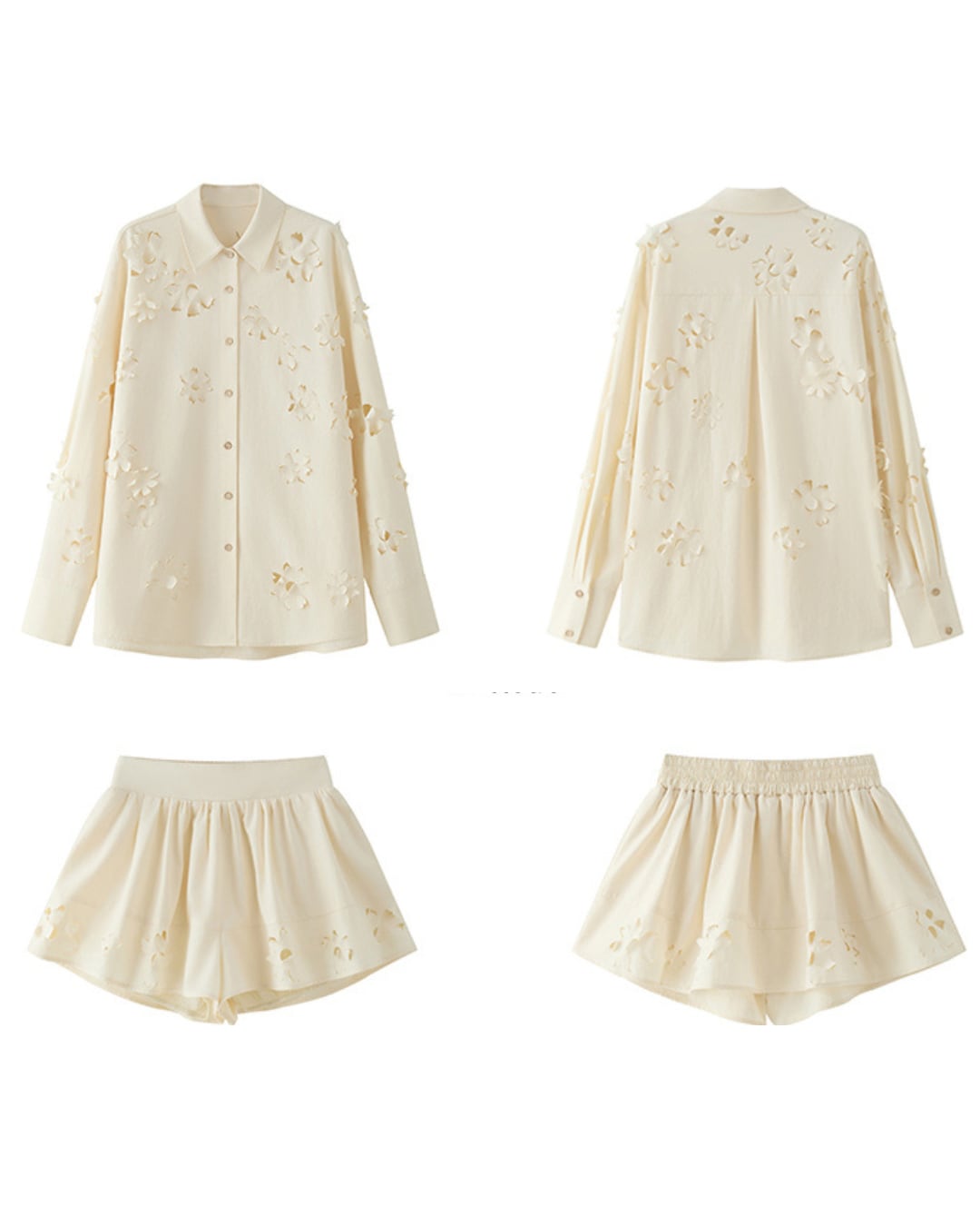 柔らかなアイボリートーンに花模様のカットワークが映える、シャツとショートパンツのセットアップ。立体感のある刺繍風デザインが上品さを添えつつ、抜け感も演出。シャツはルーズなシルエットで抜け感のある大人カジュアルに、ショートパンツはスカート風に広がるシルエットで女性らしさをプラス。セットアップで着るのはもちろん、別々でも着回しの効く万能アイテムです。