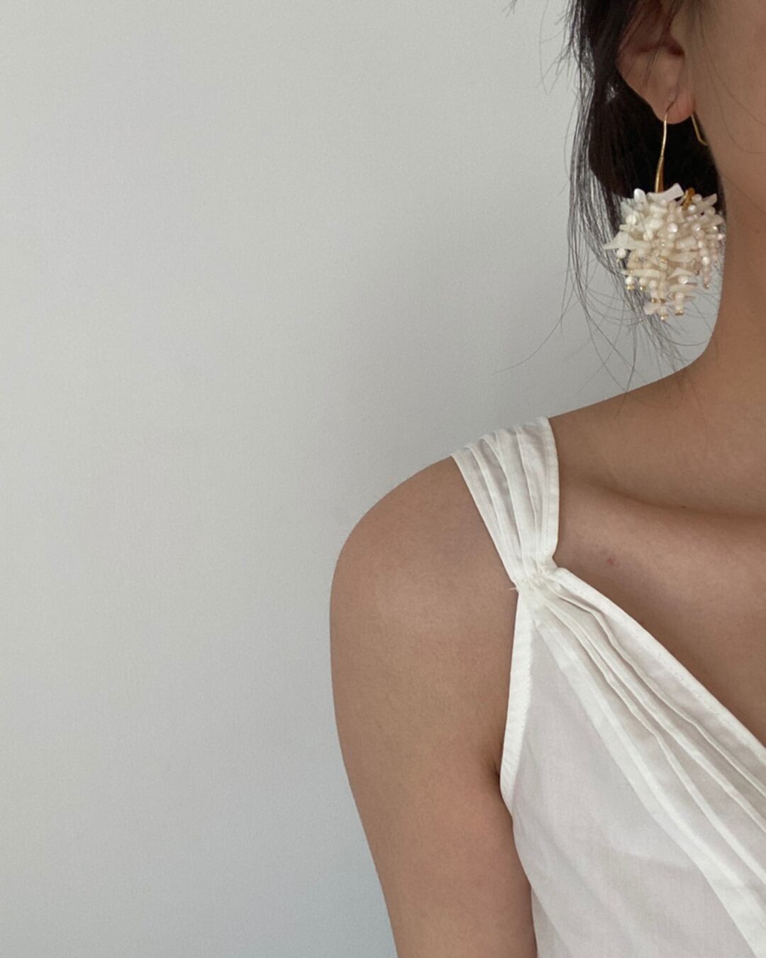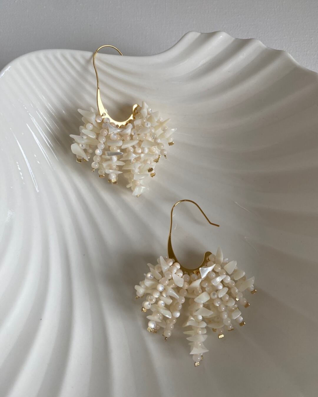 天然素材の魅力が詰まった、ナチュラルな輝きのシェルビーズイヤリング。柔らかな曲線とボリューム感のあるデザインが顔まわりを華やかに仕上げてくれます。軽やかに揺れるたび、自然な美しさが際立つアイテムです。