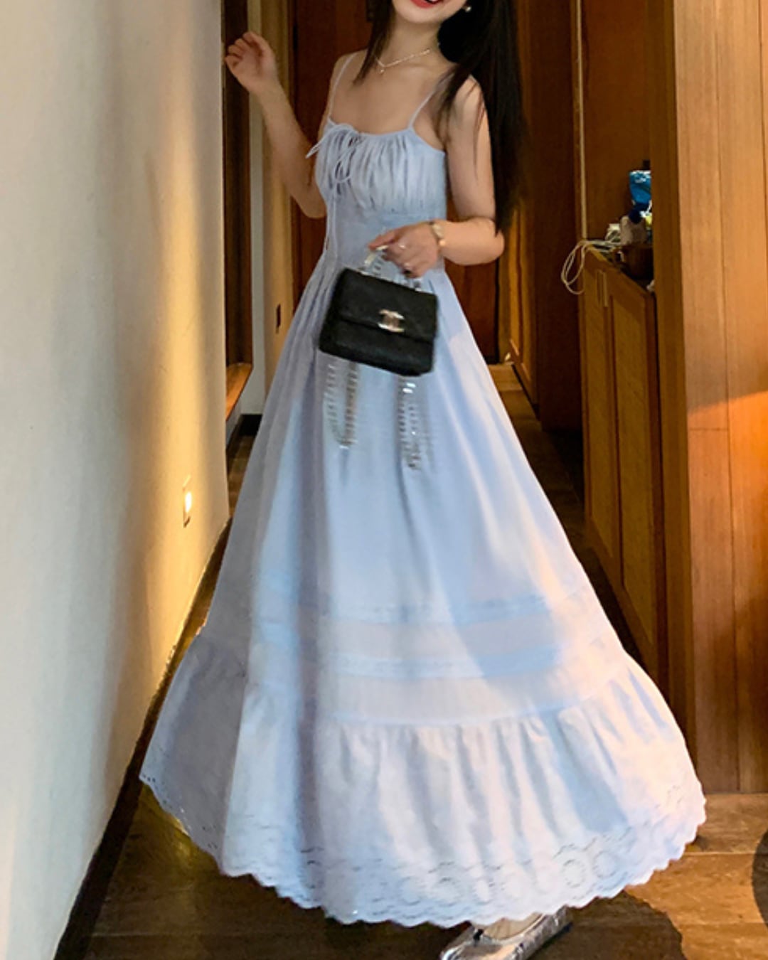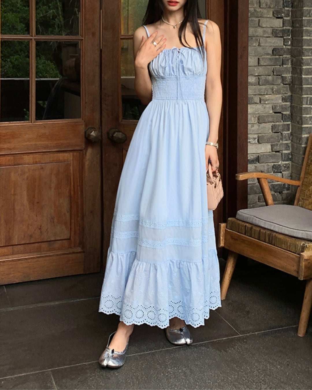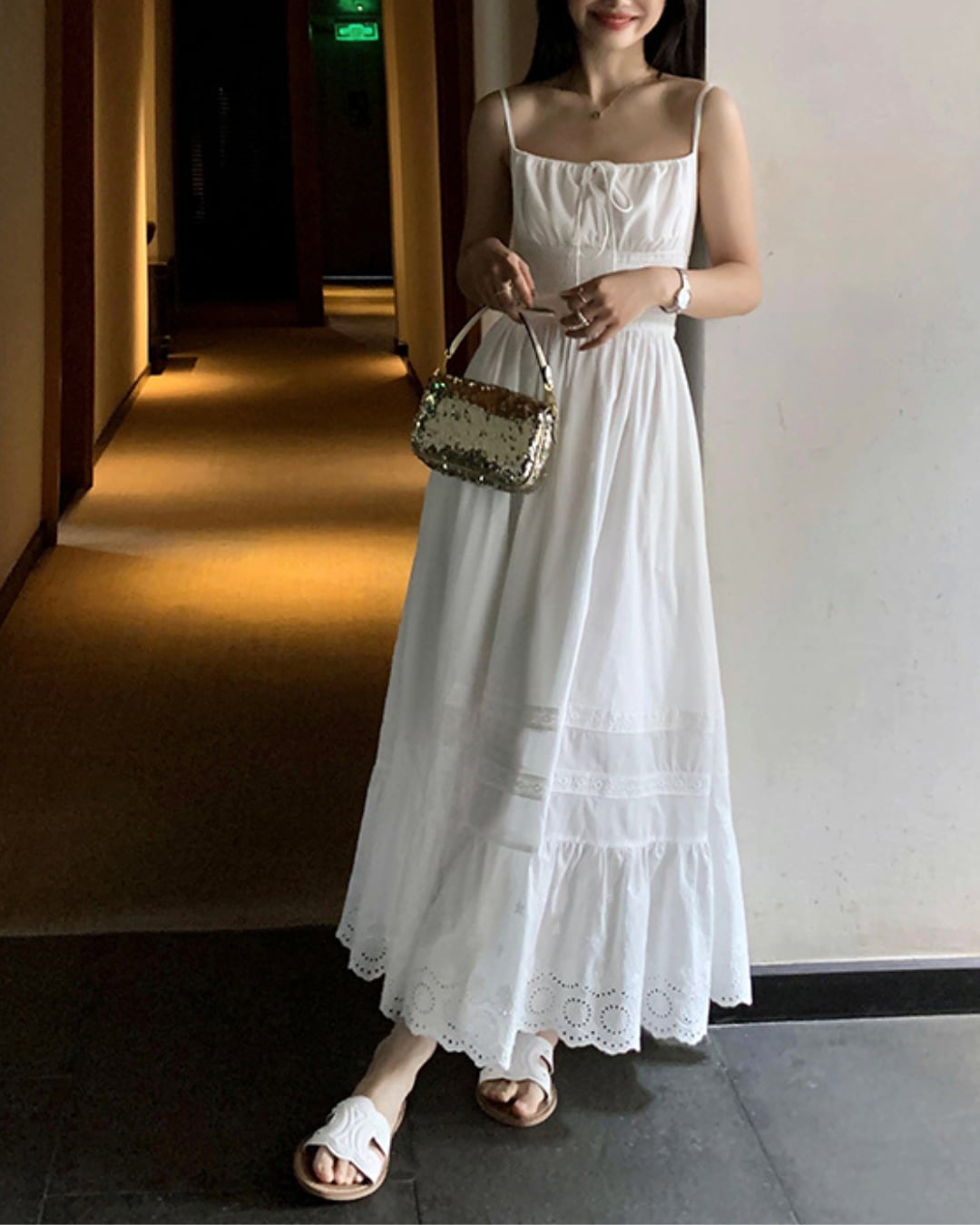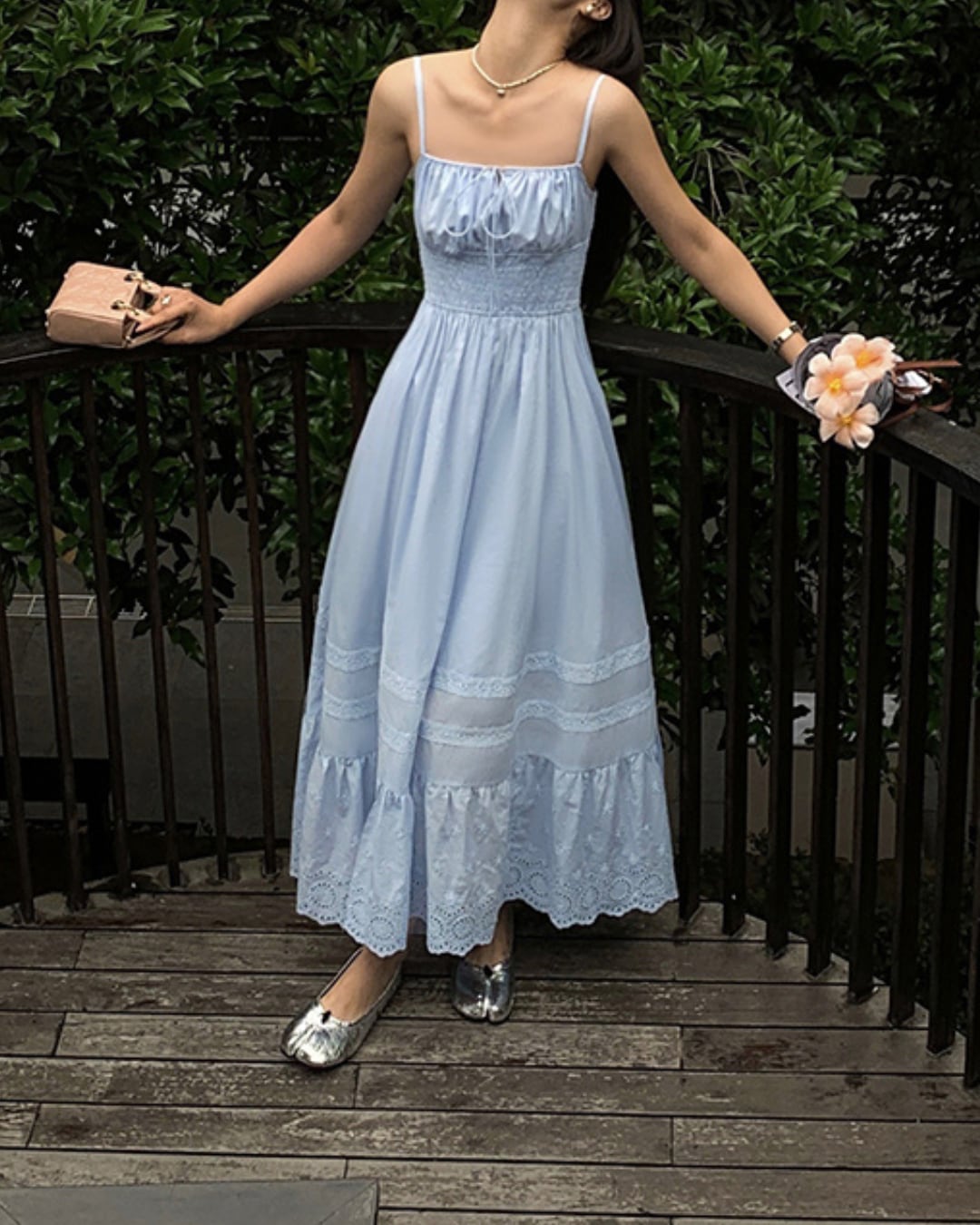 ロマンティックなムードを纏う、繊細なレースとギャザーデザインが魅力のロングキャミワンピース。ナチュラルなコットン素材でさらっと涼しく、肌当たりも優しく快適な着心地です。裾には刺繍レースがあしらわれ、上品な甘さをプラス。ふんわりAラインシルエットで女性らしさを引き立てます。デイリーにはもちろん、バカンスやリゾートシーンにもおすすめの一枚。友達とのお出かけやリンクコーデにも◎。