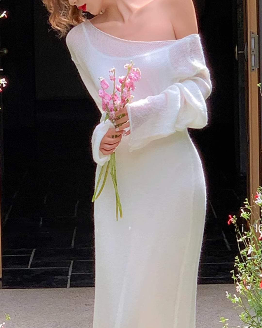軽やかな透け感とボディラインを美しく魅せるシルエットが魅力のニットワンピースセット。ふんわりとしたマーメイドラインと片方オフショルのデザインで、エレガントかつセンシュアルな印象に。セットのインナーワンピはインナーとしても単品でも活躍する万能アイテム。ガーデンシーンやリゾート、ディナーなどにもおすすめの1着です。