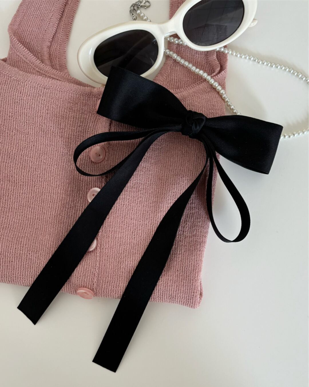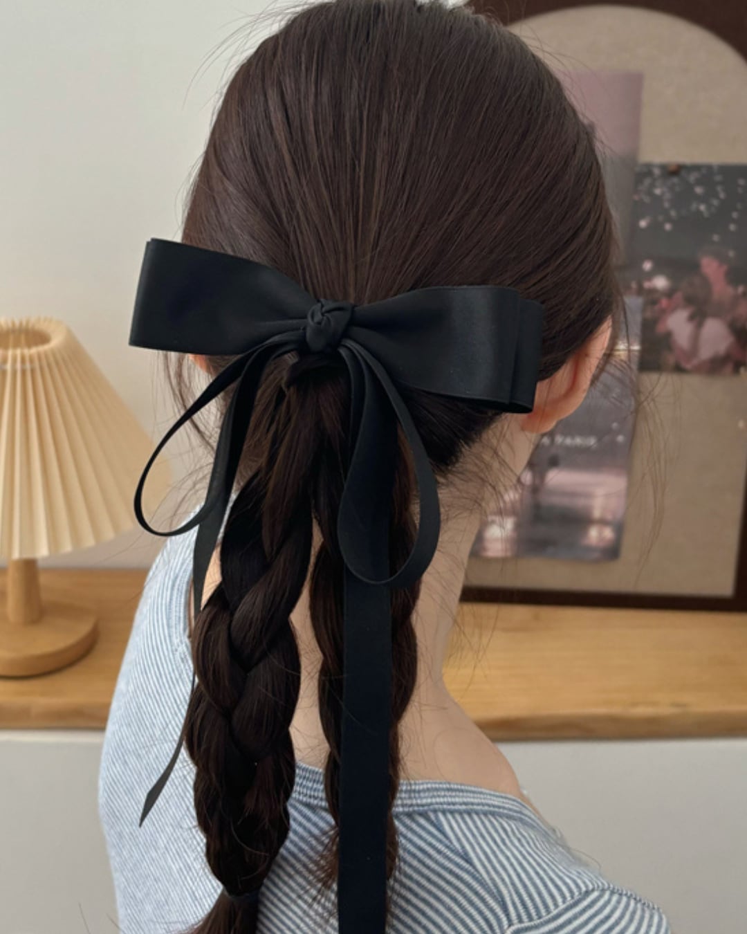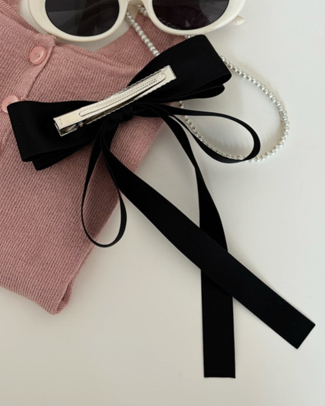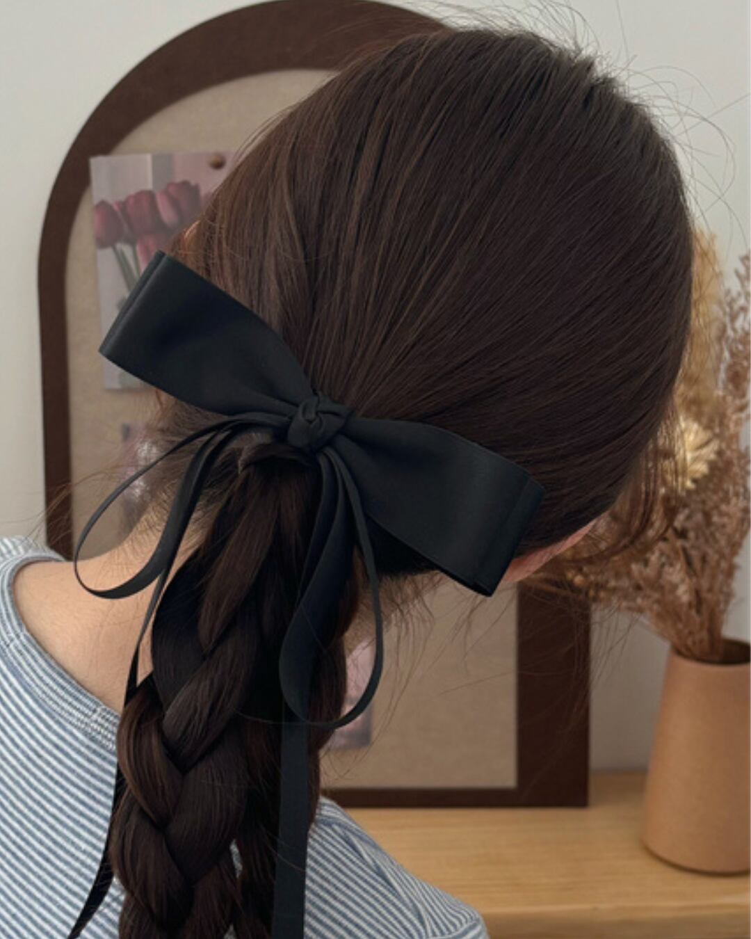大きめのサテンリボンが印象的なブラックカラーのバレッタ。揺れるリボンの飾りがフェミニンで上品な雰囲気を演出。シンプルなまとめ髪にプラスするだけで、ぐっと華やかに。デイリー使いからお呼ばれシーンまで幅広く活躍するアイテムです。