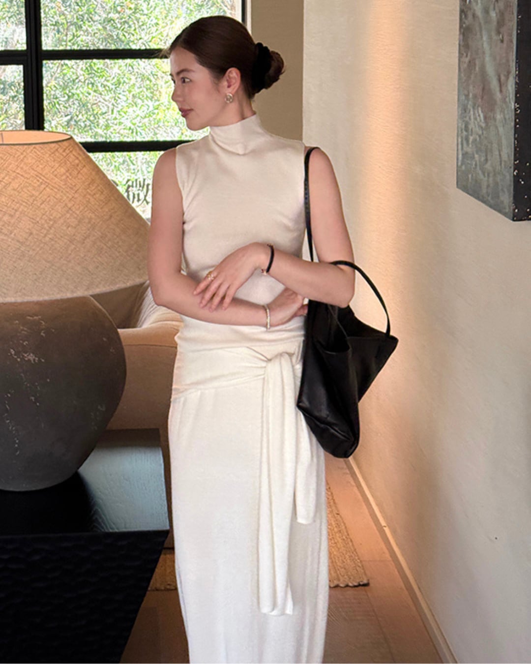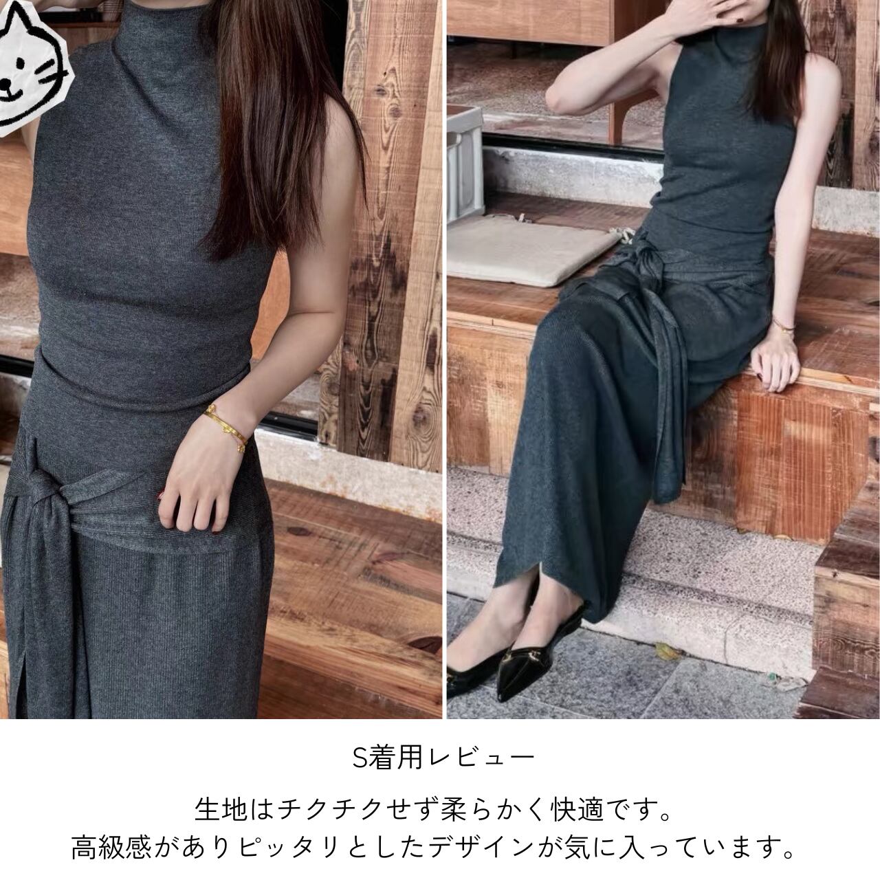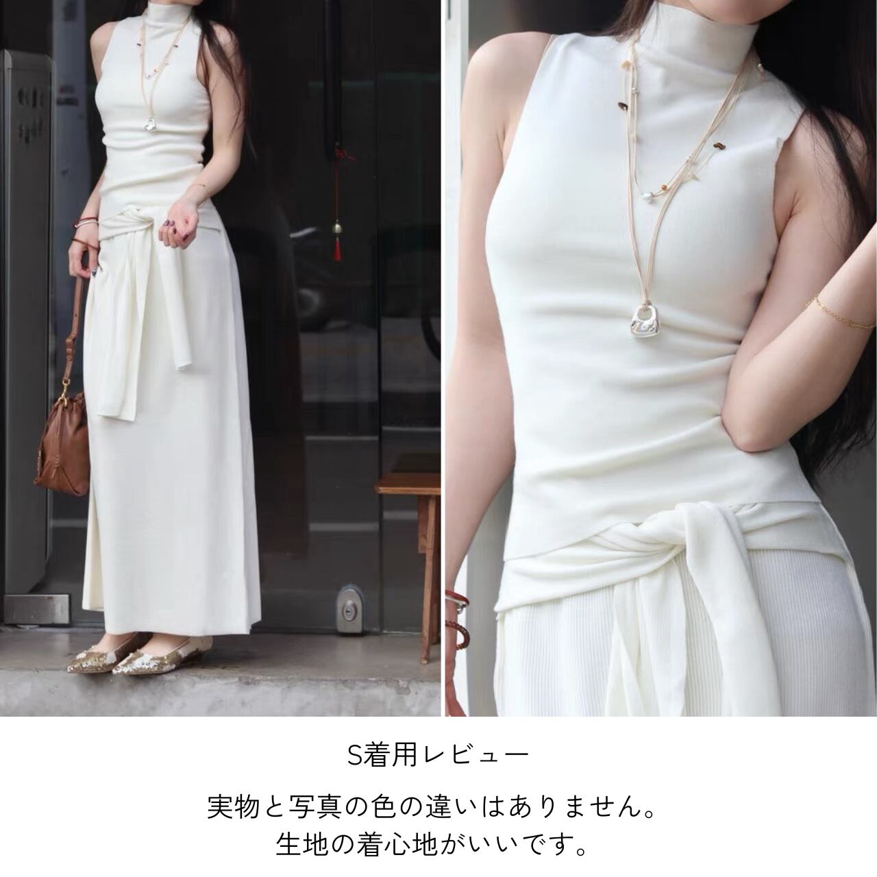 洗練された印象を与えるノースリーブハイネックトップスとストレートラインスカートのセットアップ。トップスはほど良いフィット感と絶妙なハイネックで首元をすっきり見せつつ、サイドのラインを拾いすぎず綺麗なシルエットをキープ。柔らかく伸縮性のある編地で着心地も快適。スカートはウエストリボン付きで気になるお腹周りを自然にカバーしながら、ストンと落ちるIラインがスタイルアップを実現。上品な素材感とスマートなフォルムで、デイリーからお出かけまで幅広く活躍します。白は淡色インナーの着用をおすすめします。