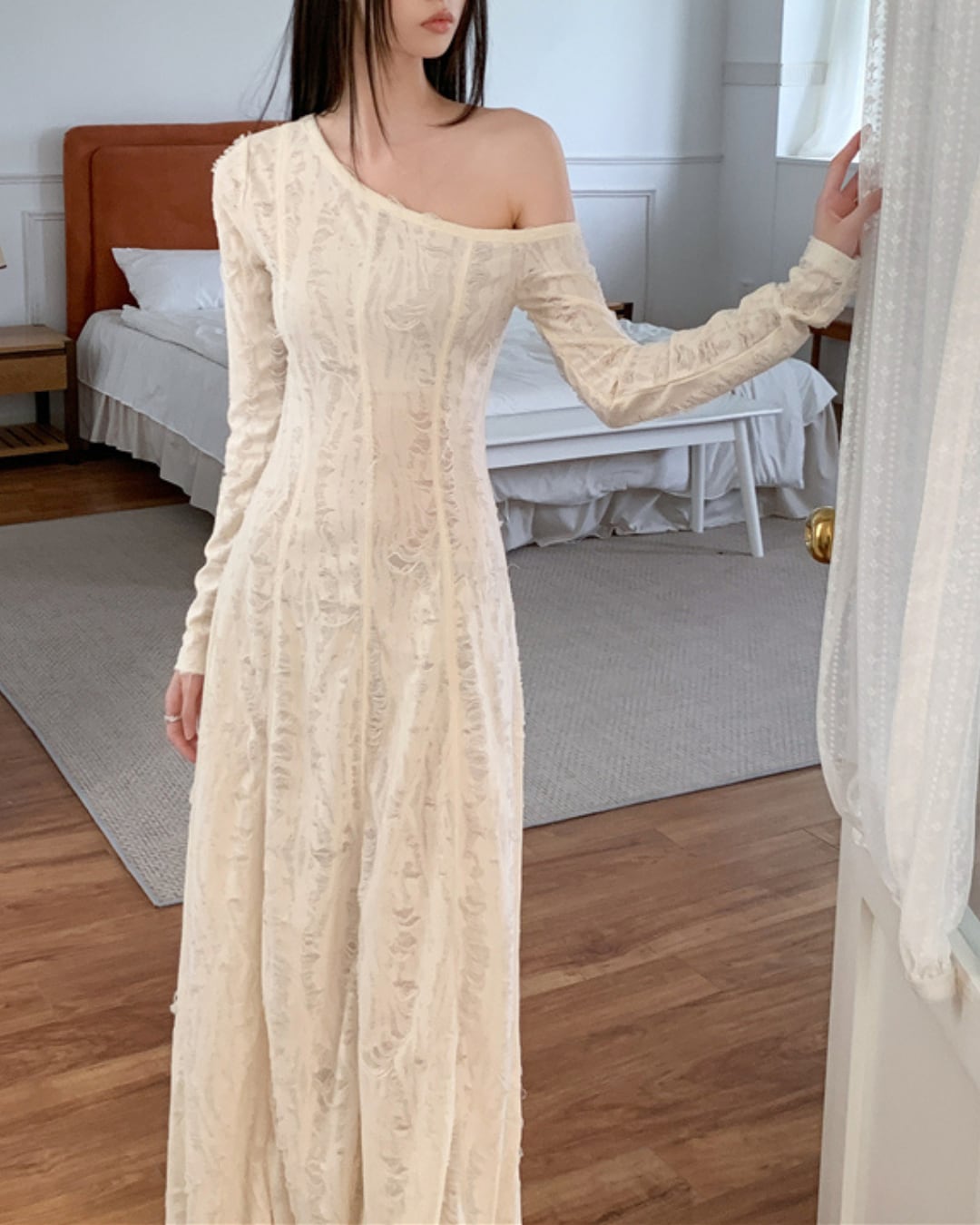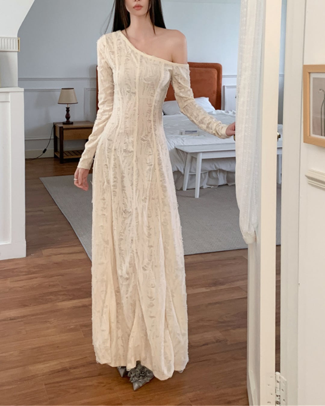 エレガントな斜めオフショルダーが特徴的なマキシ丈ワンピース。繊細な光沢と立体感のある素材が動くたびに優美な印象を与えてくれます。程よくボディラインに沿うシルエットで、特別な日やお呼ばれにもぴったりな一着です。
