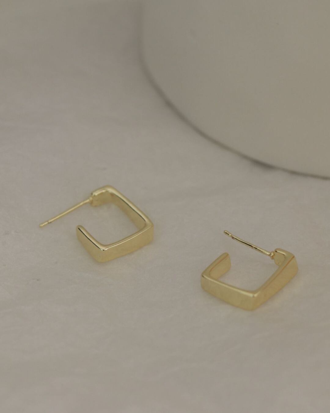 シャープな印象のスクエア型が特徴のミニフープピアス。小ぶりながらも存在感のあるゴールドカラーが耳元をさりげなく華やかに演出。シンプルで合わせやすく、デイリーにもフォーマルにもマルチに活躍します。