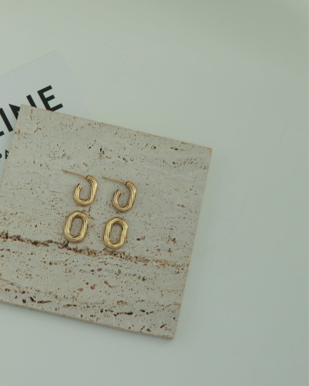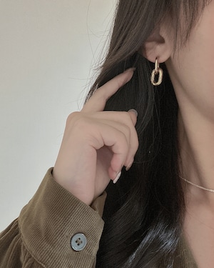 上品な光沢感と程よいボリューム感が魅力のツイストチェーンデザインピアス。立体感のあるダブルパーツが耳元で揺れ、シンプルながらもスタイリッシュな印象を演出します。日常使いはもちろん、モード感のあるコーディネートにもマッチする万能アクセサリーです。