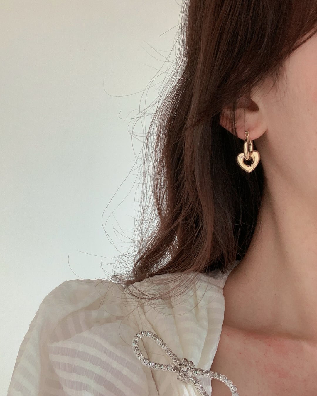 立体的なツイストデザインが印象的なハートモチーフフープピアス。波打つような柔らかいカーブのポストが特徴で、女性らしさとモード感を兼ね備えたデザインです。耳元で程よく存在感を放ち、シンプルなコーディネートのアクセントにもぴったり。オン・オフ問わず使える万能アイテムです。
