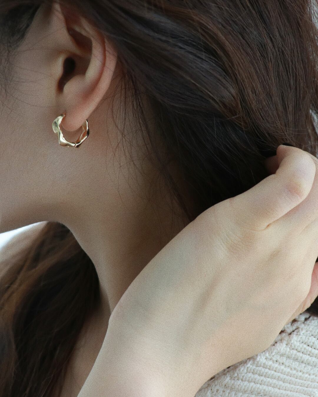 波打つような立体ラインが印象的なフープイヤリング。やわらかく曲線を描くデザインが耳元に個性をプラスし、ミニマルながらも存在感のある一品です。シルバー・ゴールド・ブラックの3色展開で、コーディネートに合わせて選べるのも魅力。ノンホールタイプで耳に優しく、ピアス穴がなくても楽しめるアイテムです。