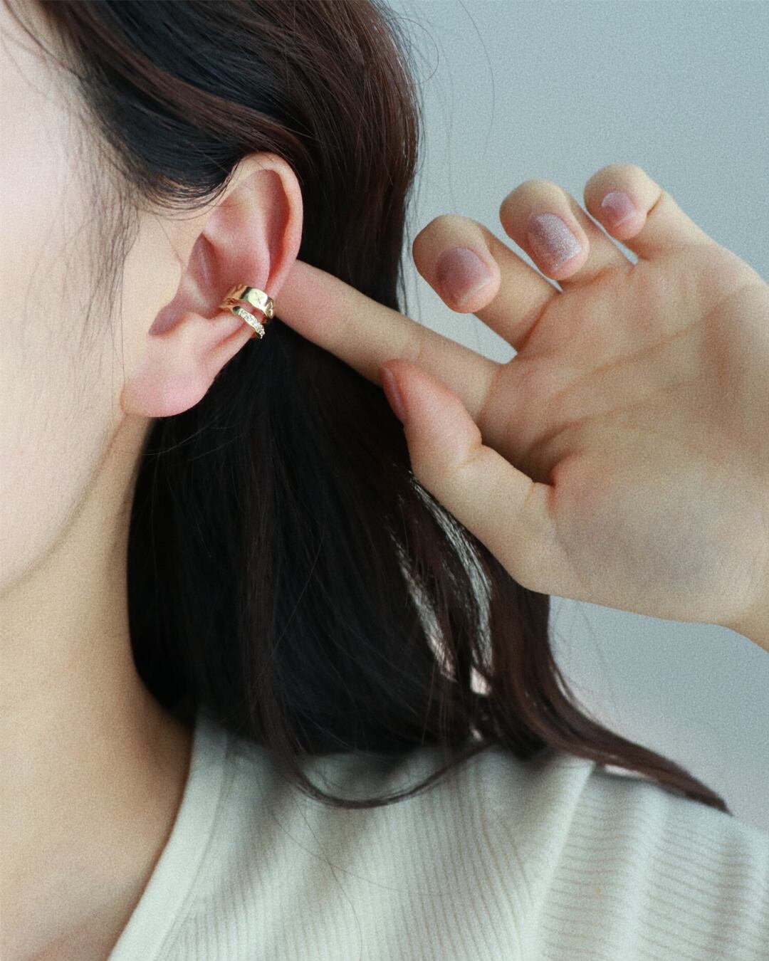 シンプルながらも存在感のあるツインデザインのイヤーカフ。異なる質感を重ねたようなデザインが耳元をおしゃれに引き立てます。ピアスホール不要で、挟むだけの簡単装着が魅力。