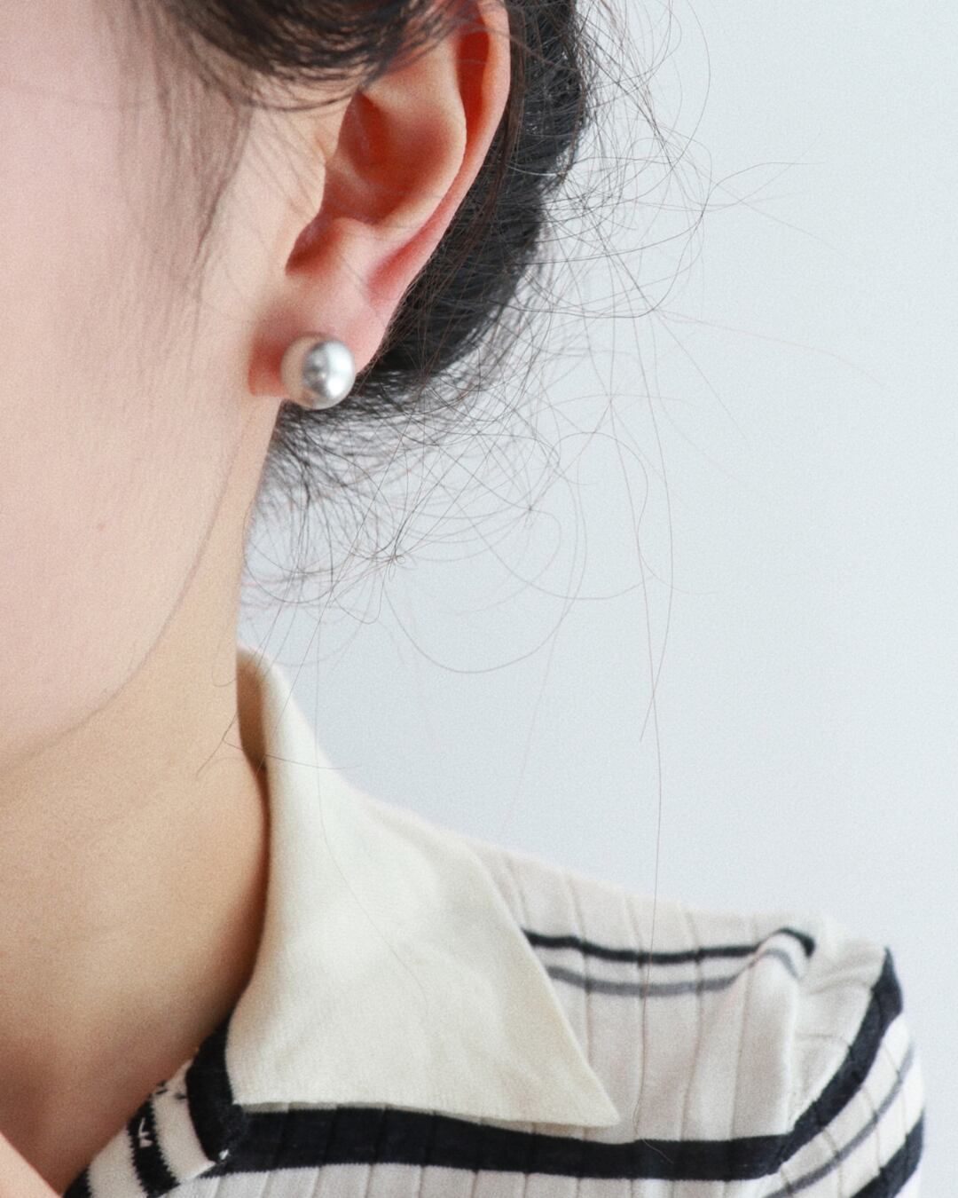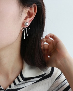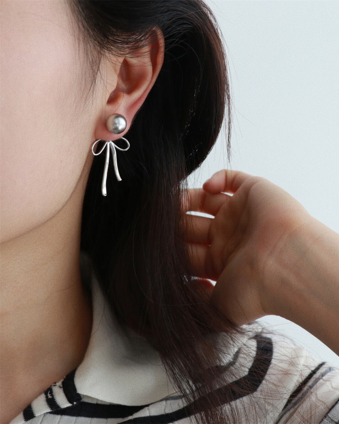グレーパールに小さなリボンモチーフを合わせた可憐なデザインのイヤリング。耳元にさりげない上品さと女性らしさをプラスします。デイリーから特別な日のおしゃれまで幅広く活躍するアクセサリーです。