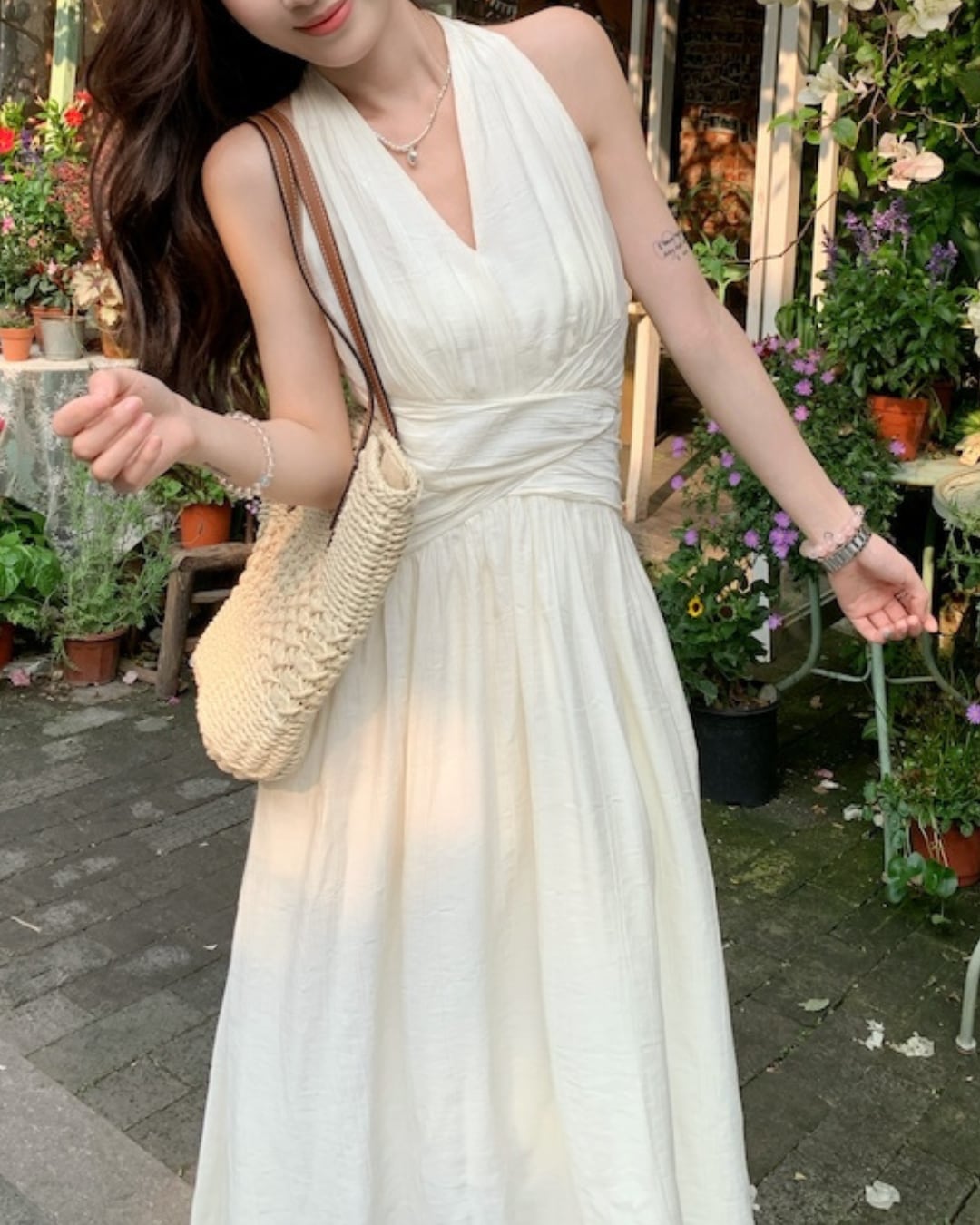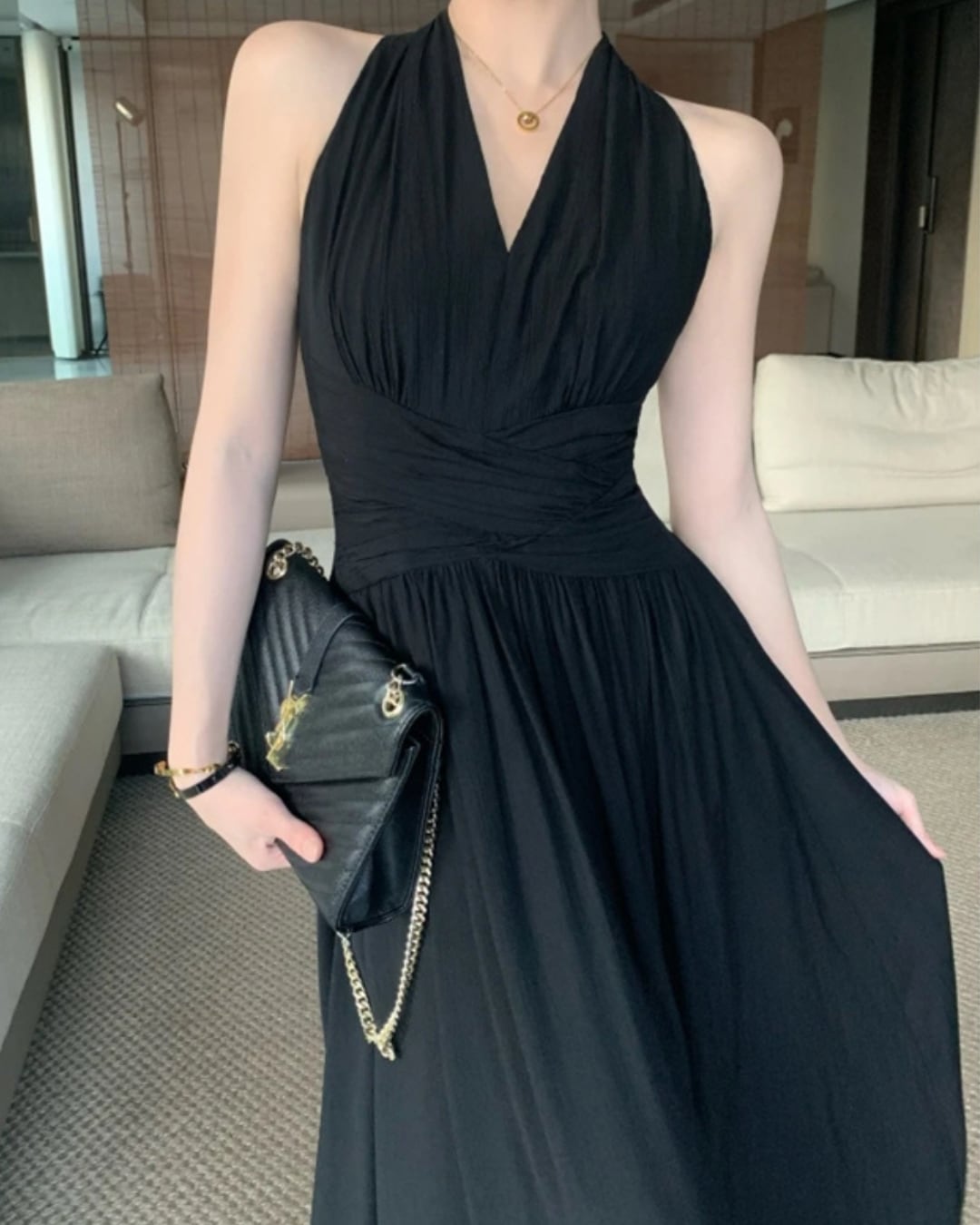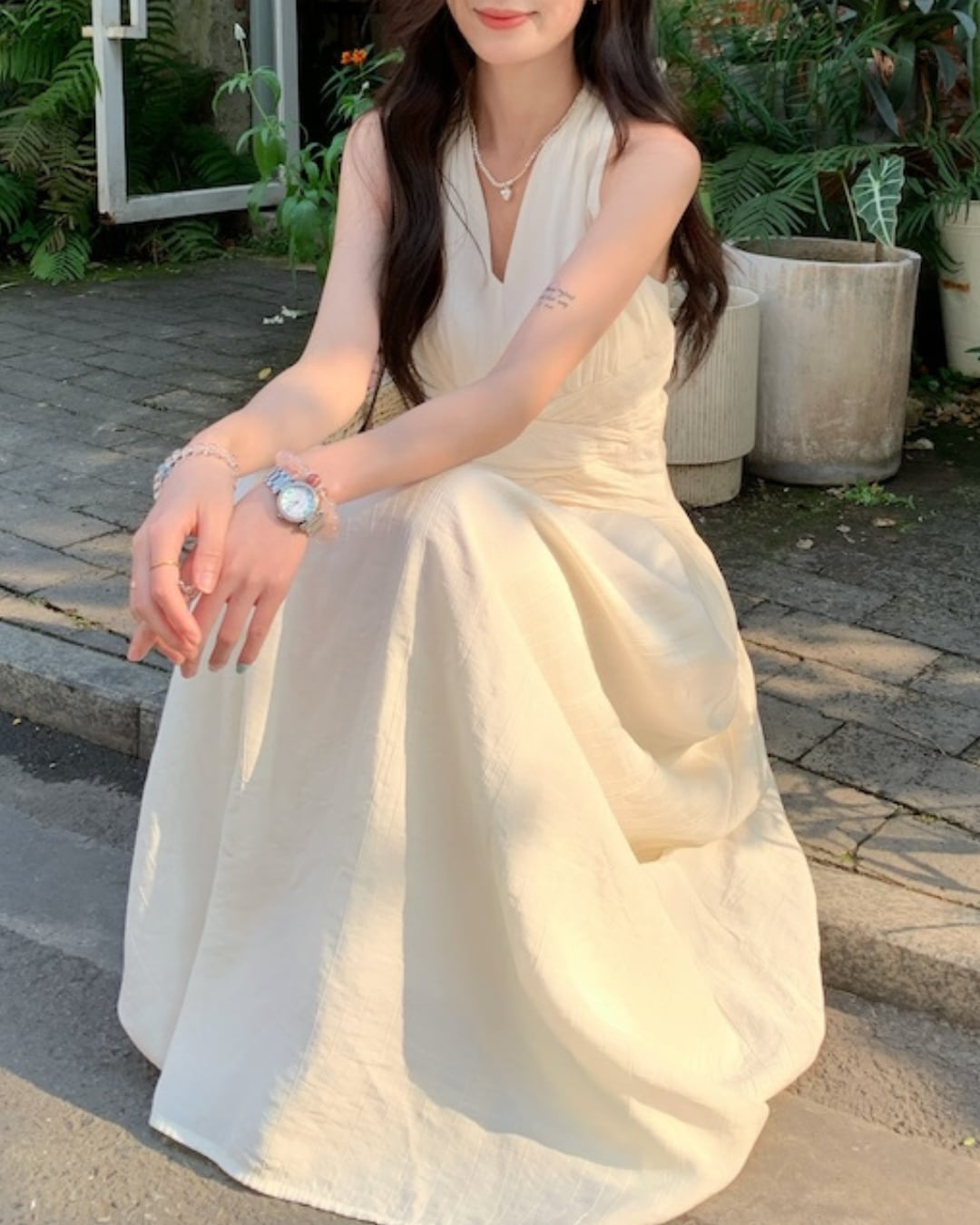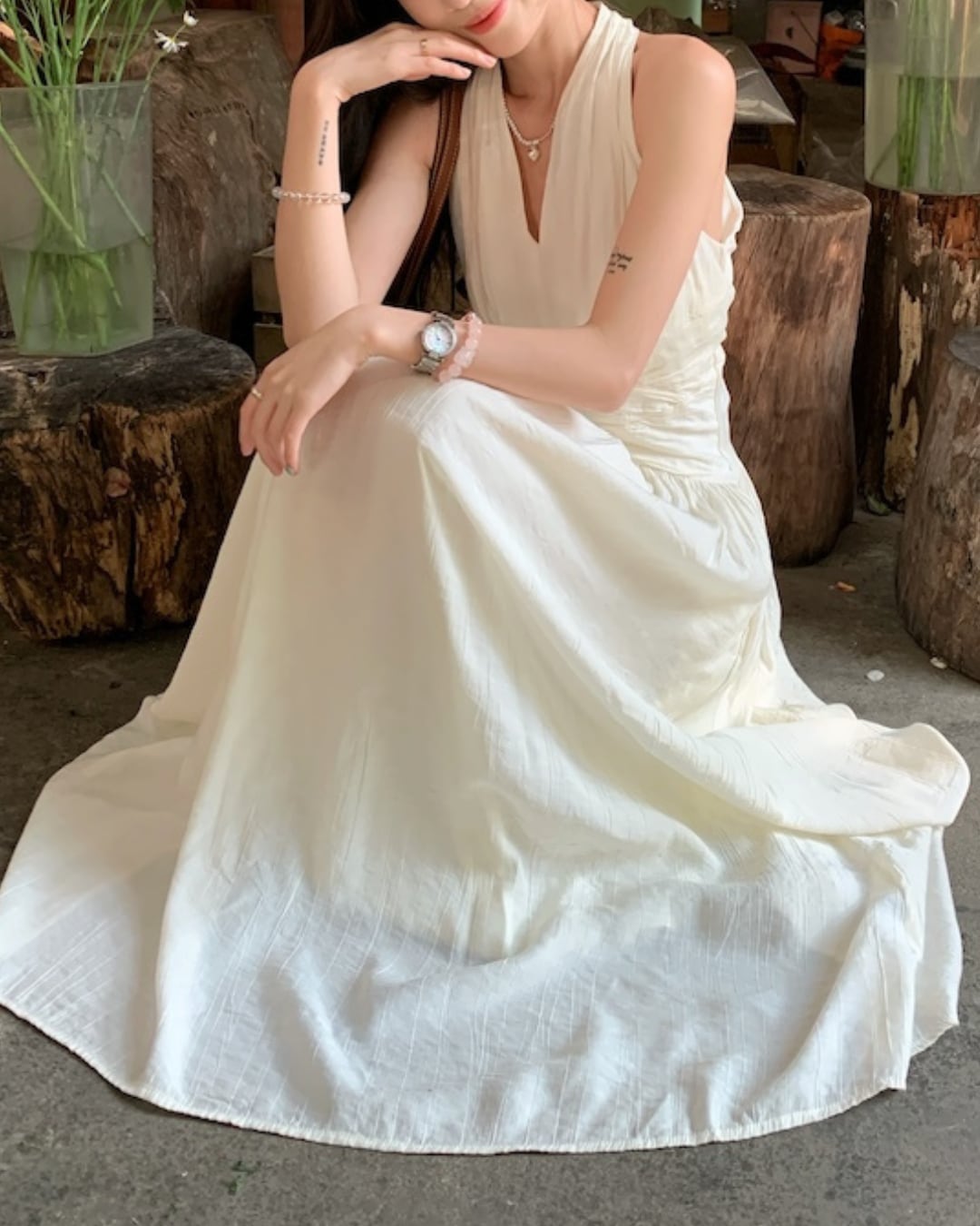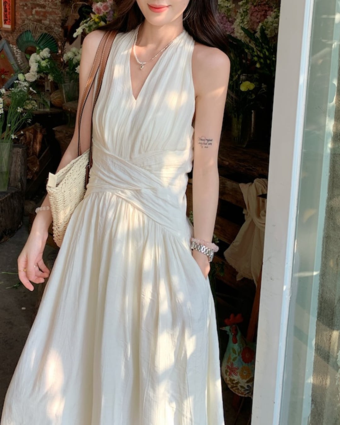 美しいドレープ感と女性らしいシルエットが魅力のホルターネックロングワンピース。Vネックデザインでデコルテをすっきり見せ、歩くたびに揺れる柔らかな生地がエレガントな印象に。リゾートからデイリーまで幅広く活躍する一枚です。
