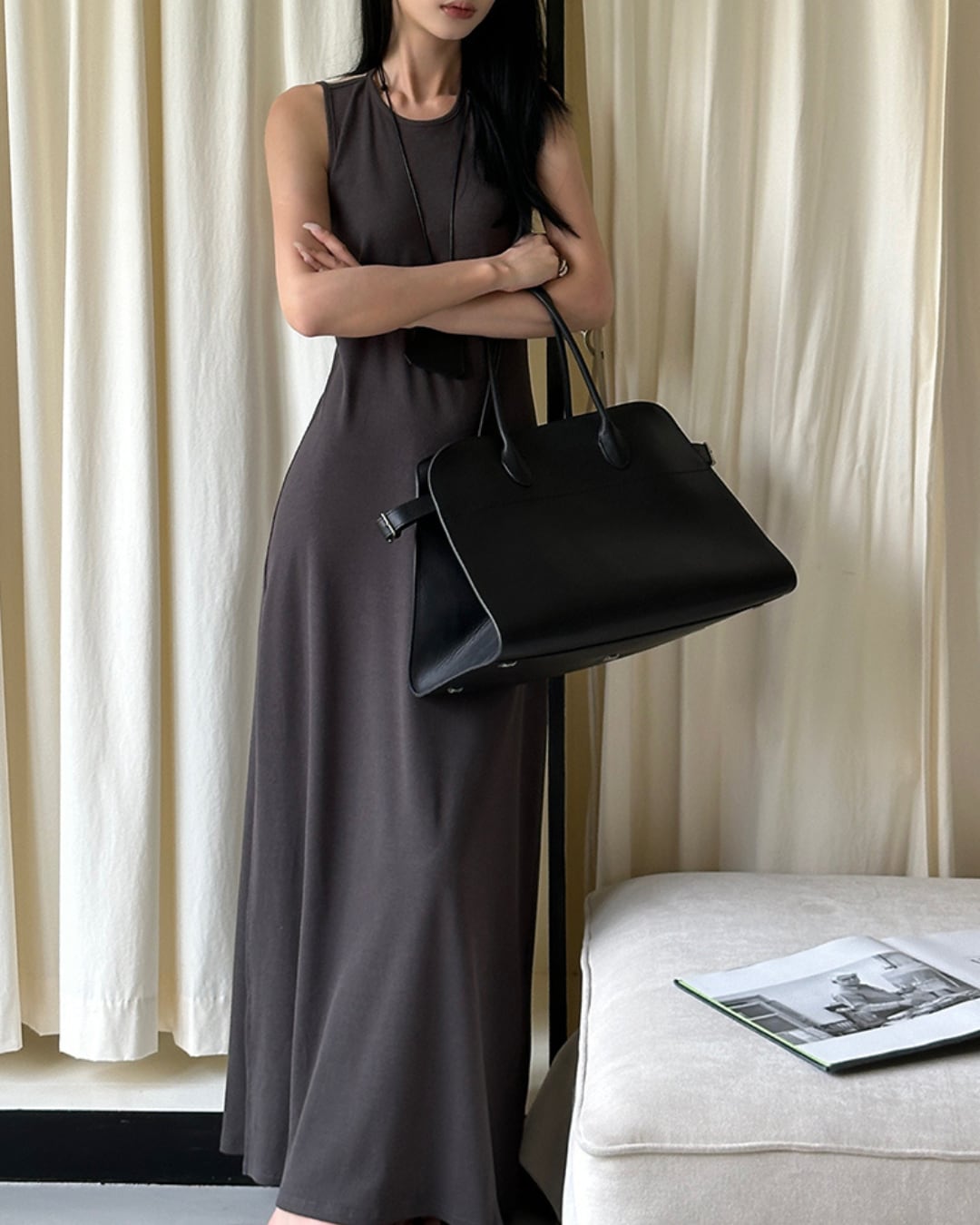 シンプルながらも、背中の大胆なカッティングとサイドスリットがモードな抜け感を演出するノースリーブワンピース。ボディラインに沿うすっきりとしたシルエットで、女性らしさと洗練さを兼ね備えた一枚。柔らかく伸縮性のある素材で、着心地も抜群です。