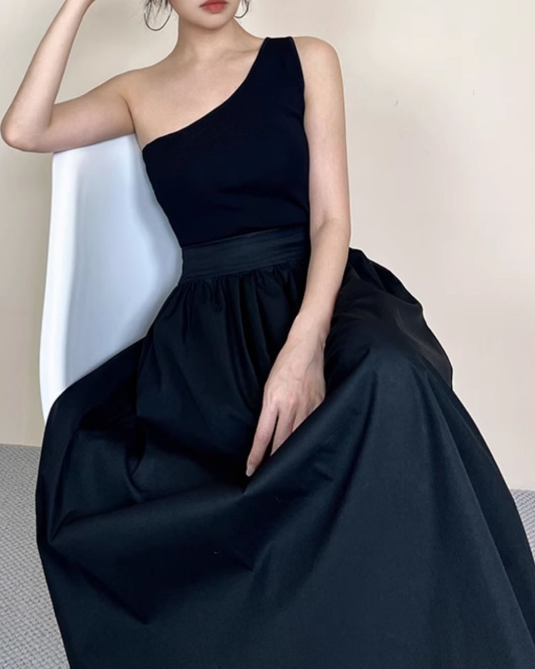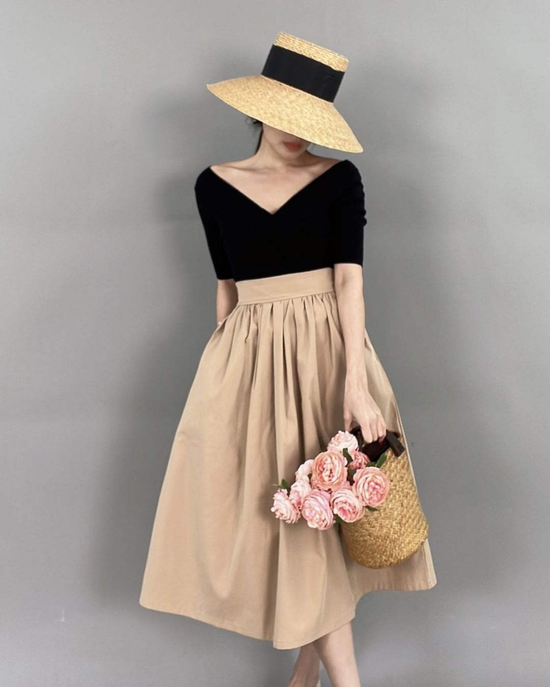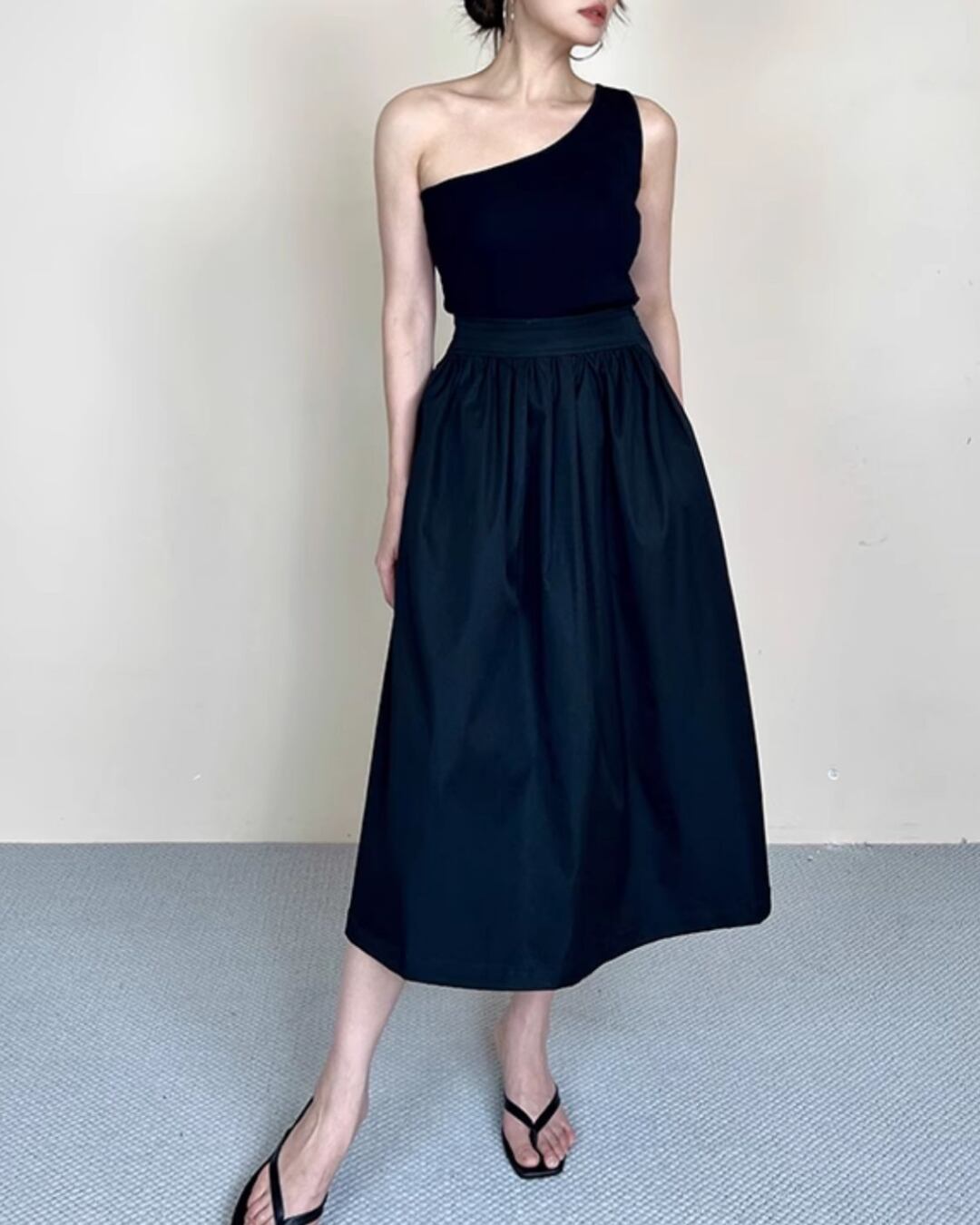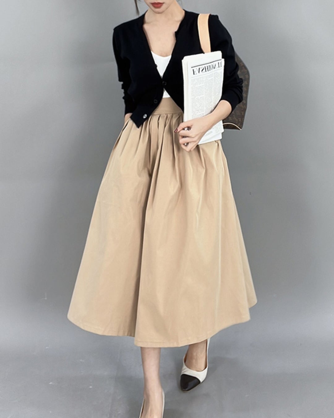 #フレアスカート #タックデザイン #Aライン #高ウエスト #ウエストゴム #フェミニン #ミモレ丈