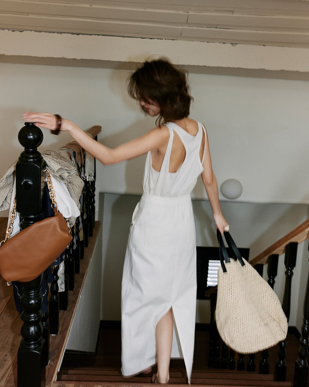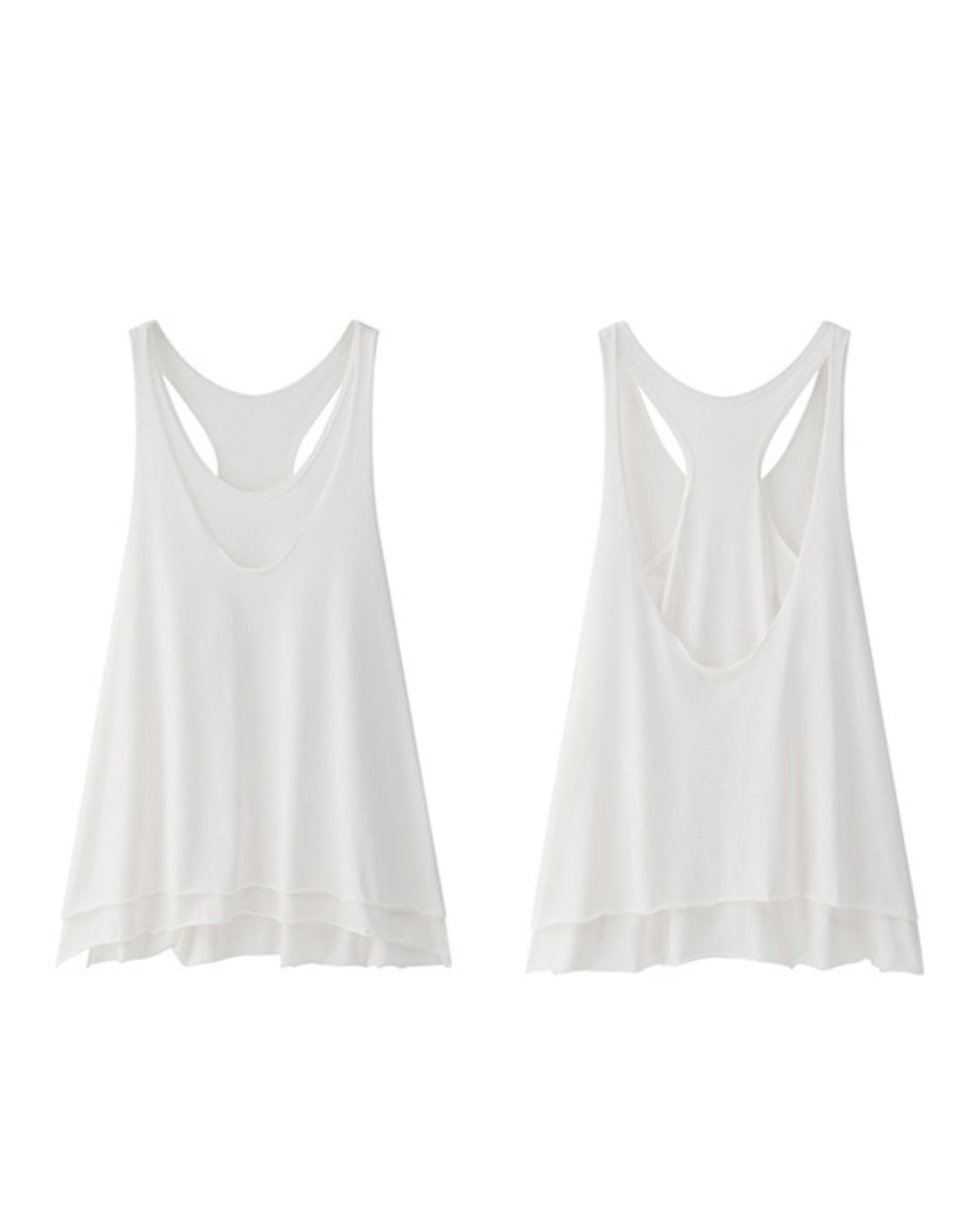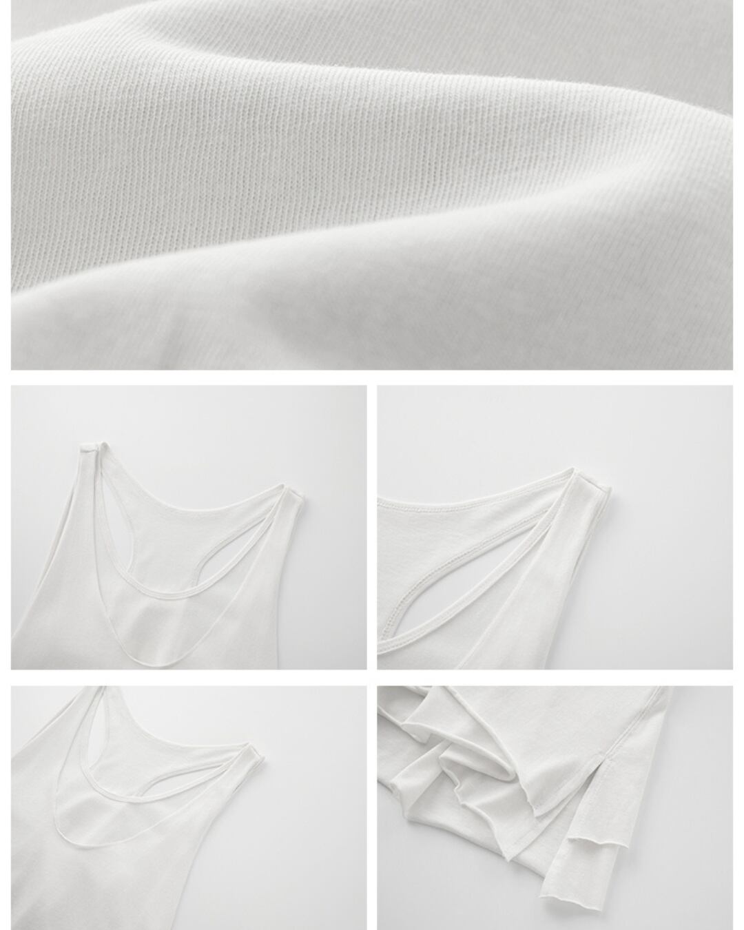 重ね着風の2枚仕立てがポイントのホワイトタンクトップ。背中側にかけてスリット風に重なり合うデザインが抜け感を演出。カジュアルな西装スタイルやスカートとのレイヤードコーデにもぴったり。柔らかく通気性の良い素材で春夏シーズンに大活躍の1枚。