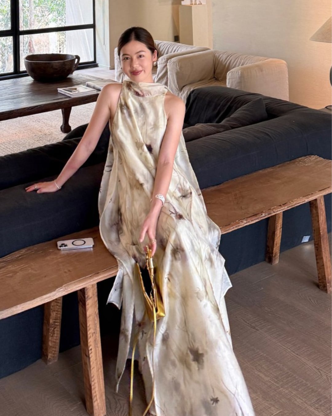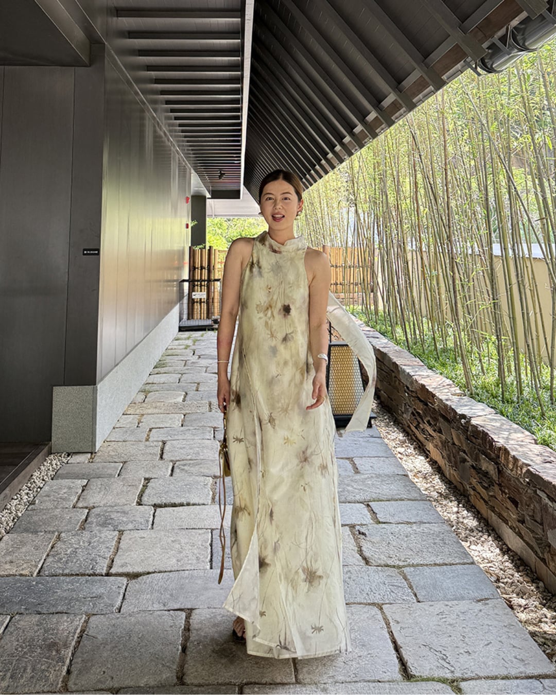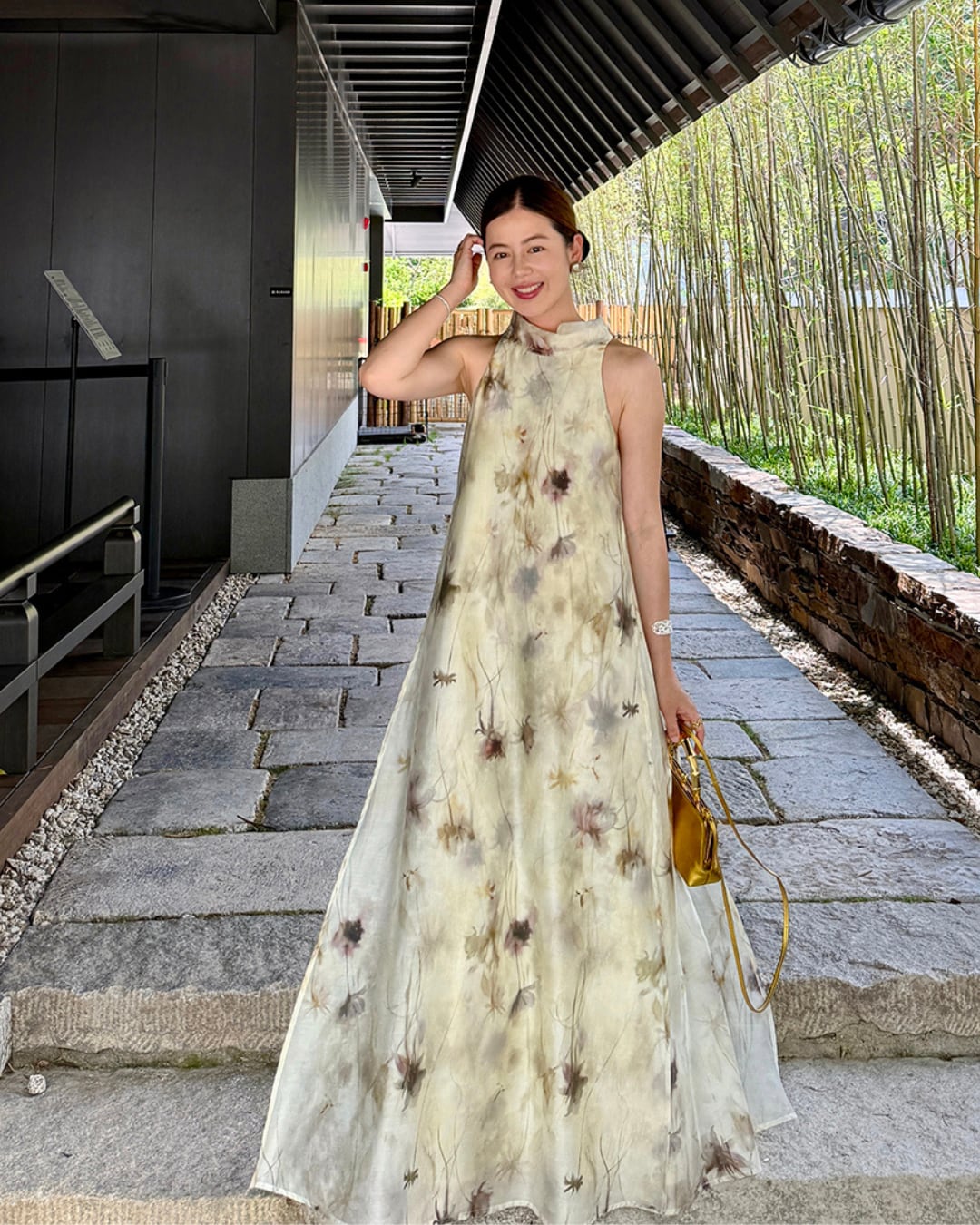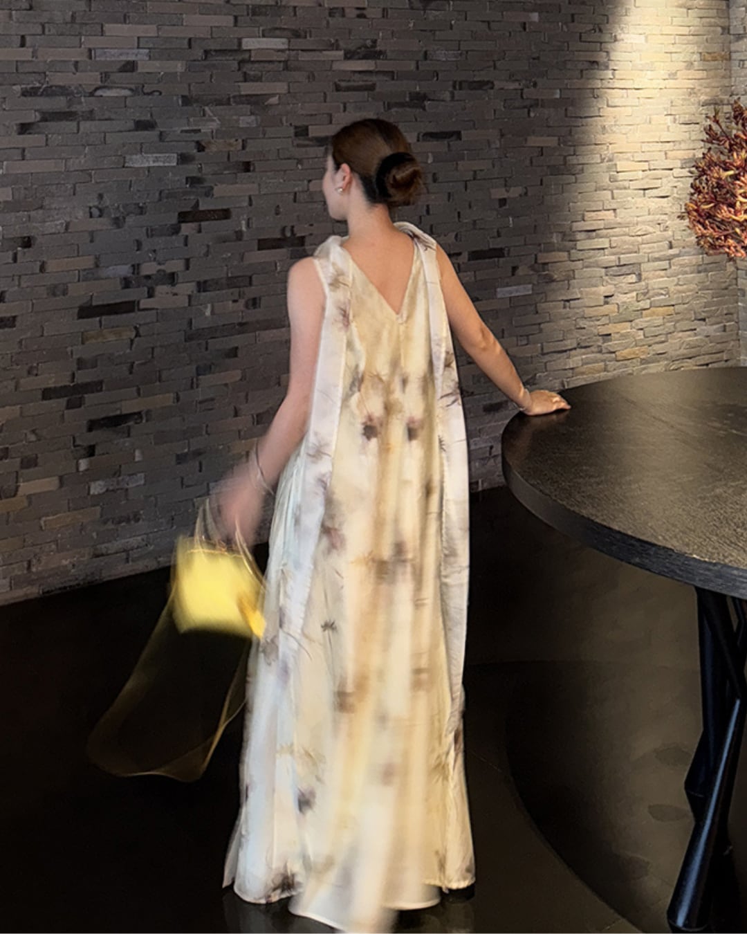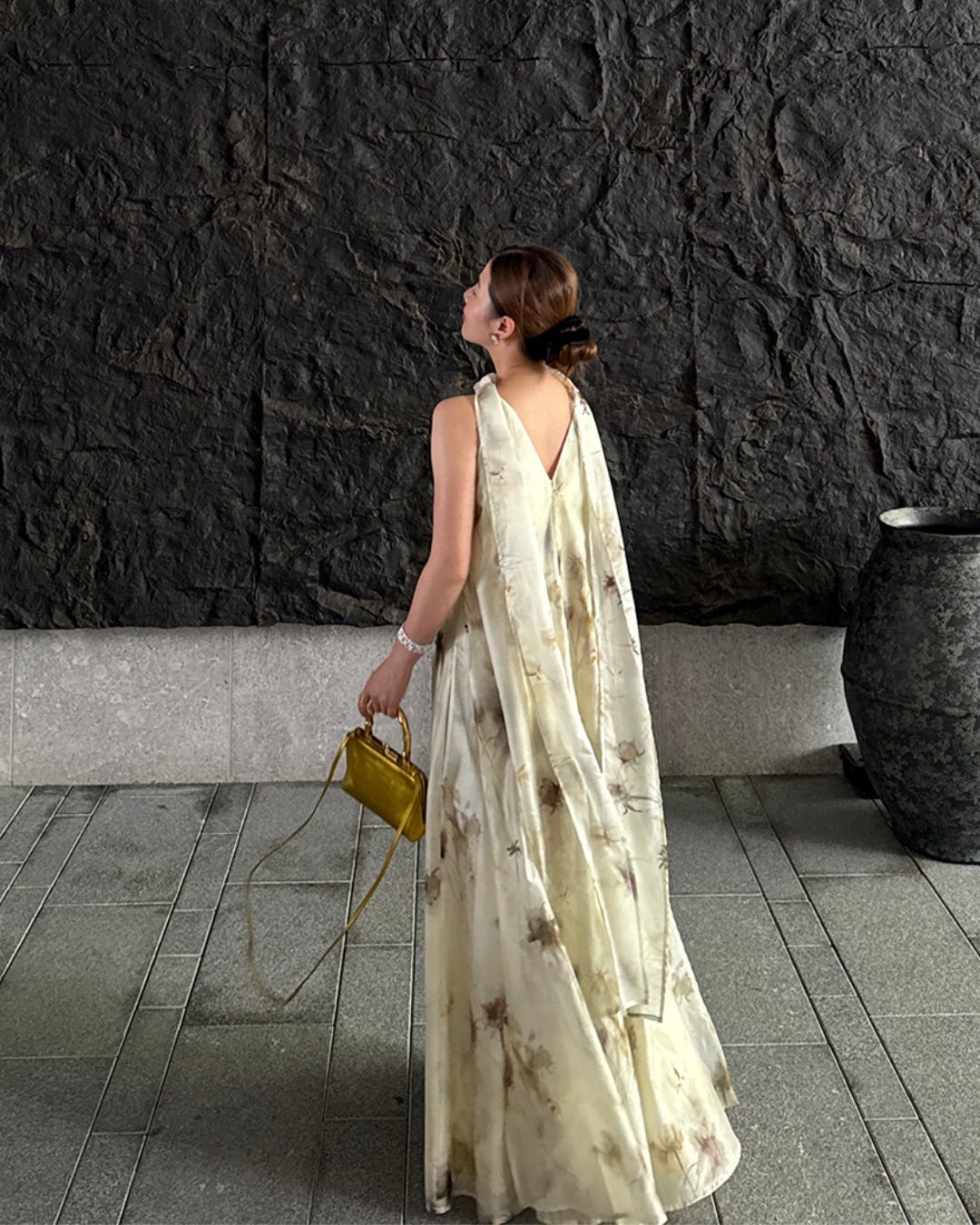 優雅な水墨風プリントが目を惹くロングワンピース。軽やかで通気性に優れたリヨセル混素材で、たっぷりと生地を使用した贅沢な2層仕立て。全体はゆったりとしたシルエットで体型を選ばず、両サイドには便利なポケット付き。首元にはロングタイを配し、リボン結びや垂らしなどアレンジ可能で動きに合わせて揺れる様子も魅力的。前後どちらでも着用できる2WAY仕様で、前にすると小さめスタンドネック、後ろにするとVネックでデコルテを美しく演出。両サイドのスリットが歩くたびにふわっと揺れ、洗練された女性らしさを引き立てます。
