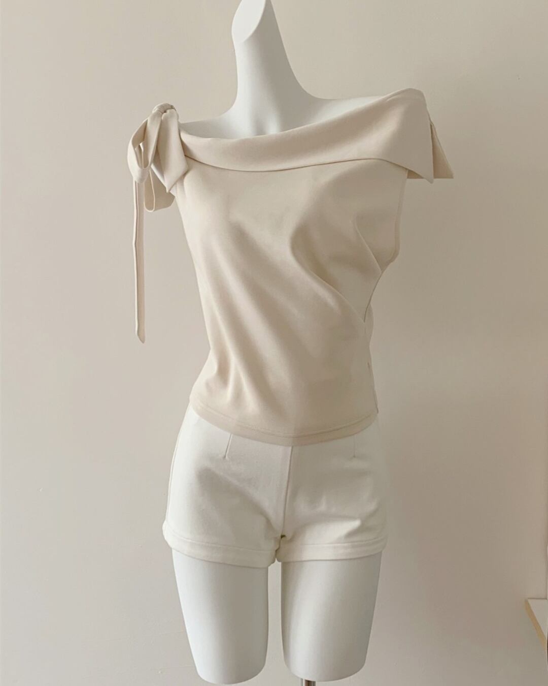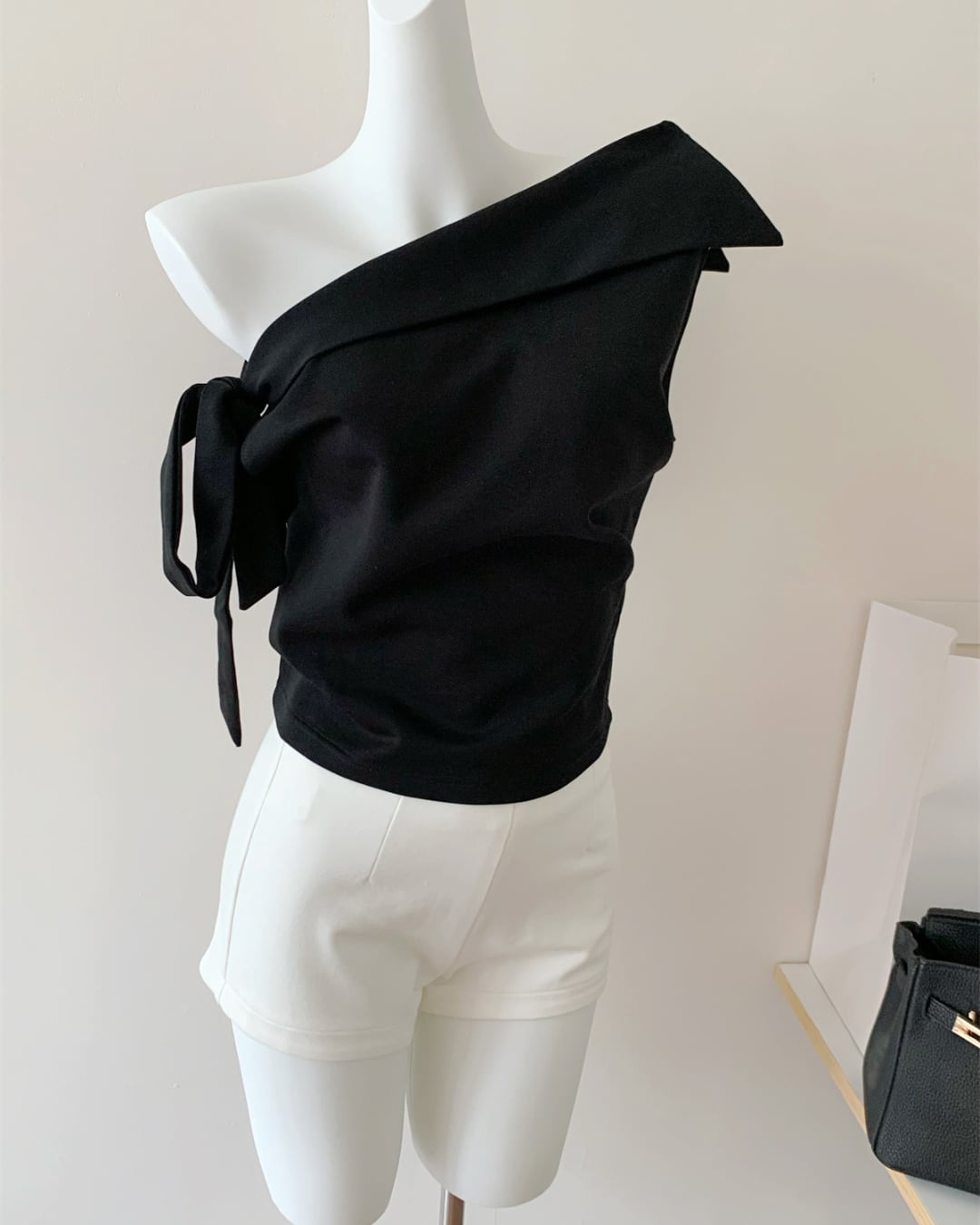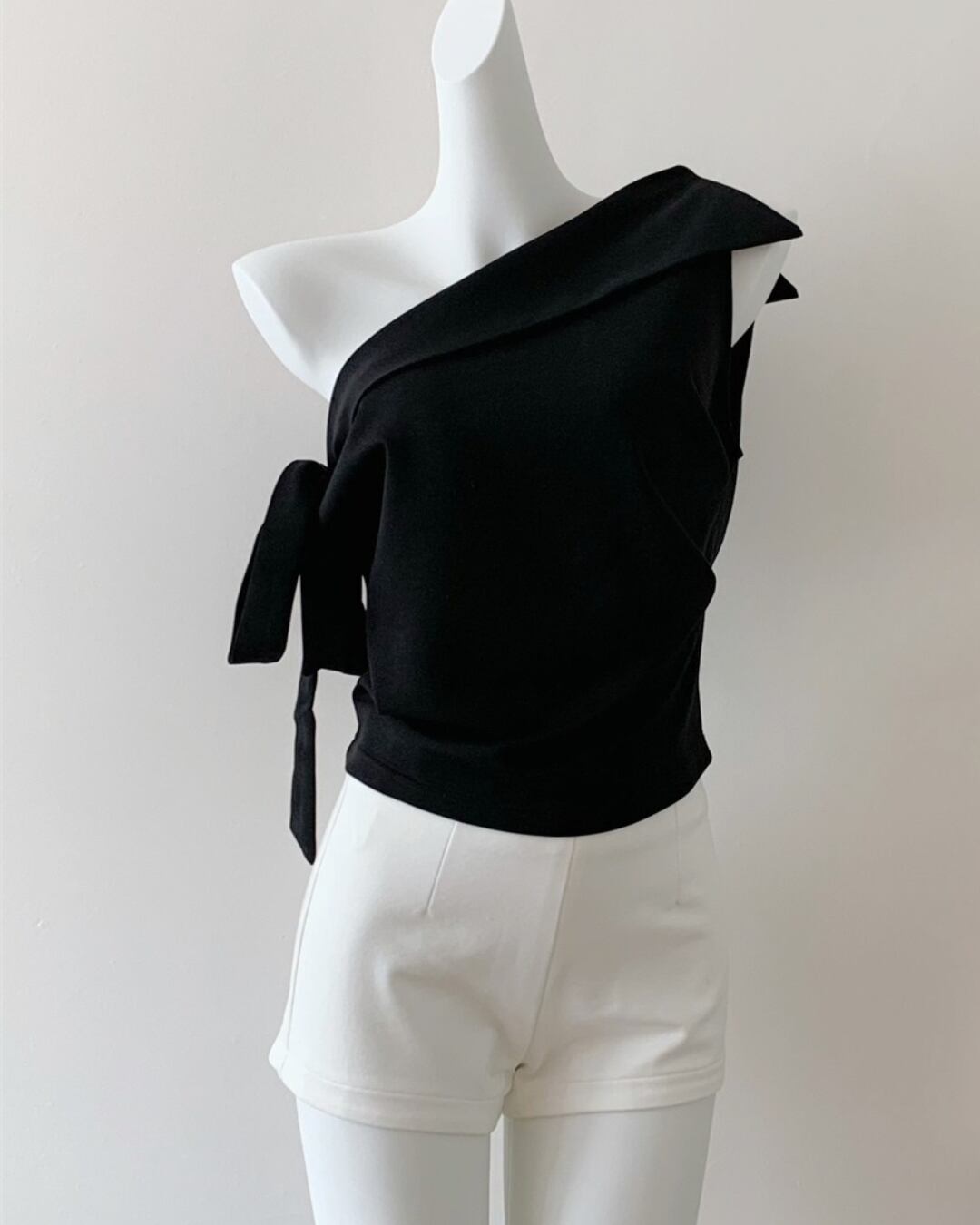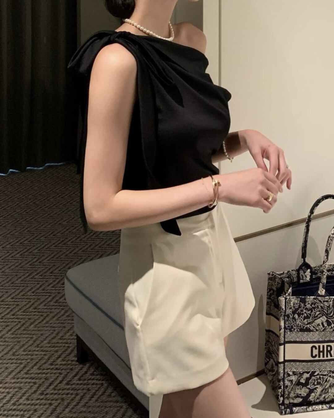 片側のリボンがアクセントになったワンショルダーデザインのトップスです。シンプルながらも女性らしいドレープとフィット感が魅力で、通勤からカジュアルまで幅広く活躍します。伸縮性のある素材で着心地も快適。夏のスタイリングにぴったりのアイテムです。