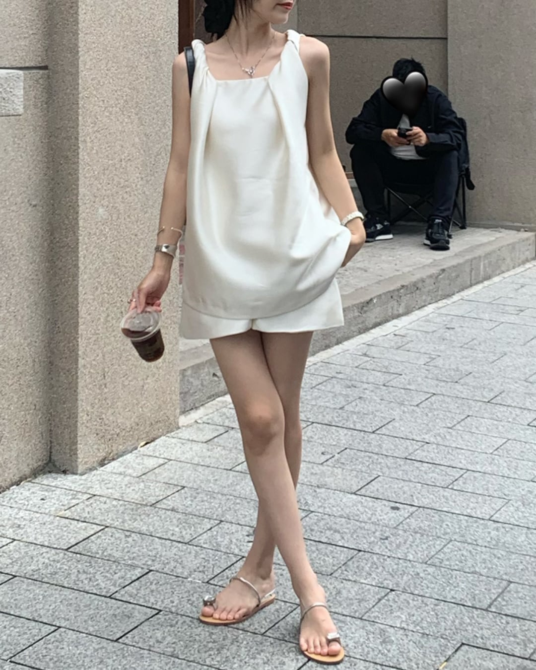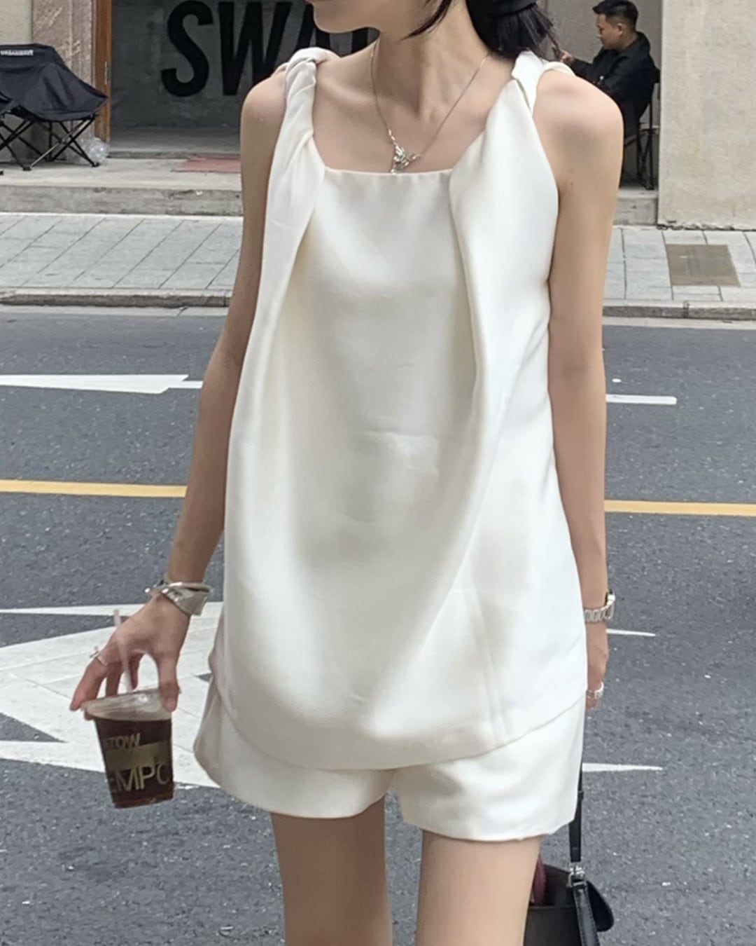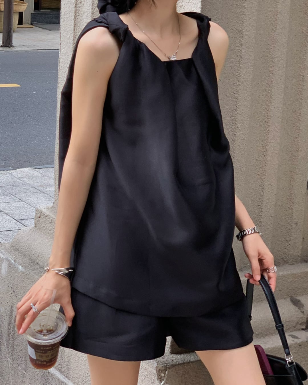 肩ひもデザインが特徴のシンプルセットアップです。ゆったりとしたシルエットでリラックスした着心地。軽やかな素材感で夏のデイリーにぴったり。ブラックとシャンパンアプリコットの2色展開で、どちらも合わせやすいカラーです。