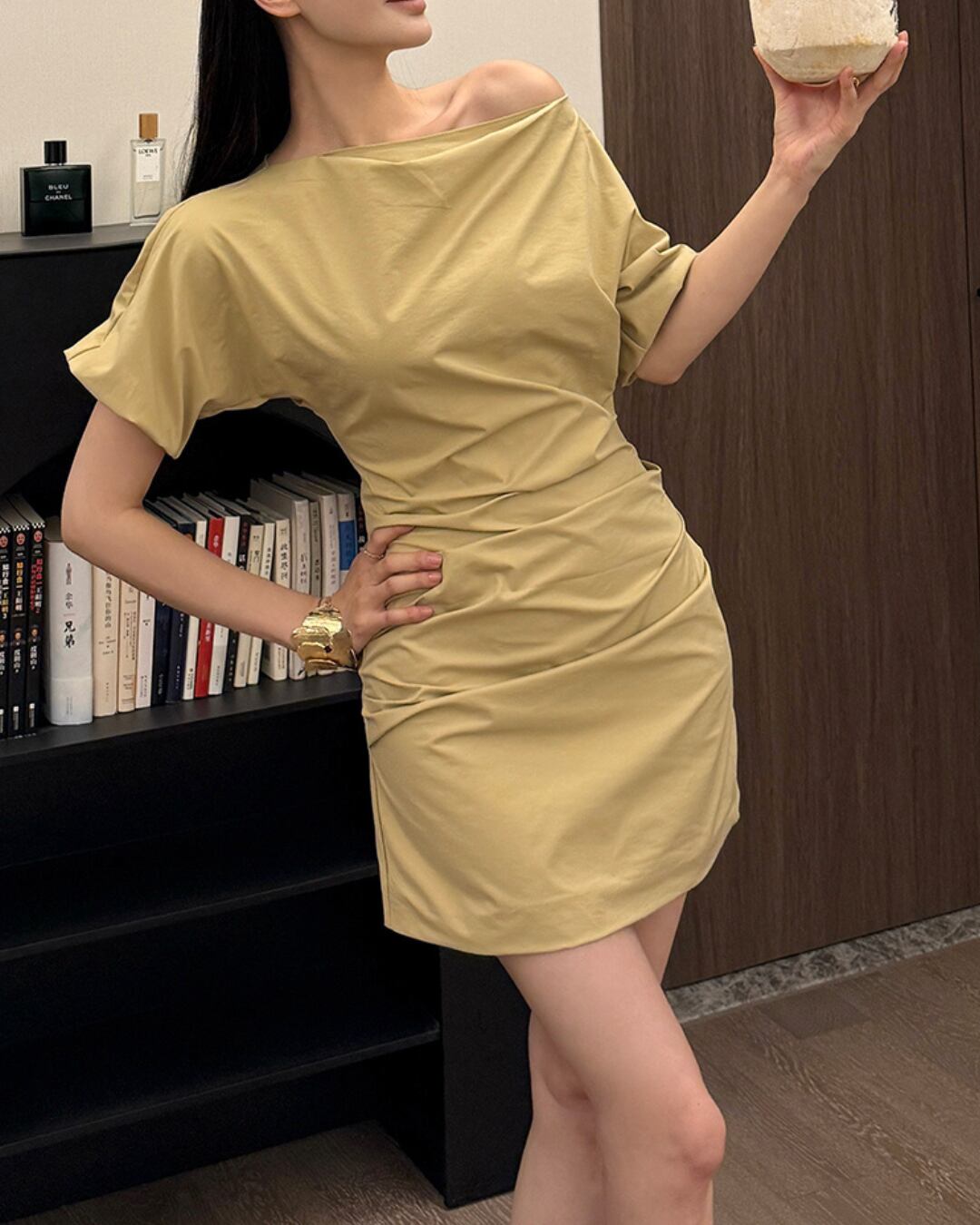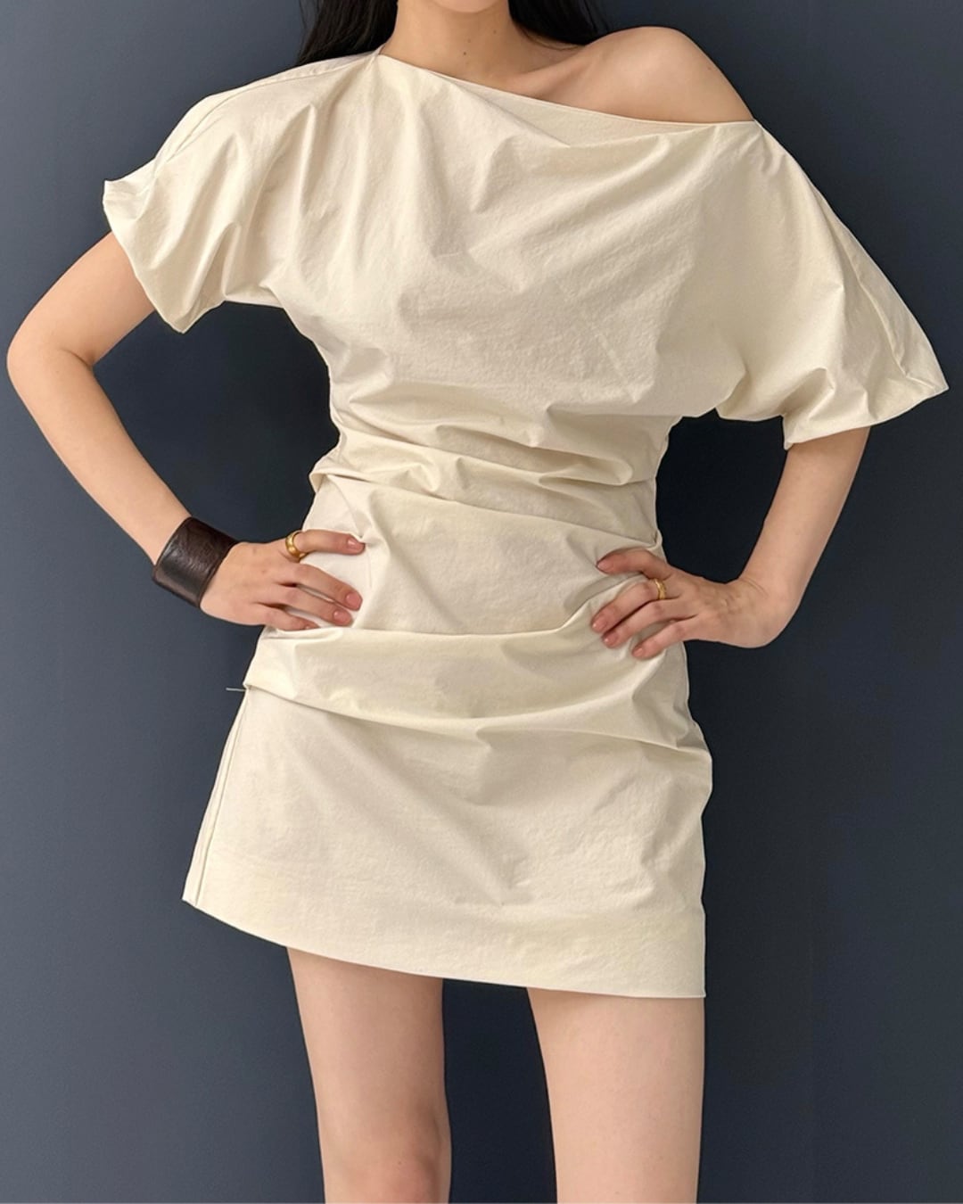 #ワンショルダー #ギャザーデザイン #ミニワンピース #斜めネック #春夏コーデ #周淼ワンピース
