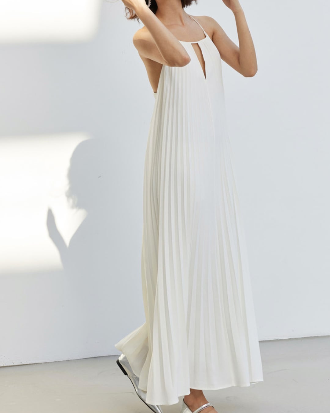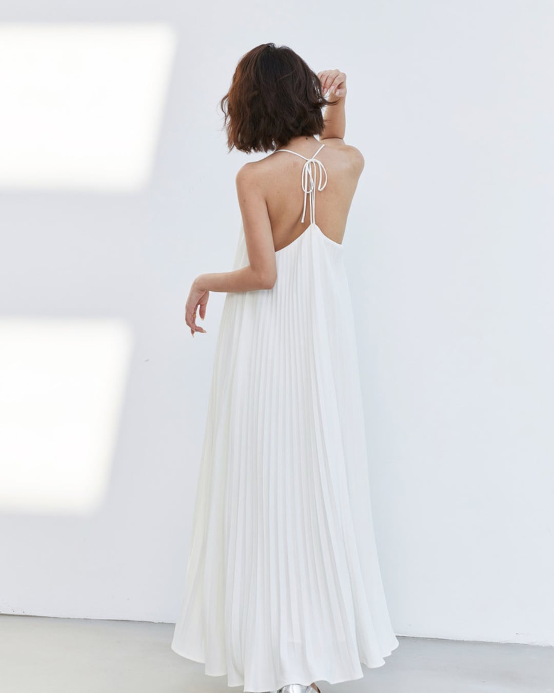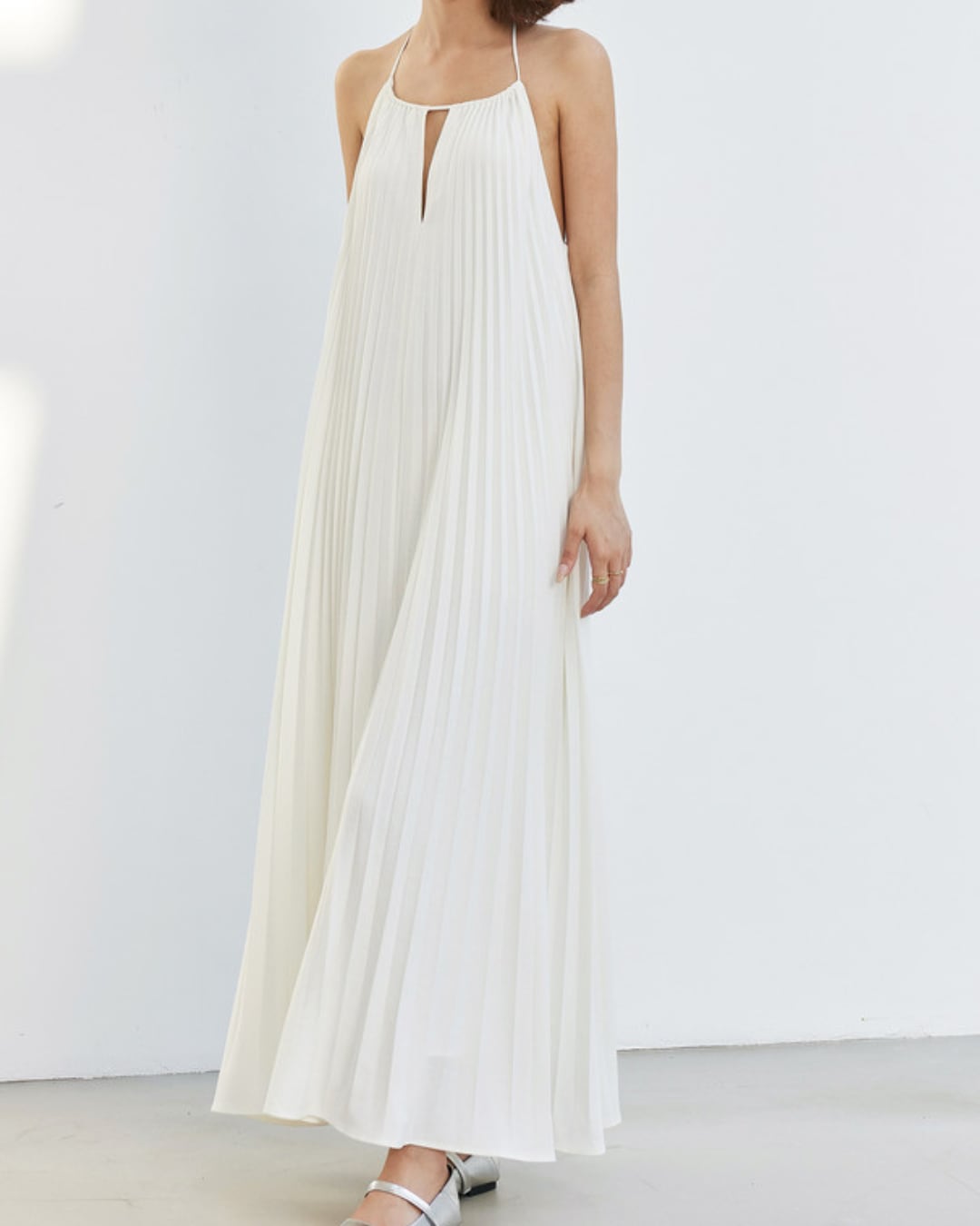 軽やかな揺れ感が美しいプリーツデザインのホルターワンピース。胸元のカッティングと背中の大胆な開きが、夏らしい抜け感を演出してくれます。エレガントで洗練された印象に仕上がる一枚です。
