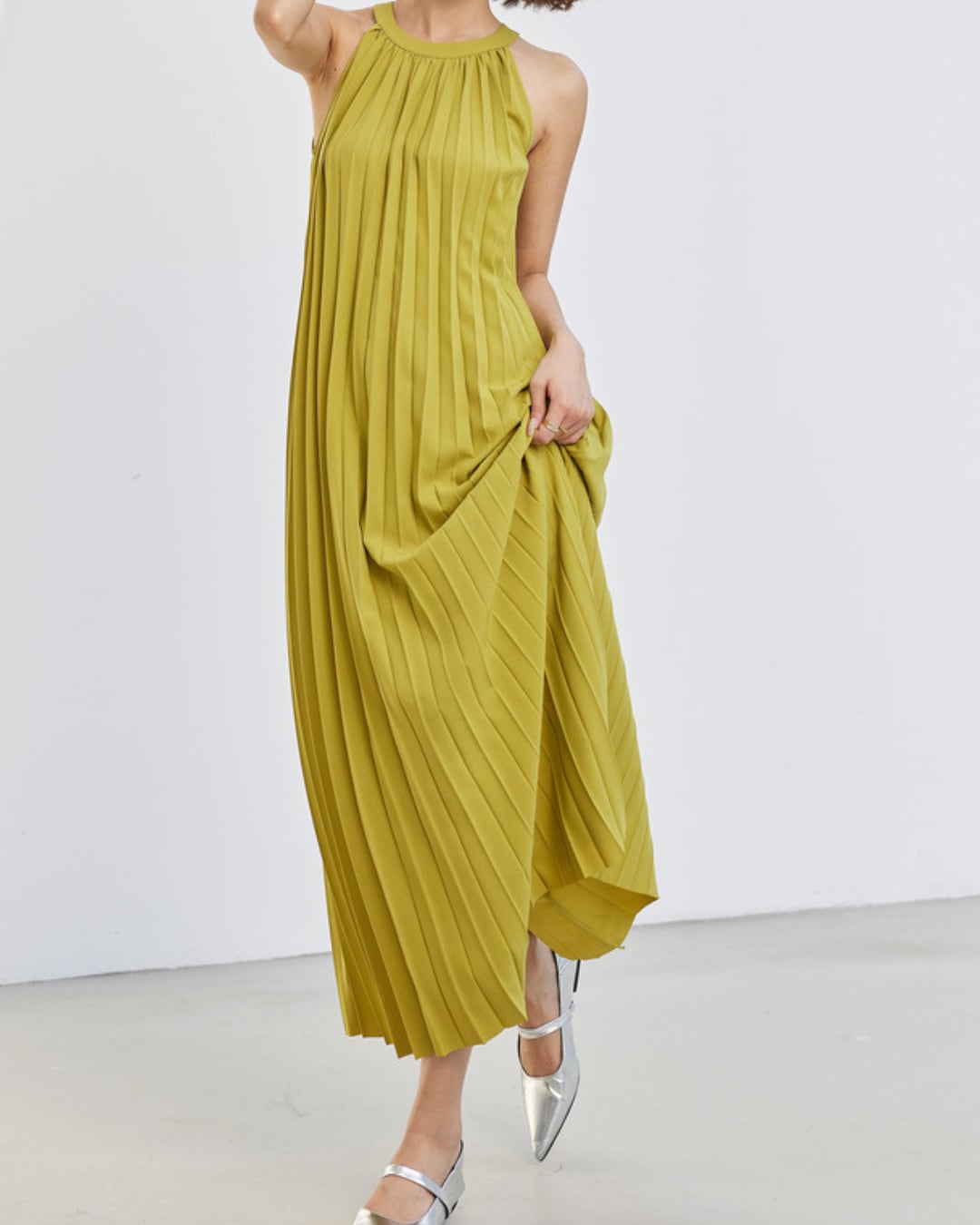 #プリーツ #ノースリーブ #ロングワンピース #夏コーデ #オリーブカラー #体型カバー #フェミニンスタイル