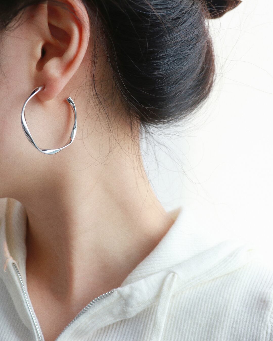 柔らかくひねったフォルムが印象的なフープイヤリング。上品なツヤ感と繊細なカーブラインが、大人の耳元を華やかに演出します。金属アレルギー対応のシルバーピン付きで、見た目にも着け心地にもこだわったアイテム。シルバーとゴールドの2色展開。