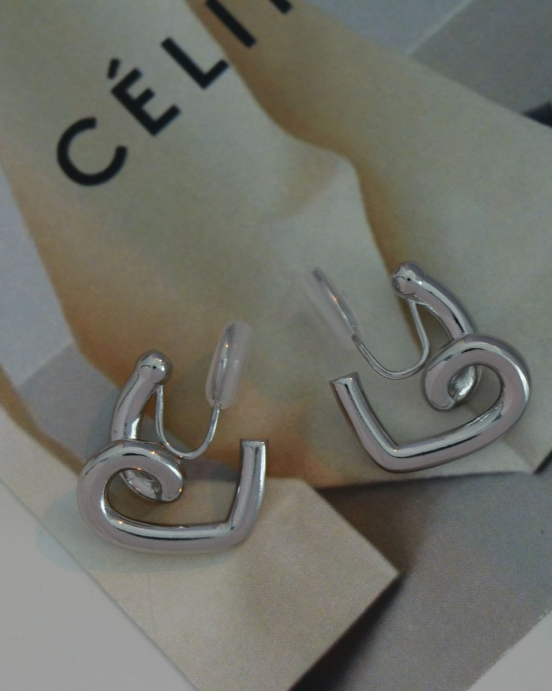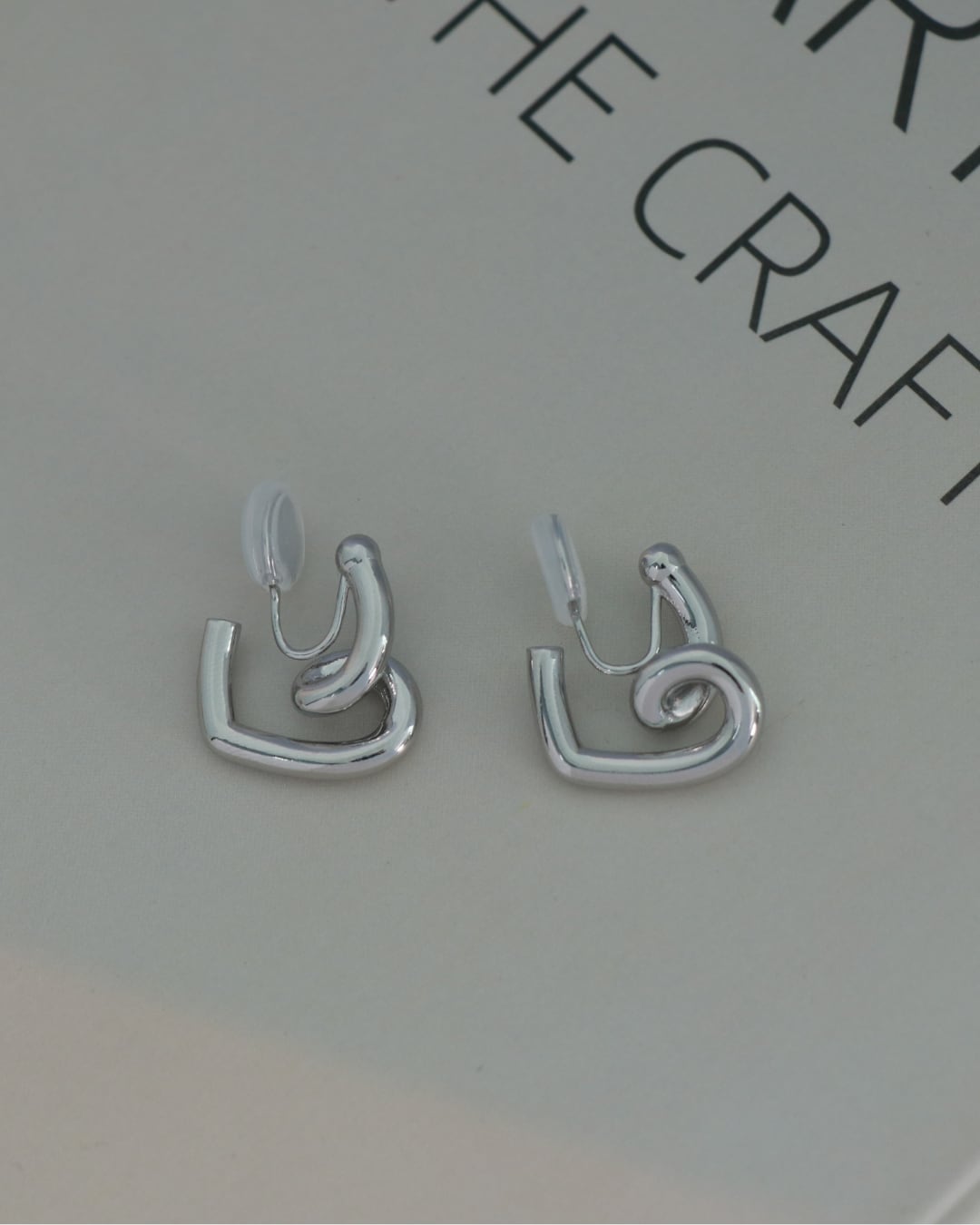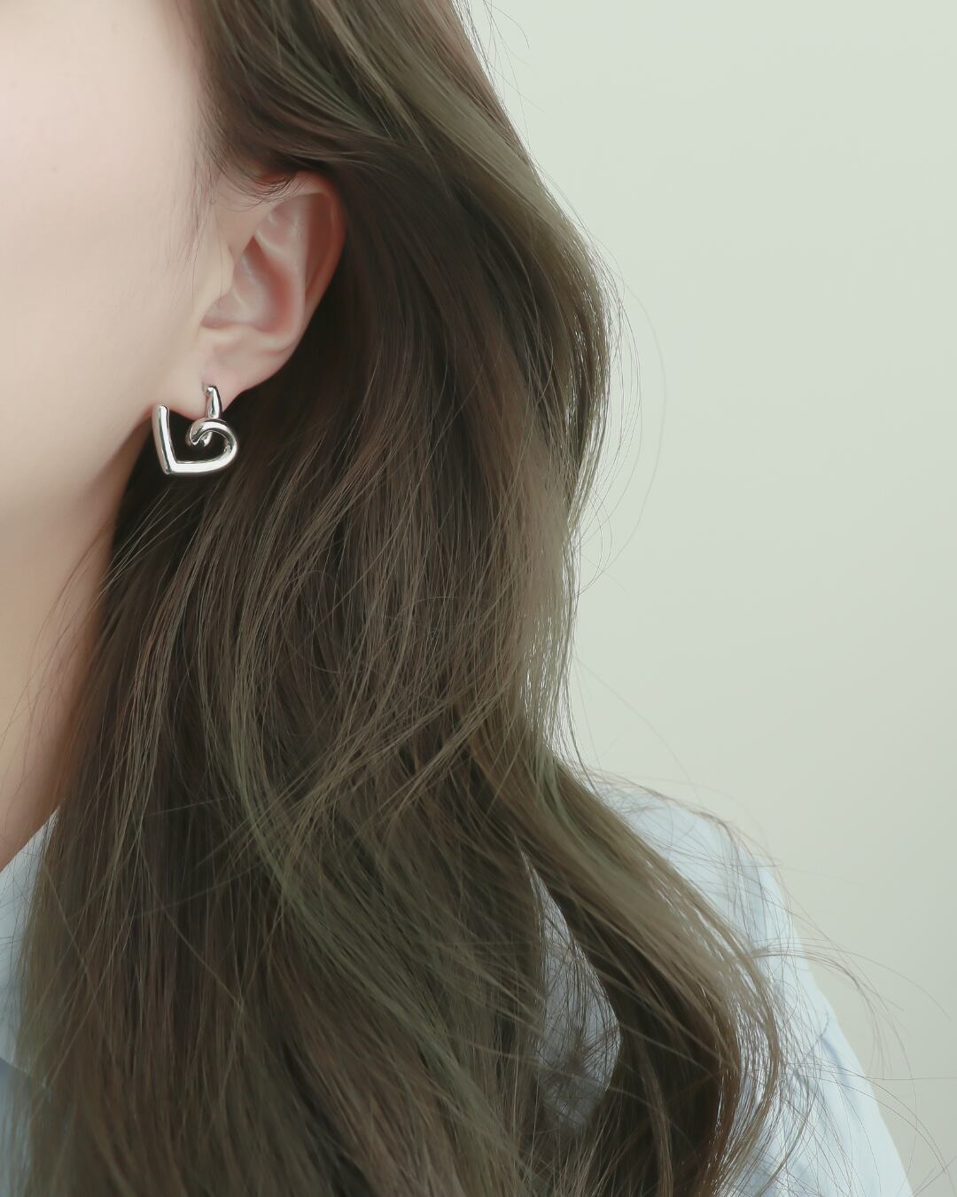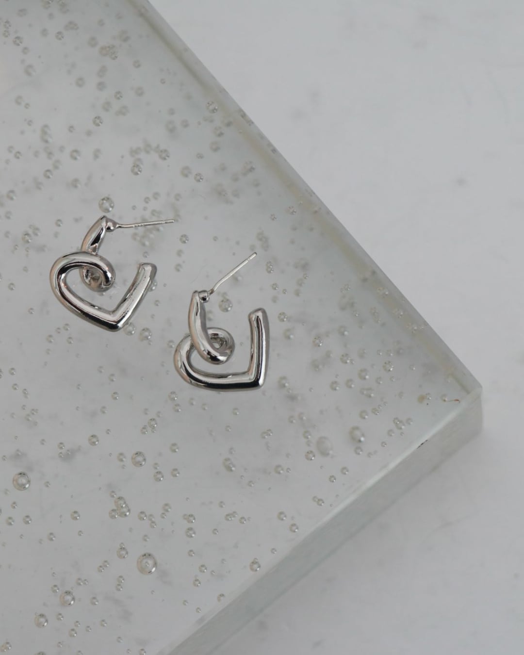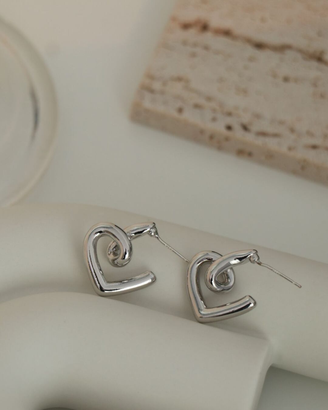 立体的にひねられたシルエットが印象的なハートモチーフピアス。柔らかなフォルムとクールなシルバーカラーで、甘さと上品さを兼ね備えたデザイン。カジュアルにもきれいめにもマッチする万能アイテムです。