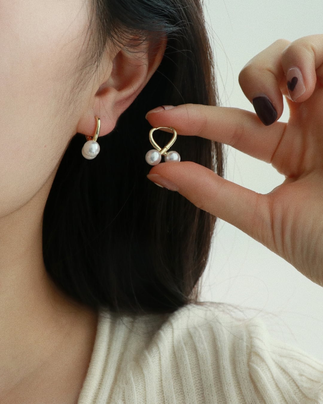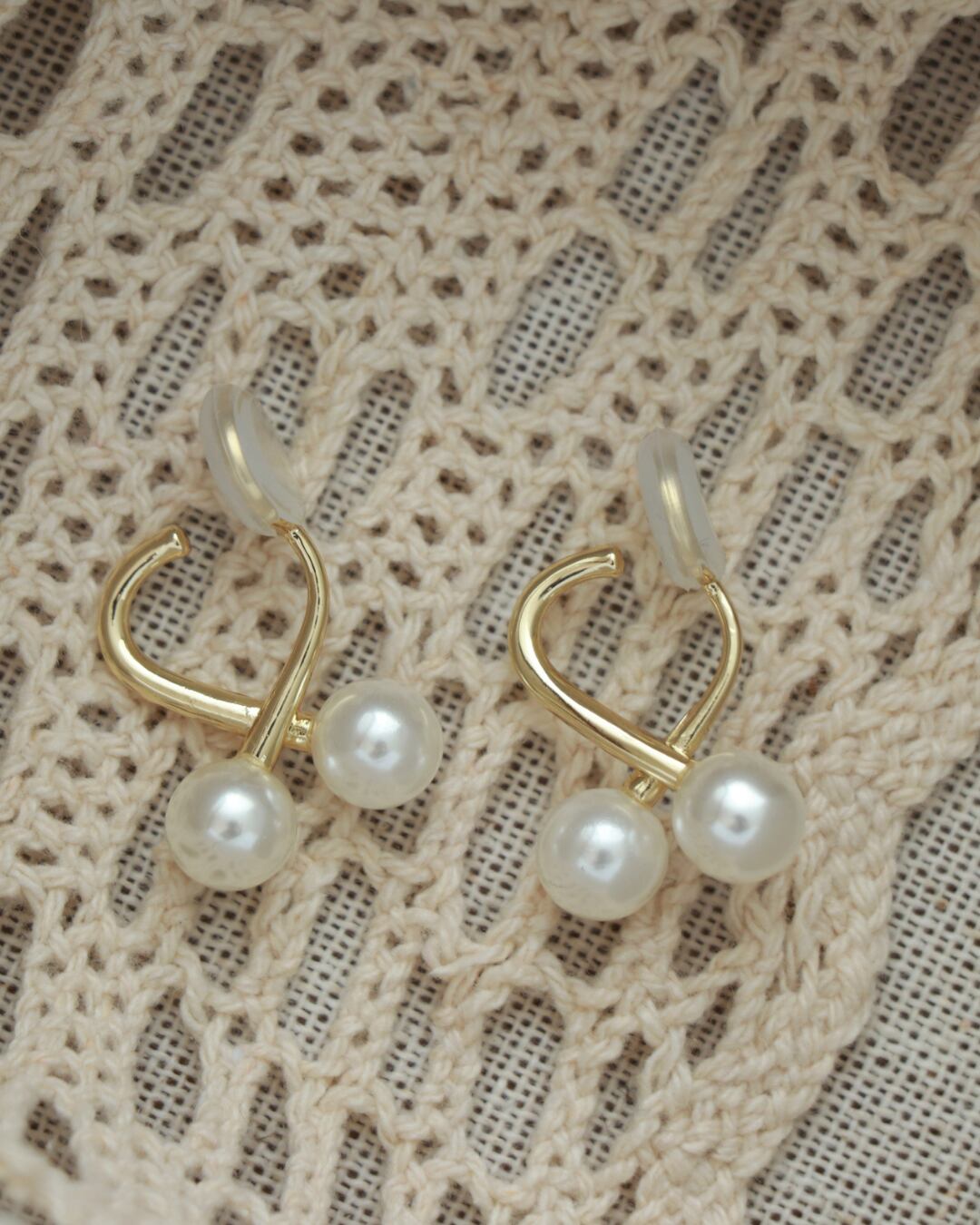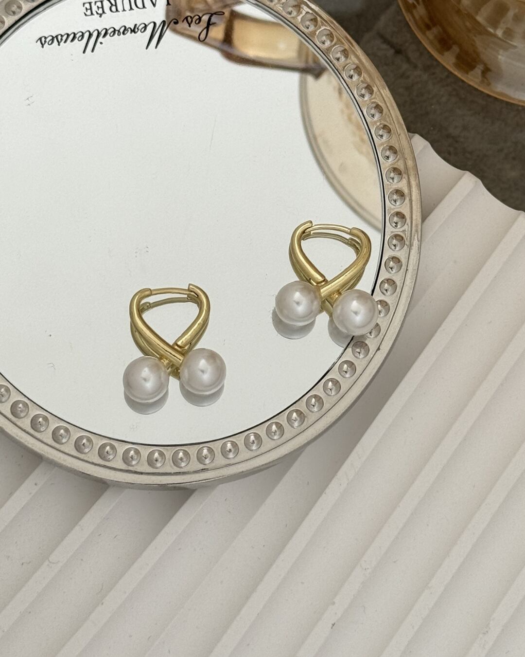 上品な艶を放つパールが2粒並んだ、印象的なデザインのフックピアス。ゴールドのメタルラインが耳元で美しく交差し、優雅で洗練された雰囲気を演出します。普段使いはもちろん、特別な日の装いにもおすすめの大人アクセです。