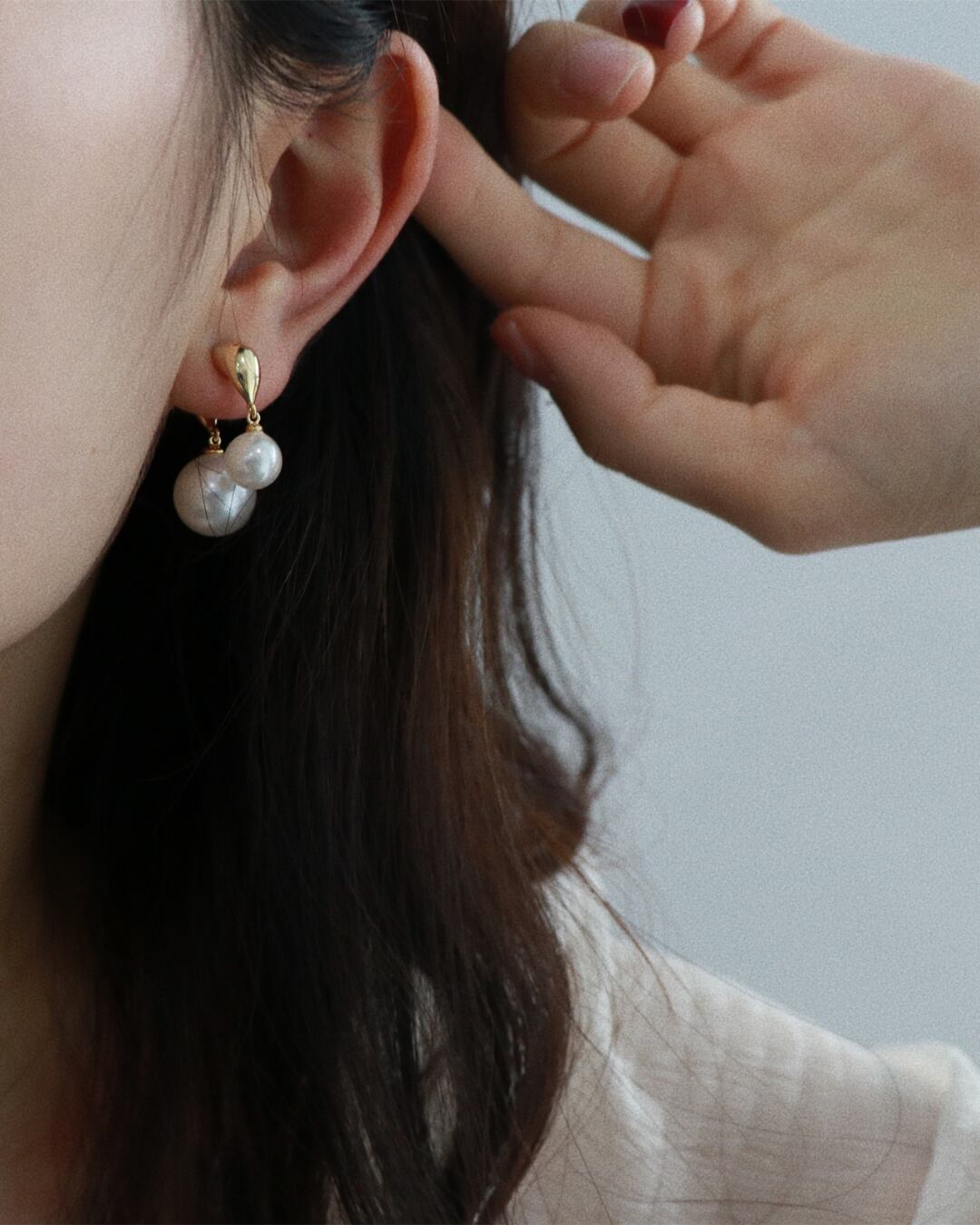 上質な光沢を放つ大小2粒のパールが揺れる、上品なドロップピアス。丸みのあるメタルパーツとパールの組み合わせが、柔らかな印象を引き立て、洗練された横顔を演出します。華やかさと落ち着きを兼ね備えたデザインは、フォーマルから普段使いまで幅広く活躍してくれます。