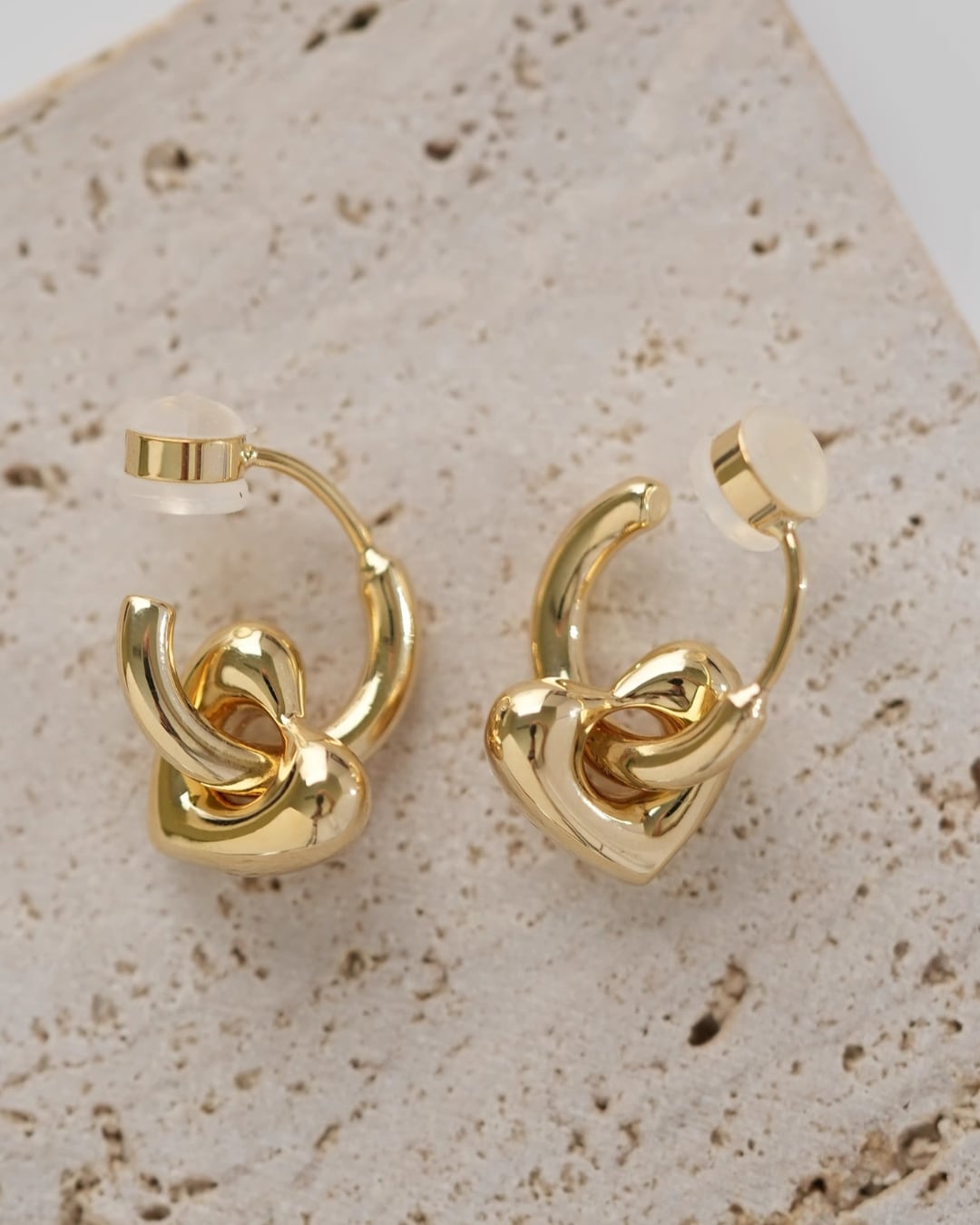 立体感のあるメタルハートチャームが揺れる、ボリューム感のあるフープピアス。ツヤのあるメッキ仕上げで、モードにもフェミニンにもマッチするデザイン。カジュアルなデイリースタイルにも、華やかさを添えるアクセントとしておすすめのアイテムです。