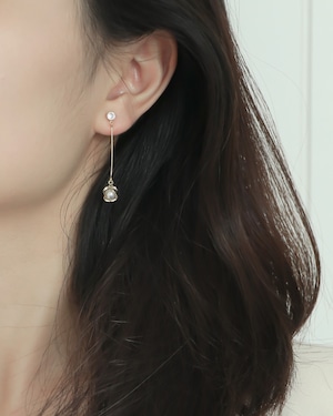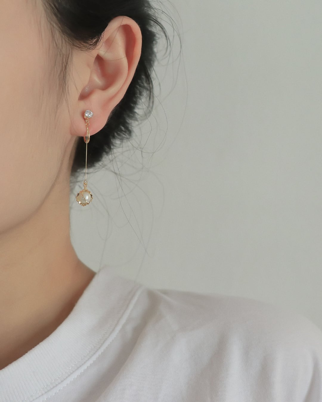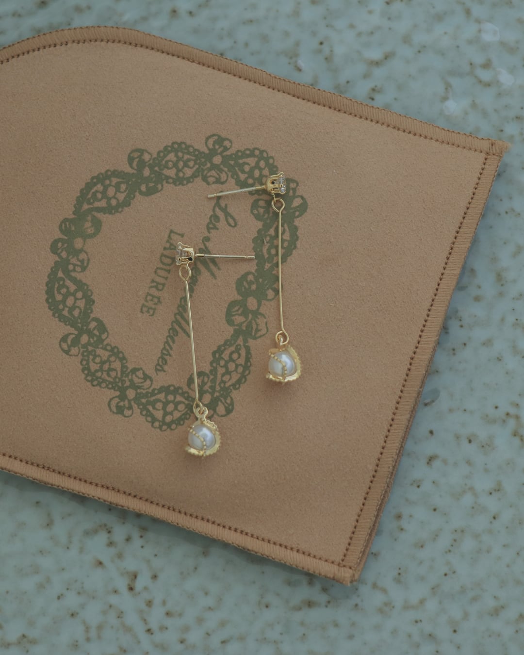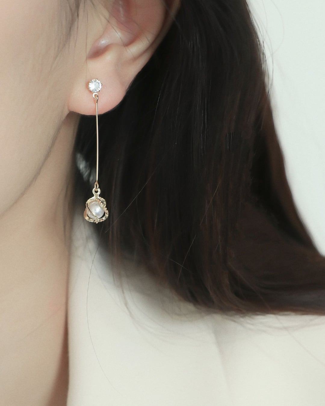 華奢なロングバーの先にあしらわれたパールが耳元で優雅に揺れる上品なピアス。繊細なフレームに包まれた淡水パールが、フェミニンさと洗練された印象を演出します。シンプルながらも存在感があり、デイリーからフォーマルまで幅広いスタイルにマッチします。