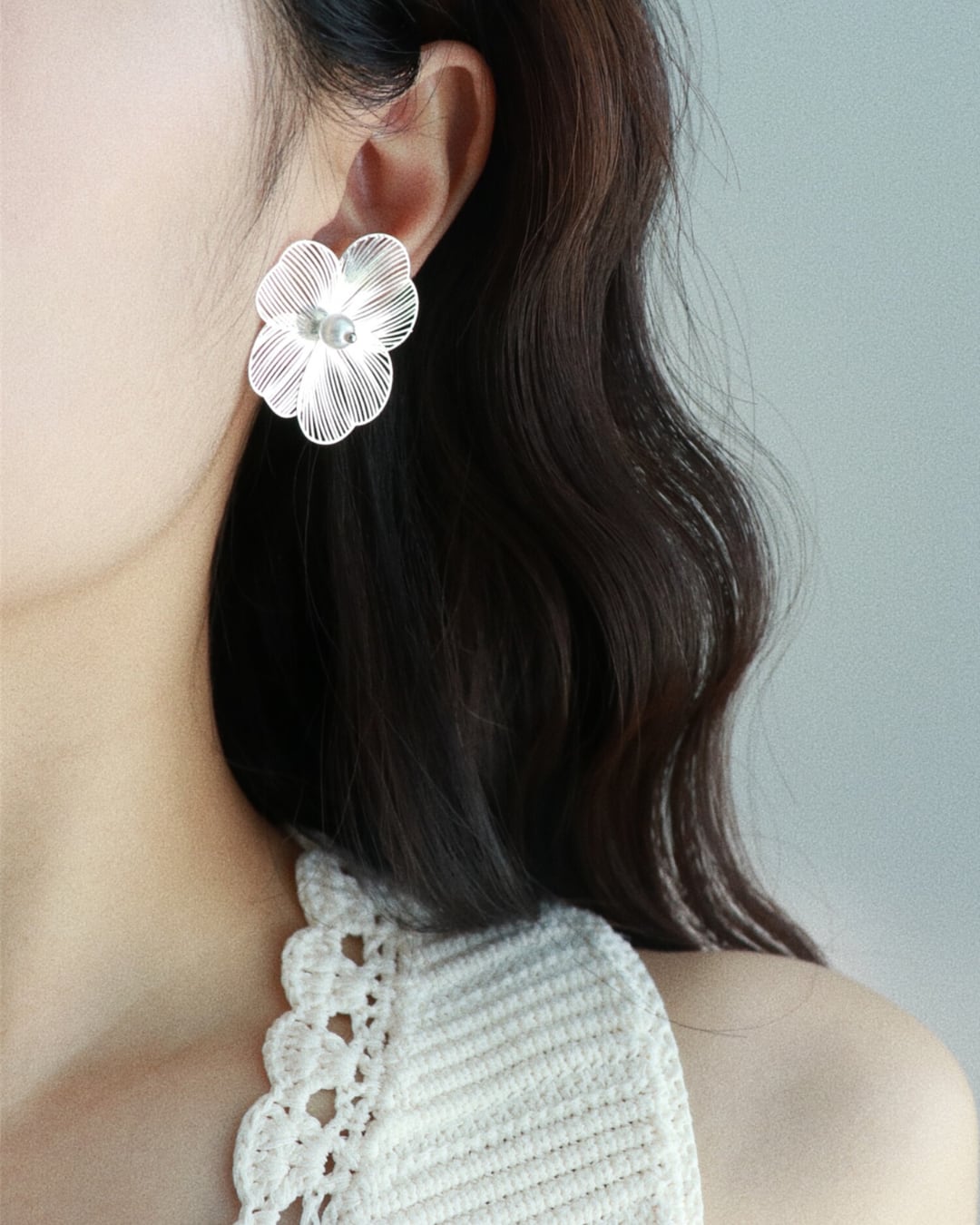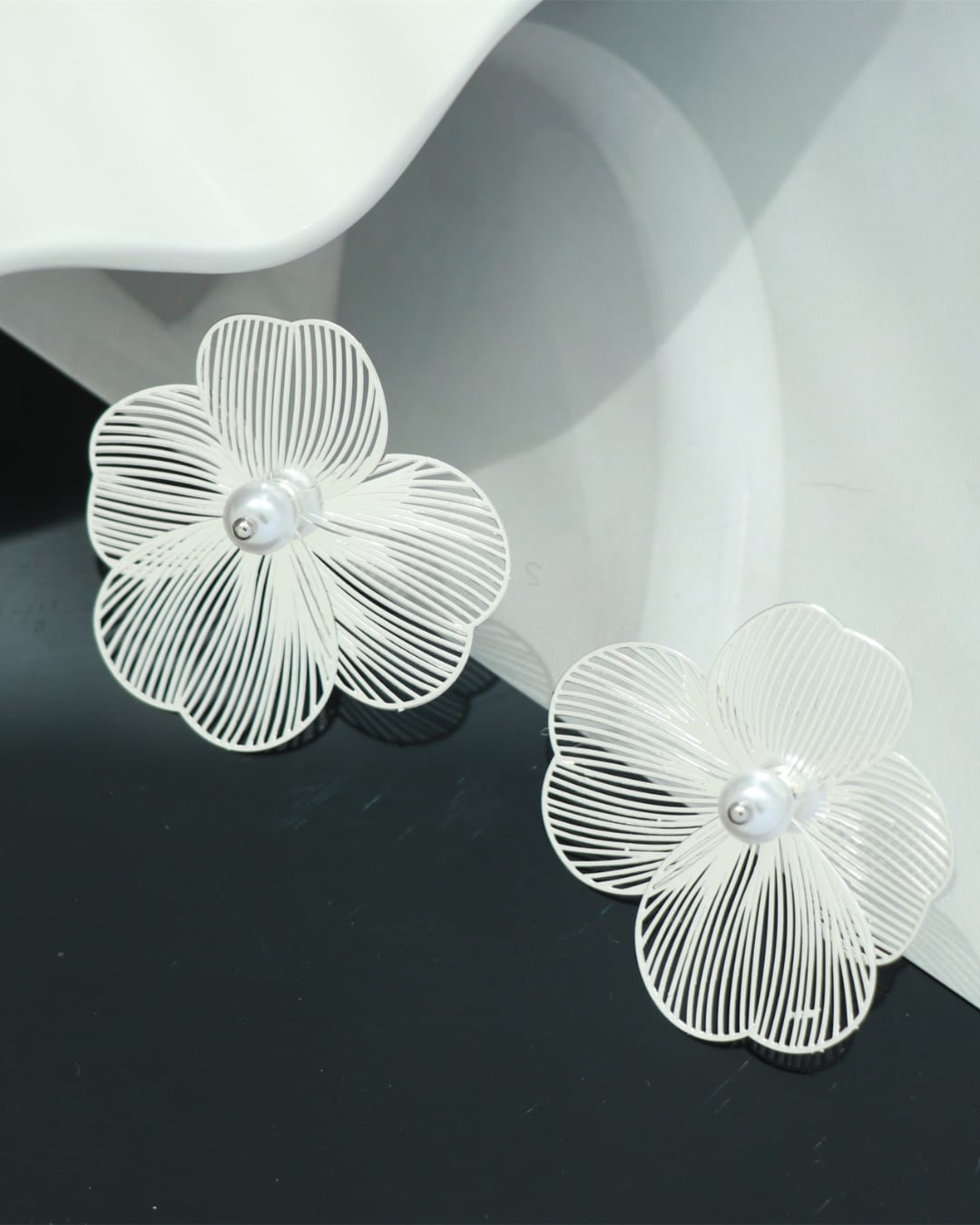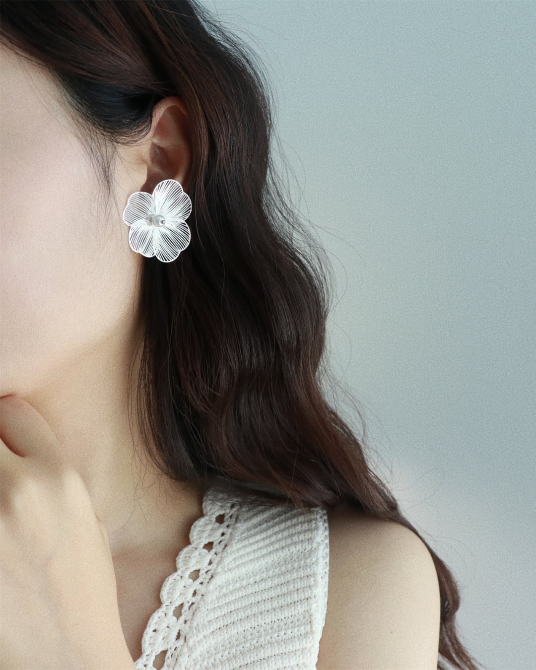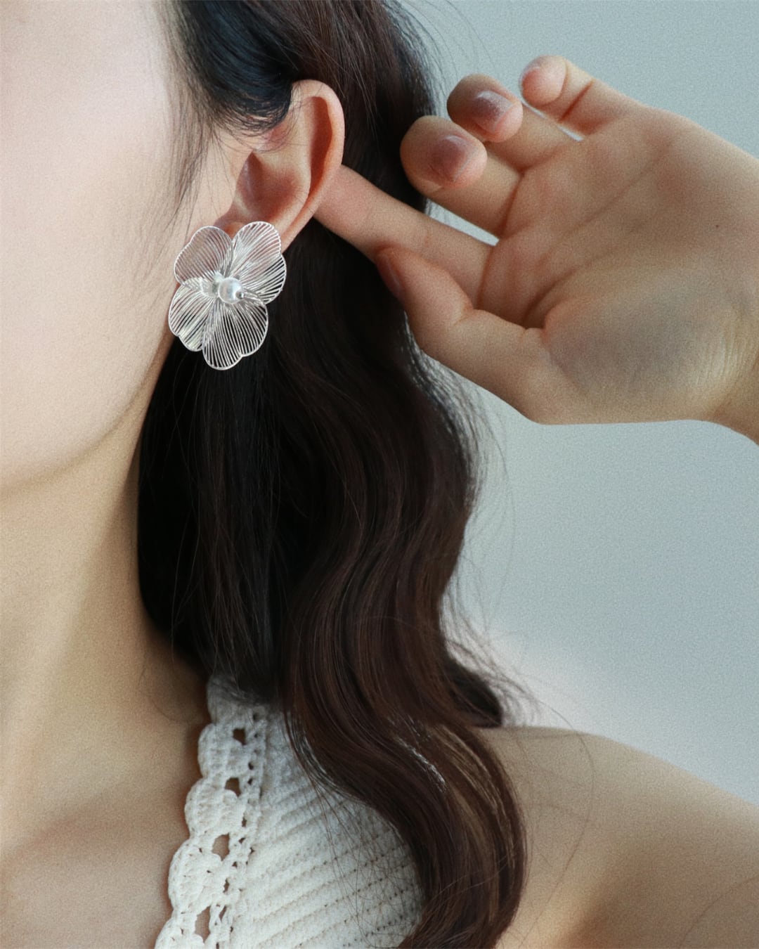 繊細な透かしデザインが目を惹く、大ぶりフラワーモチーフのピアス。中心にあしらわれたパールが上品なアクセントに。軽やかな印象でありながら存在感があり、コーディネートに華やかさをプラスします。カジュアルからドレススタイルまで幅広く活躍する一品です。