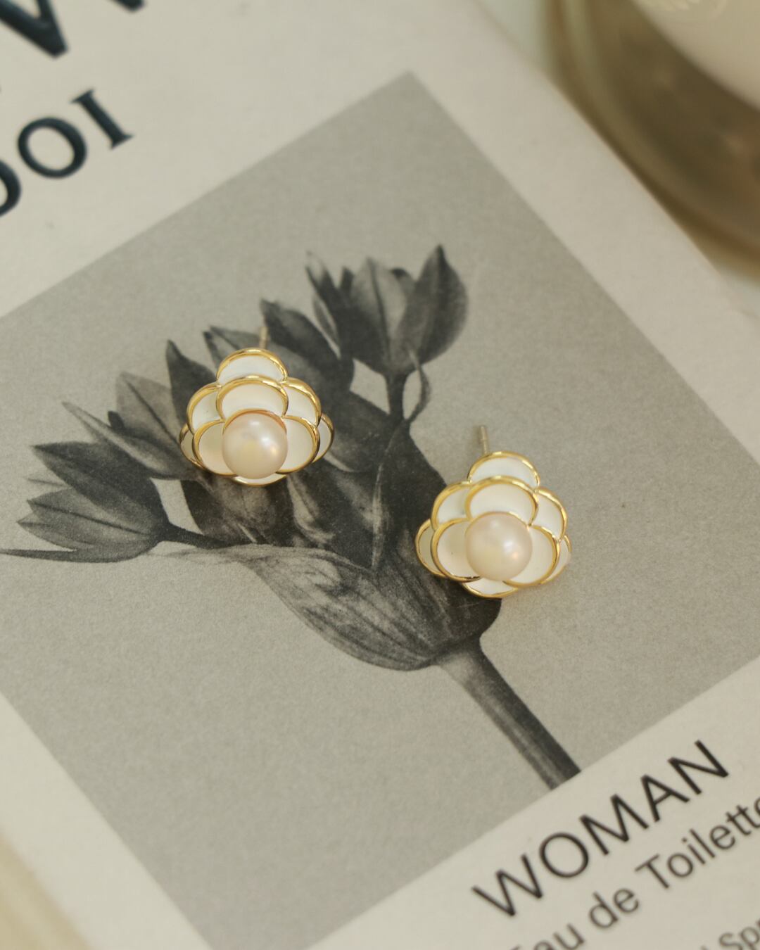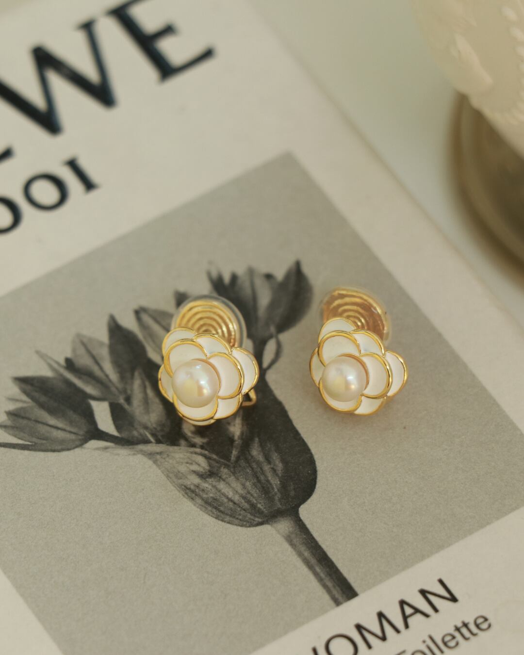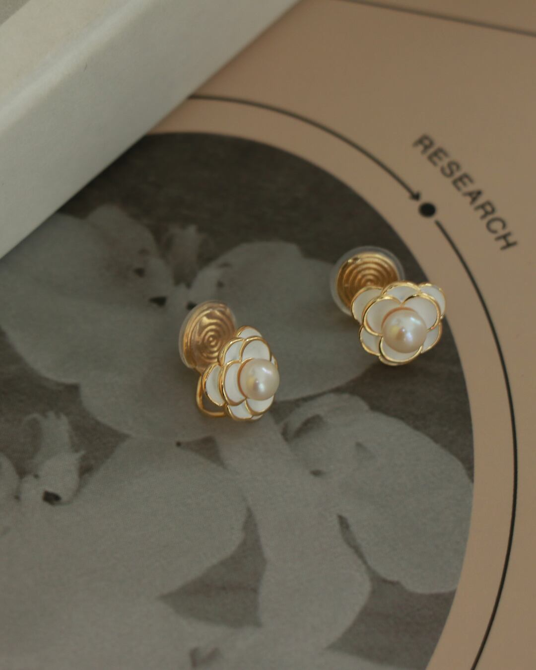上品な光沢感が魅力の、パール調の花びらをあしらったフラワーモチーフピアス。清楚で可憐な印象ながらも、ほどよい存在感があり、シンプルコーデのアクセントとしてもおすすめ。デイリーはもちろん、セレモニーや特別なシーンにもぴったりです。ピアス穴のない方でも着用できるイヤリングタイプもご用意しています。